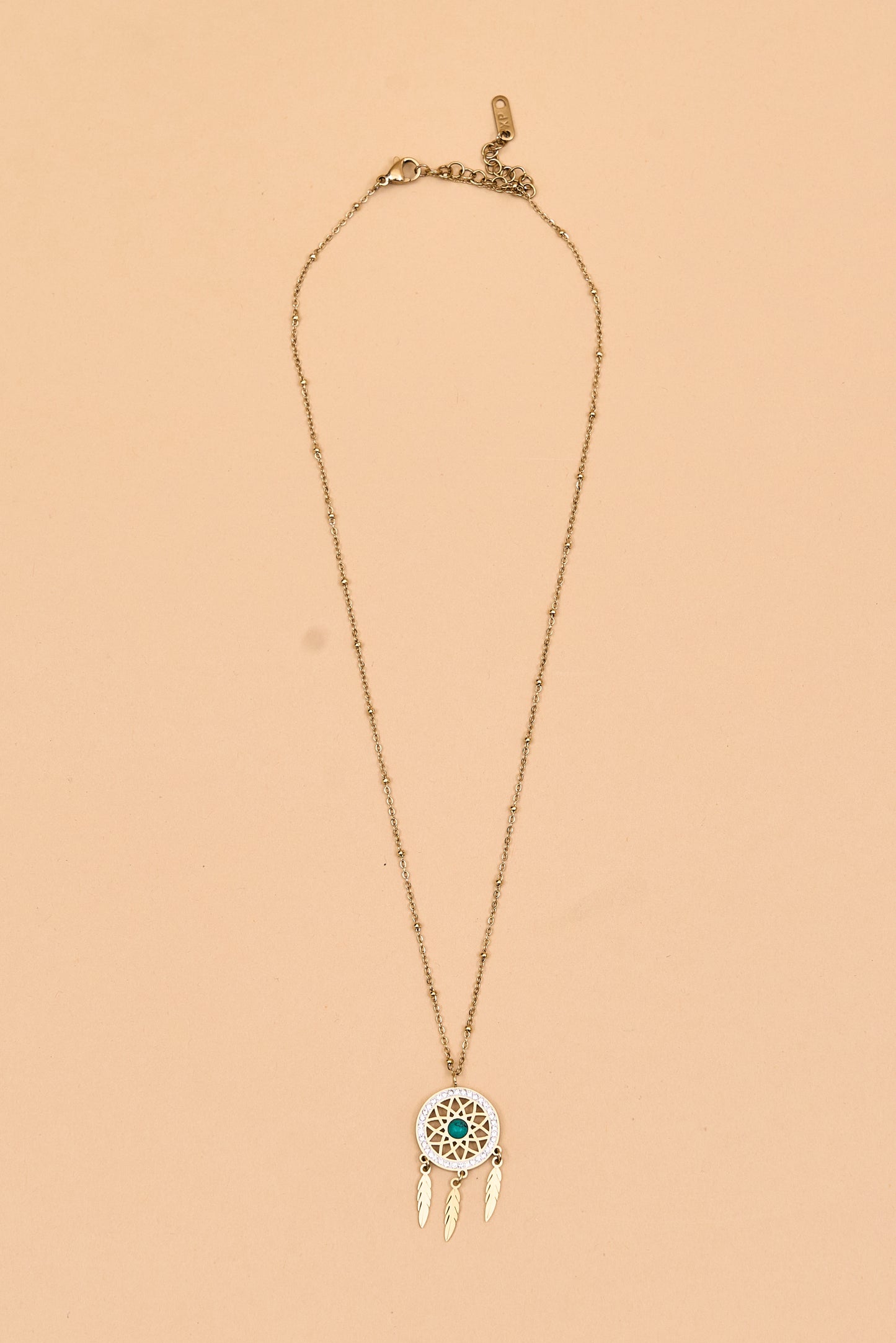 Regular price Rs. 480Exquisite gold-tone dreamcatcher necklace by Xuping, featuring intricate detailing, a vibrant turquoise centerpiece, and delicate feather charms that exude free-spirited charm and timeless allure.
