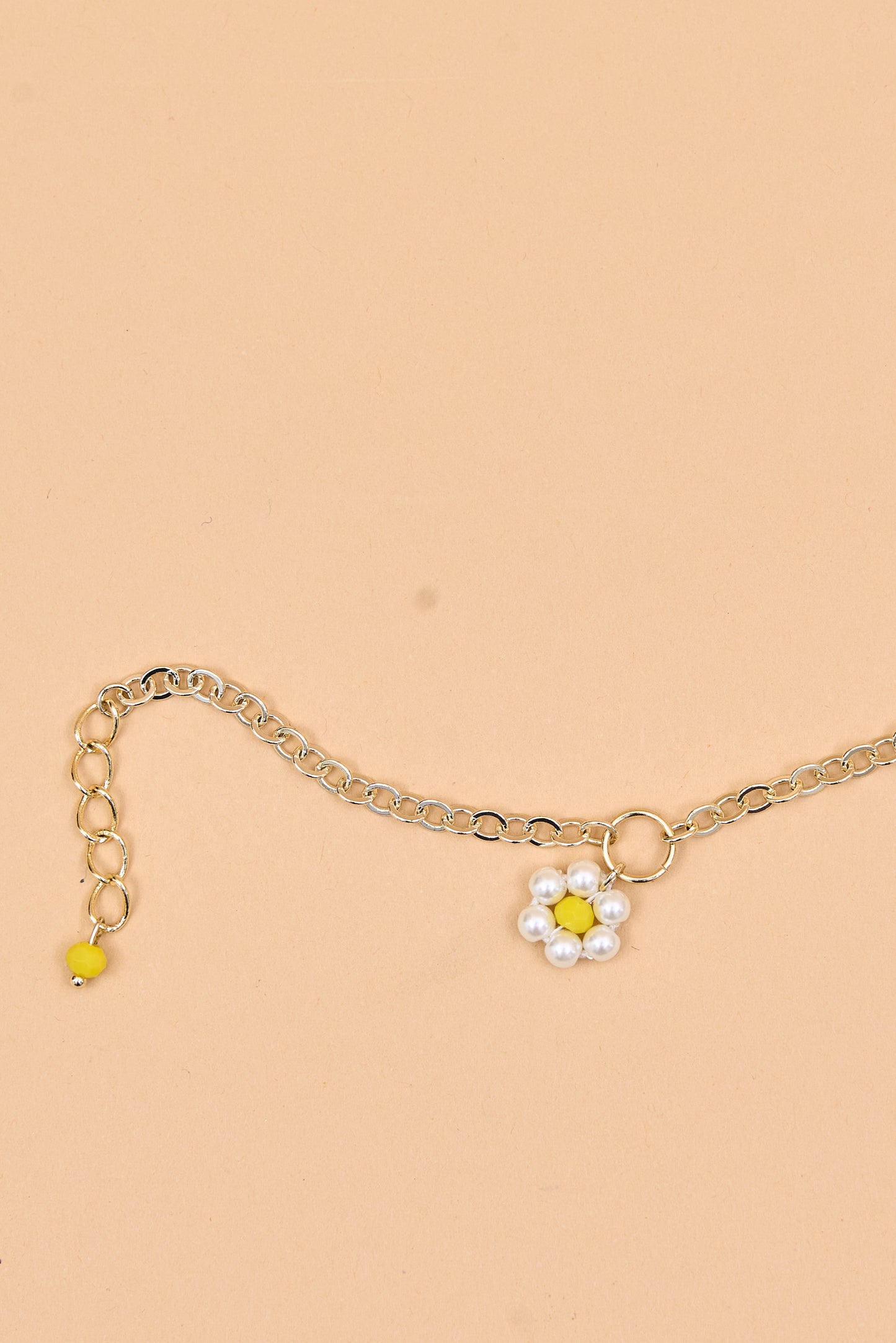 Regular price Rs. 480Simple gold chain bracelet with a cute daisy charm made of pearls and a yellow center. Sweet and delicate