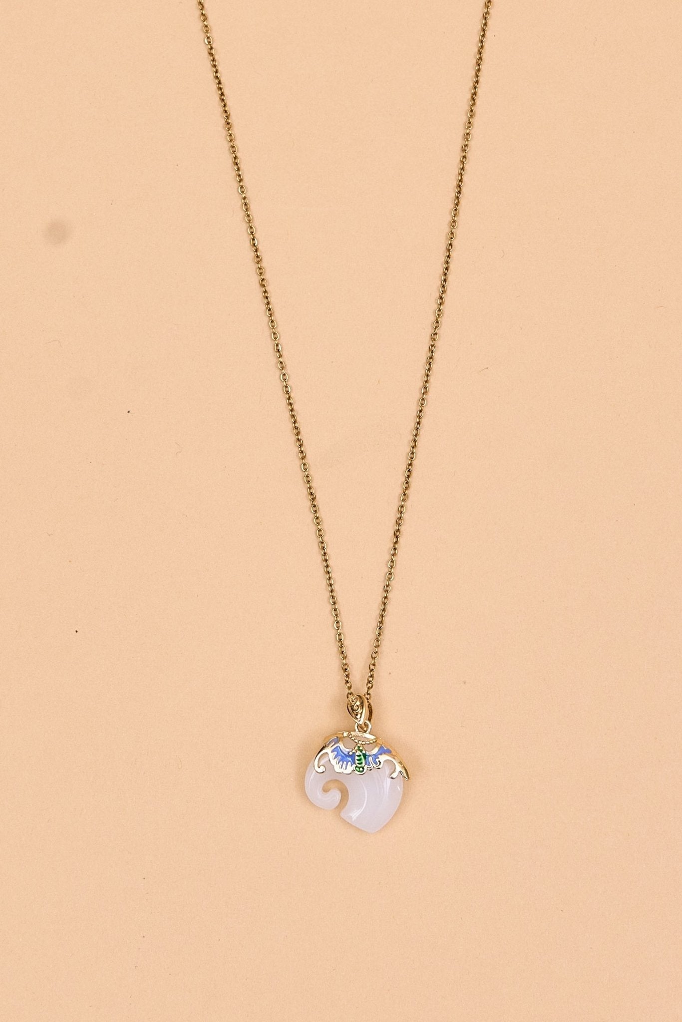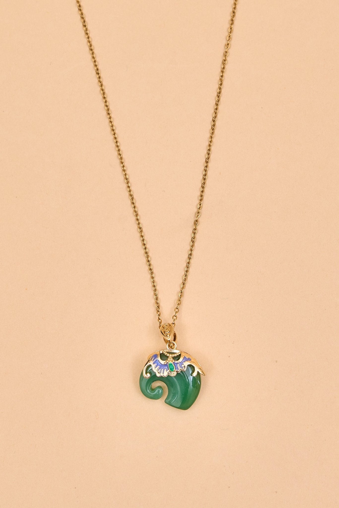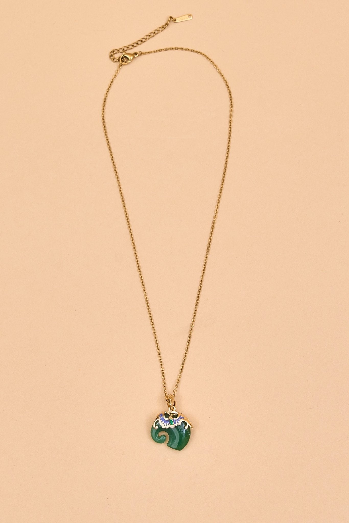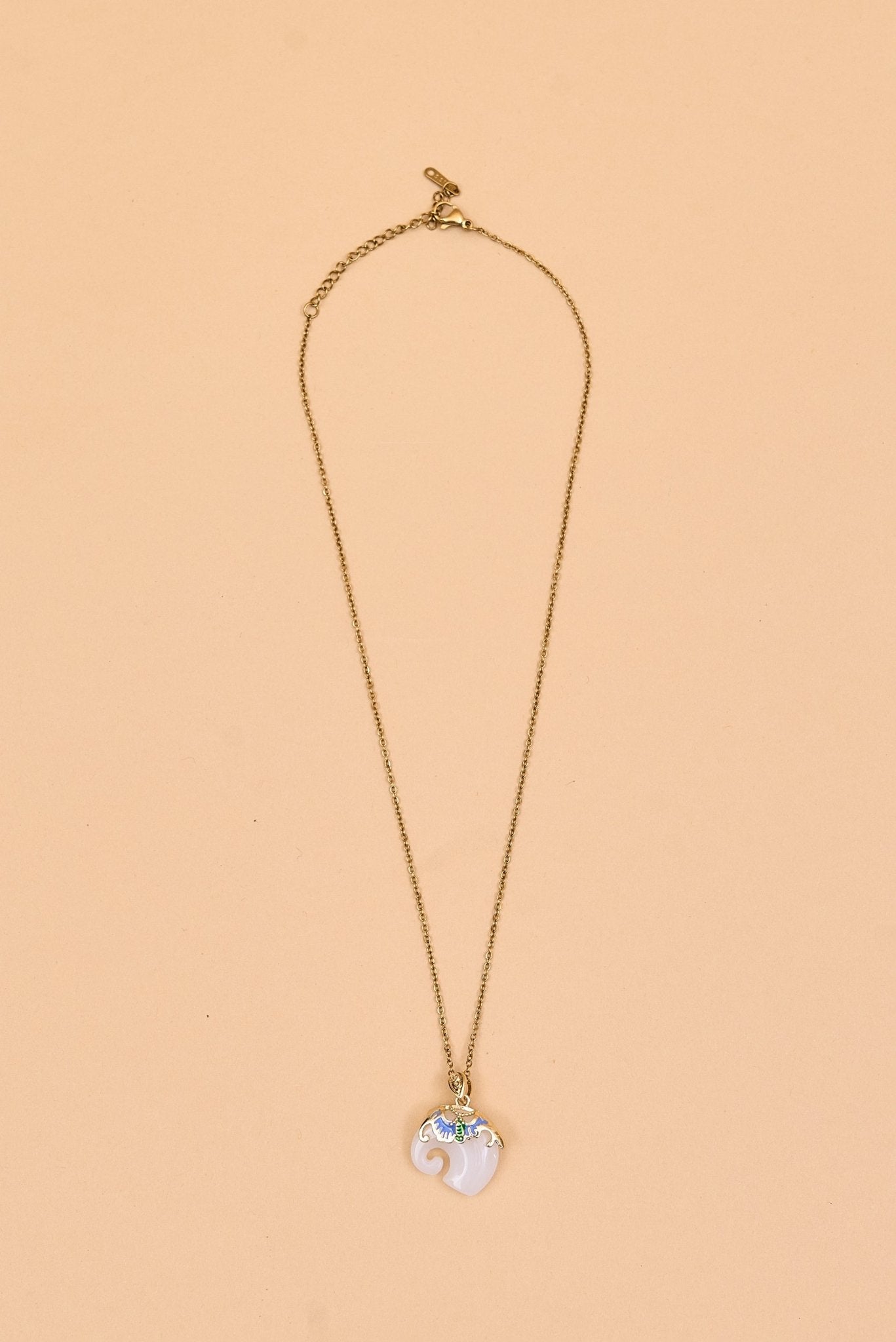 This elegant elephant necklace features a gold-toned chain with a unique pendant. The pendant is intricately shaped with smooth curves and adorned at the top with ornate gold detailing, highlighted by colorful accents. The combination of vibrant hues and rich textures gives it a luxurious, artisanal feel. Perfect as a statement piece, it blends traditional charm with contemporary elegance.