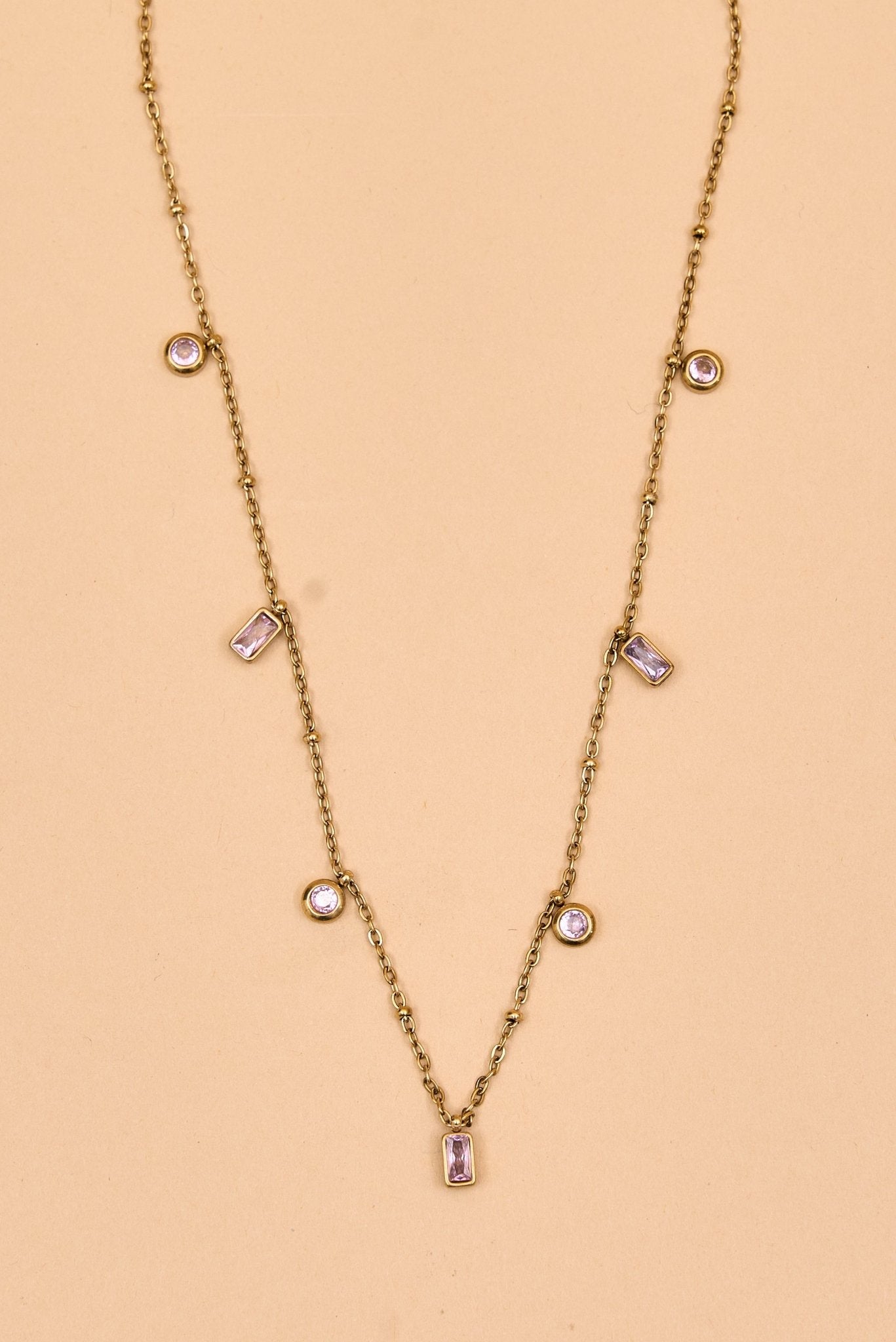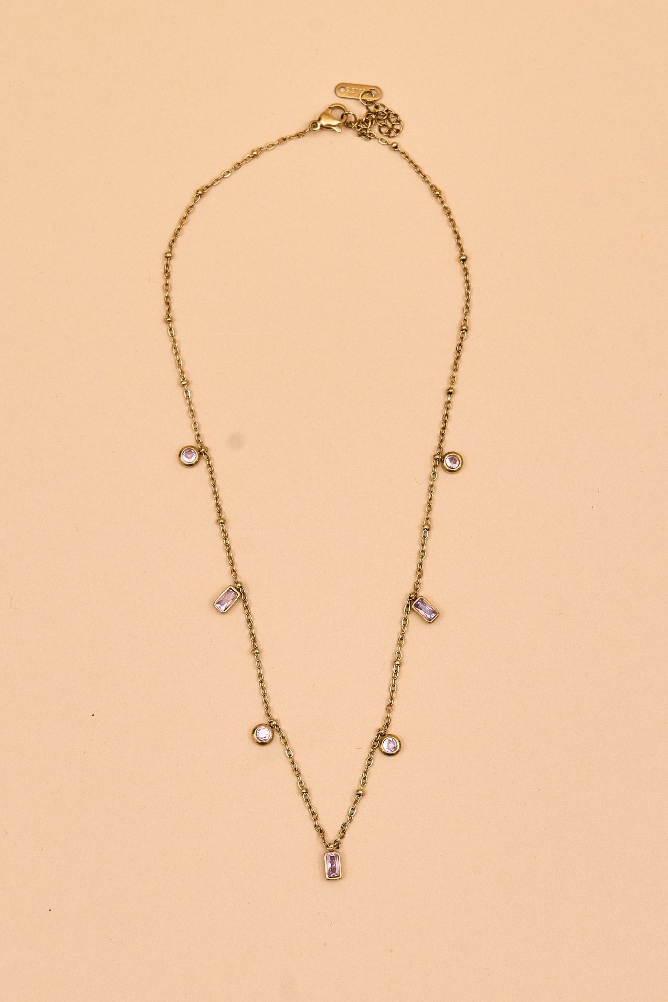 This delicate gold-toned chain features small, unique charms in varied geometric shapes, each adorned with a subtle crystal accent. The design alternates between open rectangular links and spiral motifs, creating a modern yet understated look. Lightweight and refined, itês perfect for everyday wear or layering for added style.