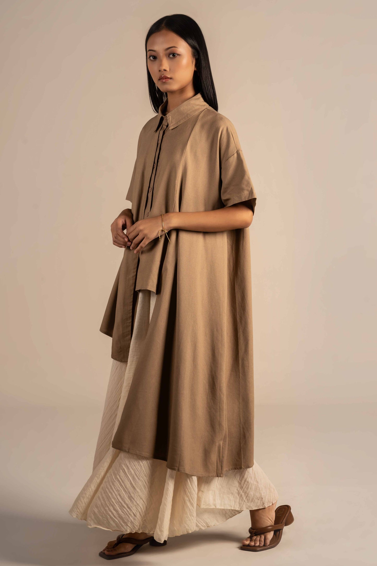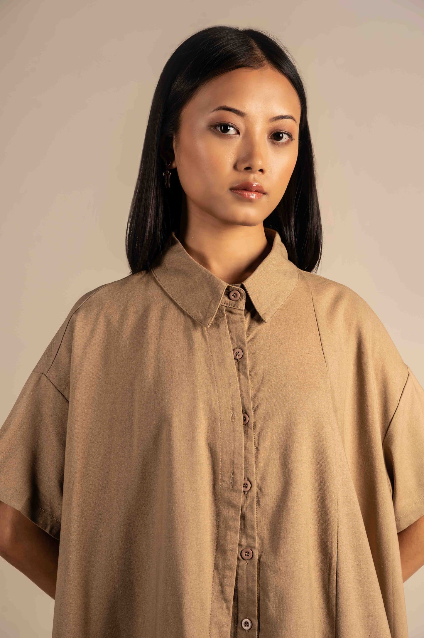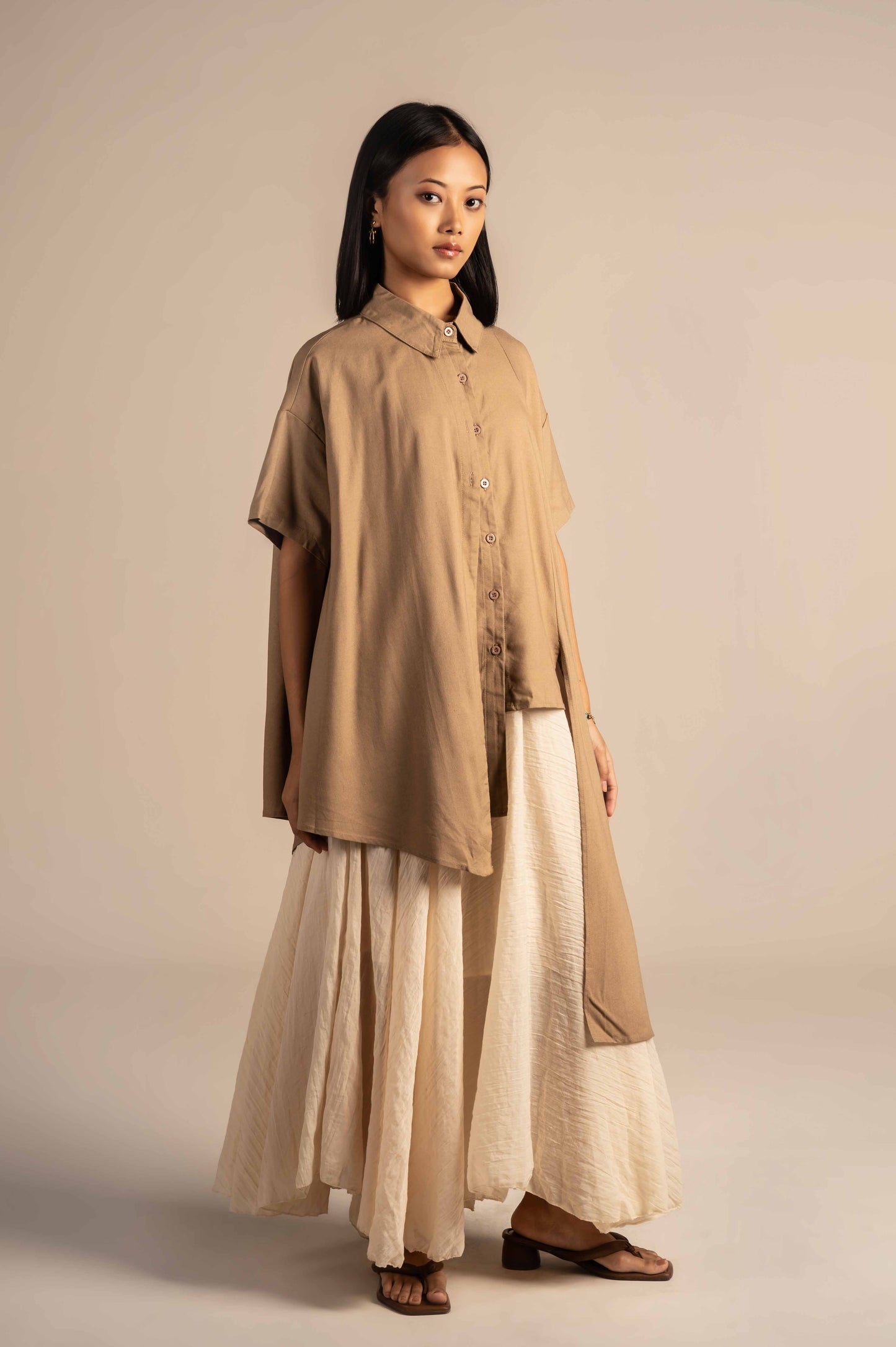 Asymmetric button-down shirt features a sharp collar and minimal design, making it a versatile staple for any wardrobe. Ideal for both casual and workwear, it offers effortless style with a polished touch.