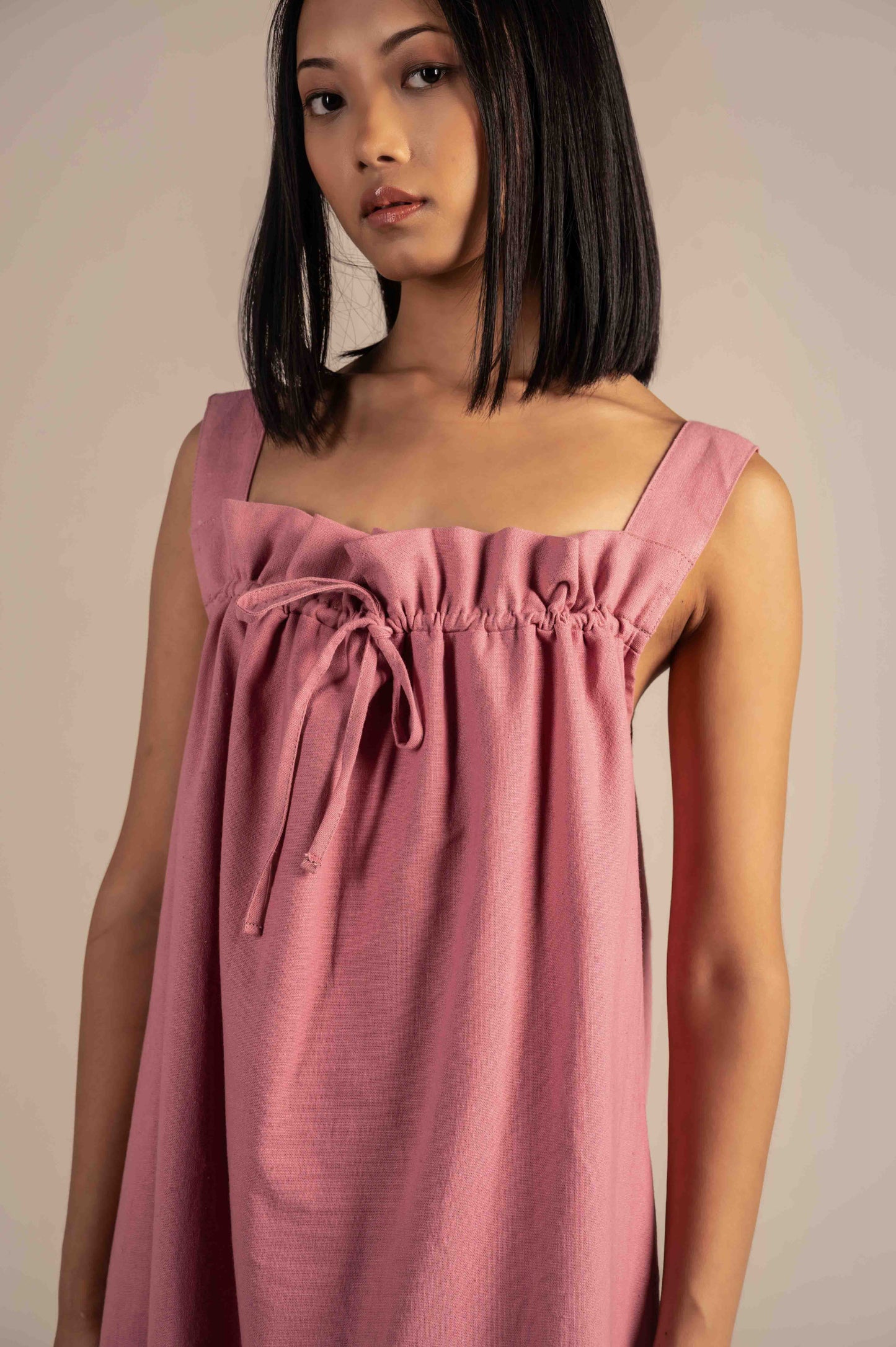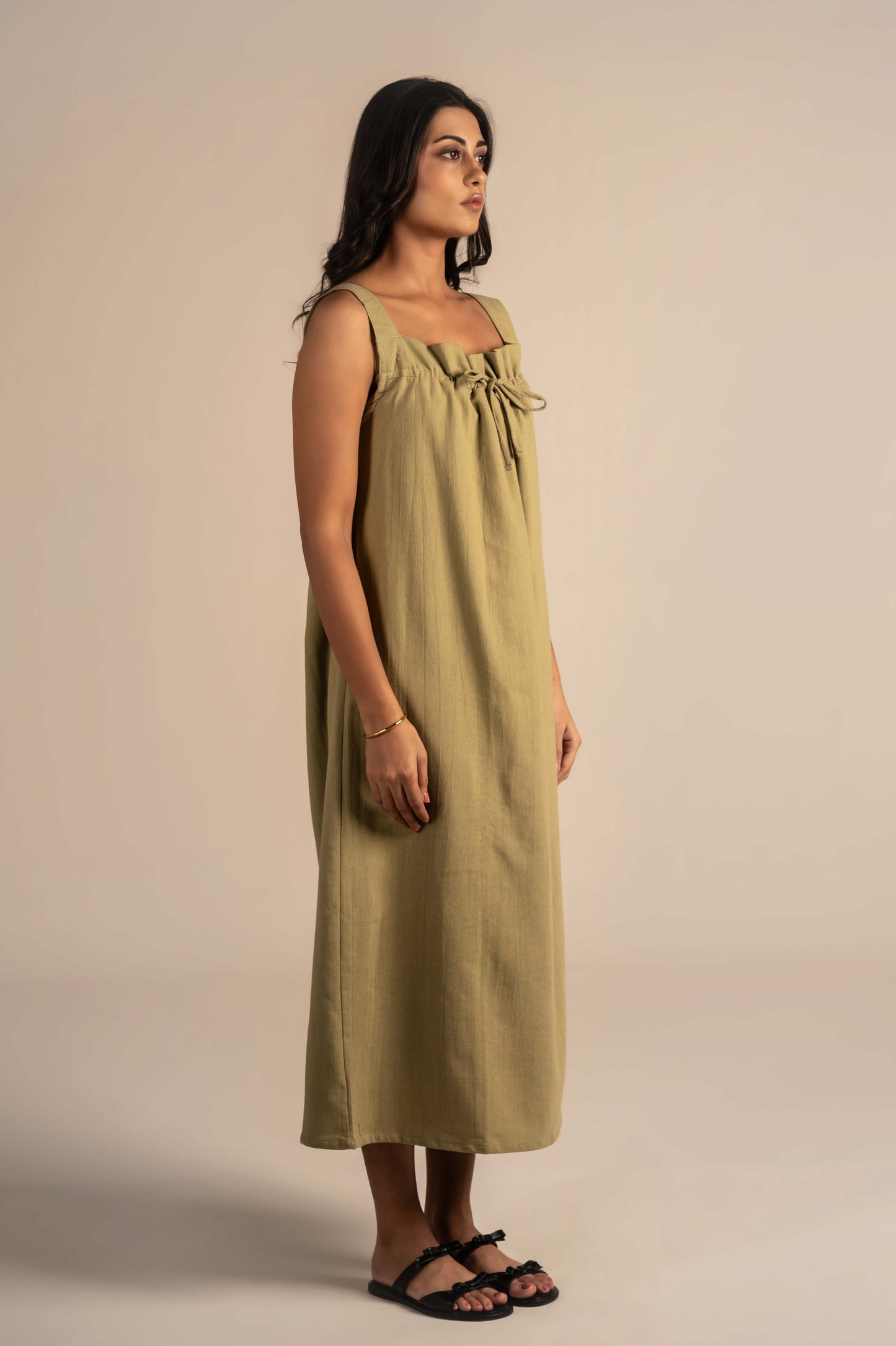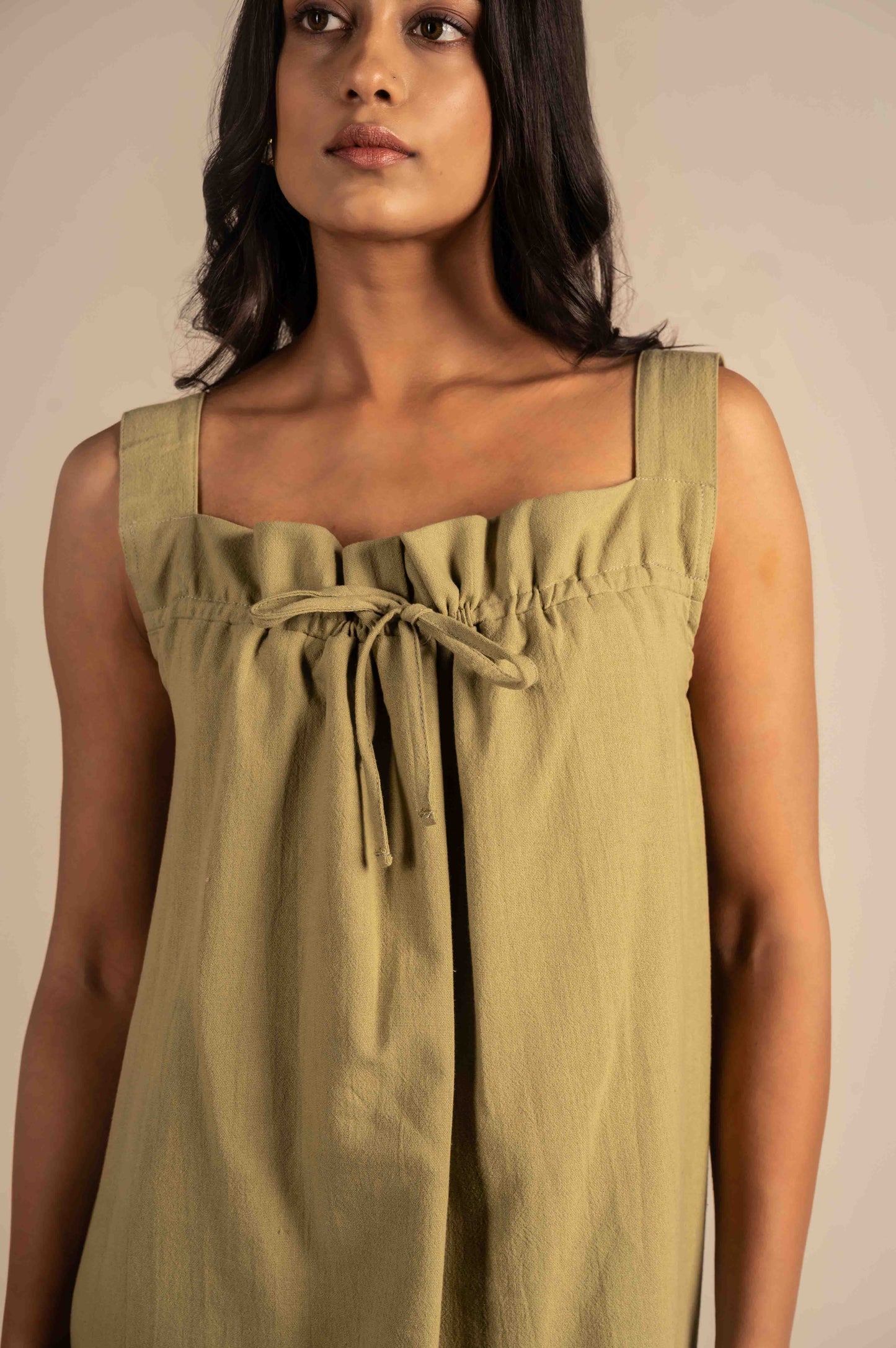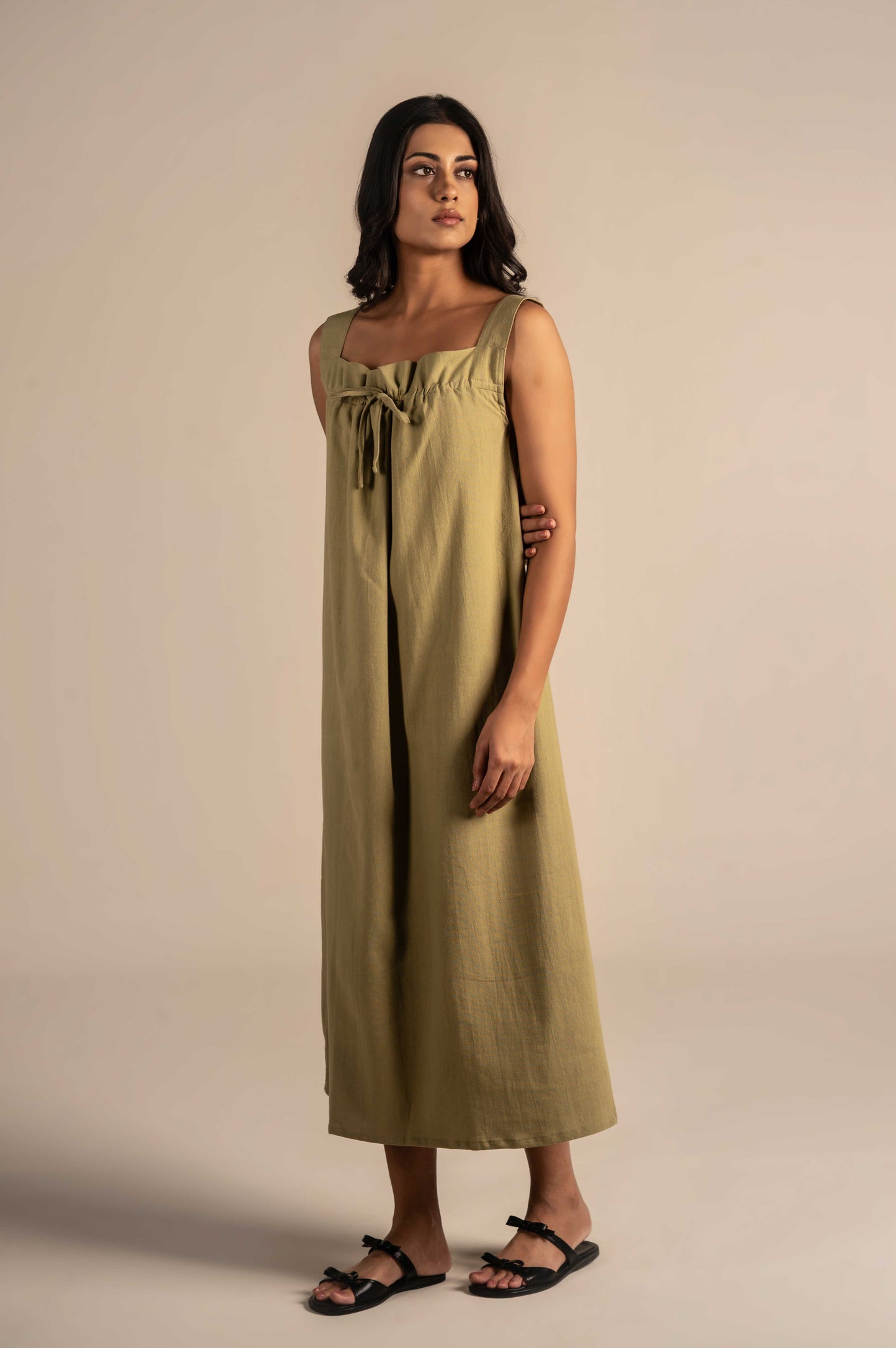 This pinafore-style dress features a straight, midi-length silhouette with a front patch pocket for a utilitarian touch. The adjustable shoulder straps tie at the front, allowing for a customized fit. Crafted from textured, breathable fabric, it offers both comfort and durability. Perfect for layering over tees or tops for a casual, laid-back look.