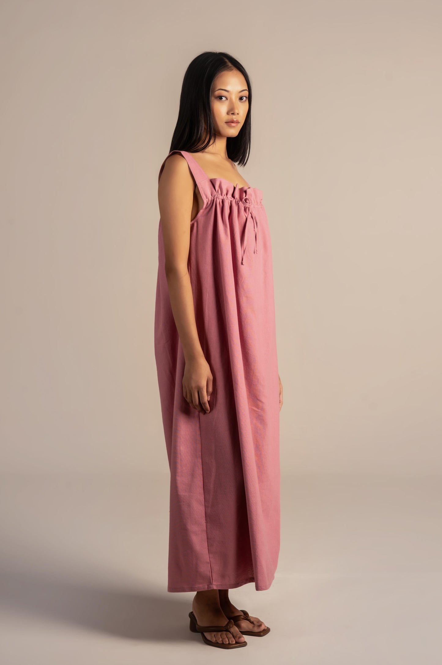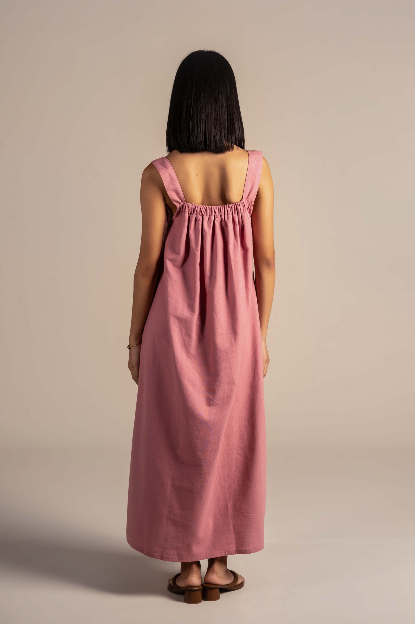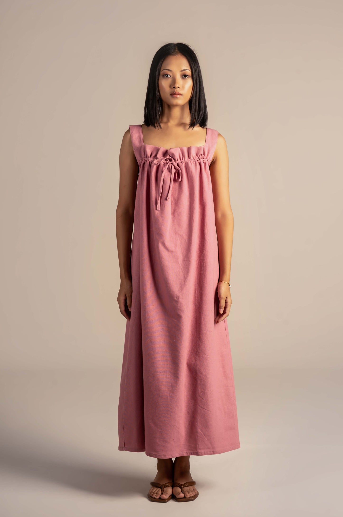This pinafore-style dress features a straight, midi-length silhouette with a front patch pocket for a utilitarian touch. The adjustable shoulder straps tie at the front, allowing for a customized fit. Crafted from textured, breathable fabric, it offers both comfort and durability. Perfect for layering over tees or tops for a casual, laid-back look.