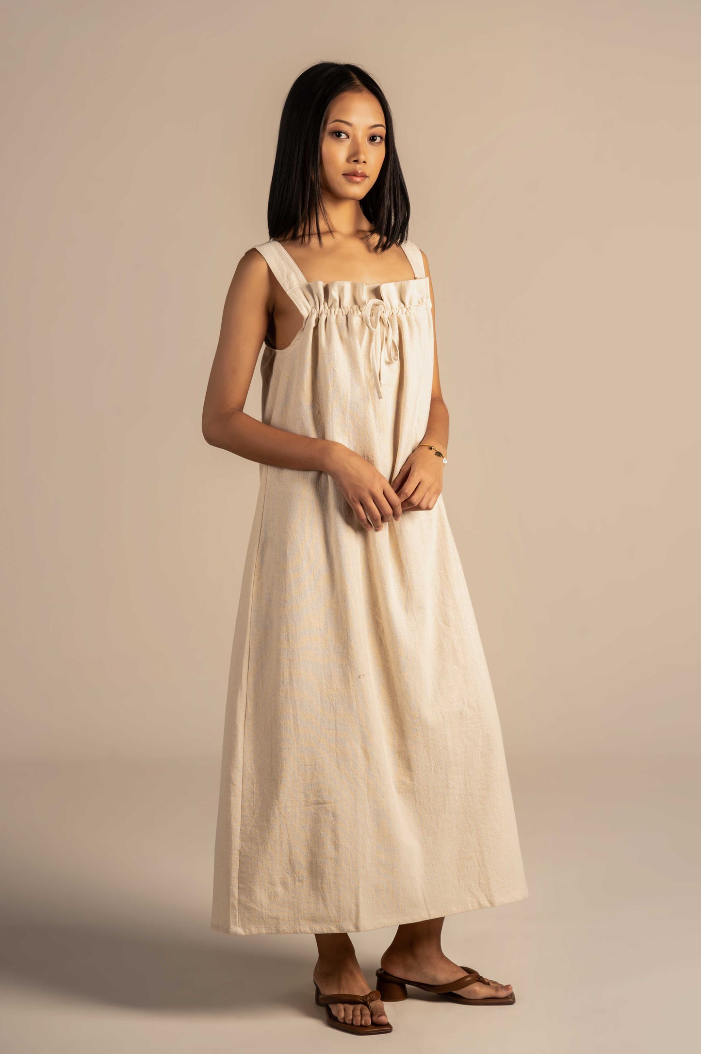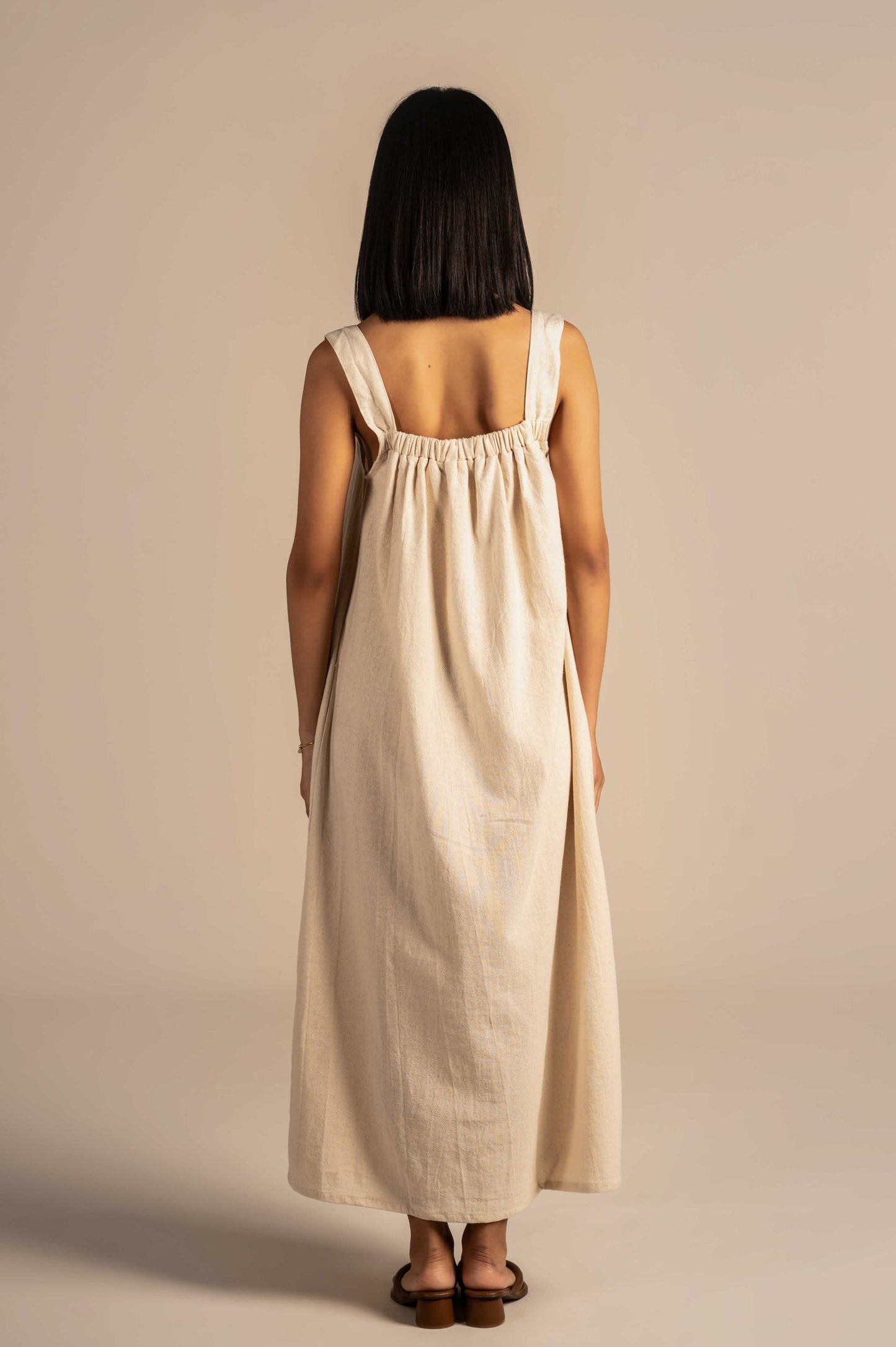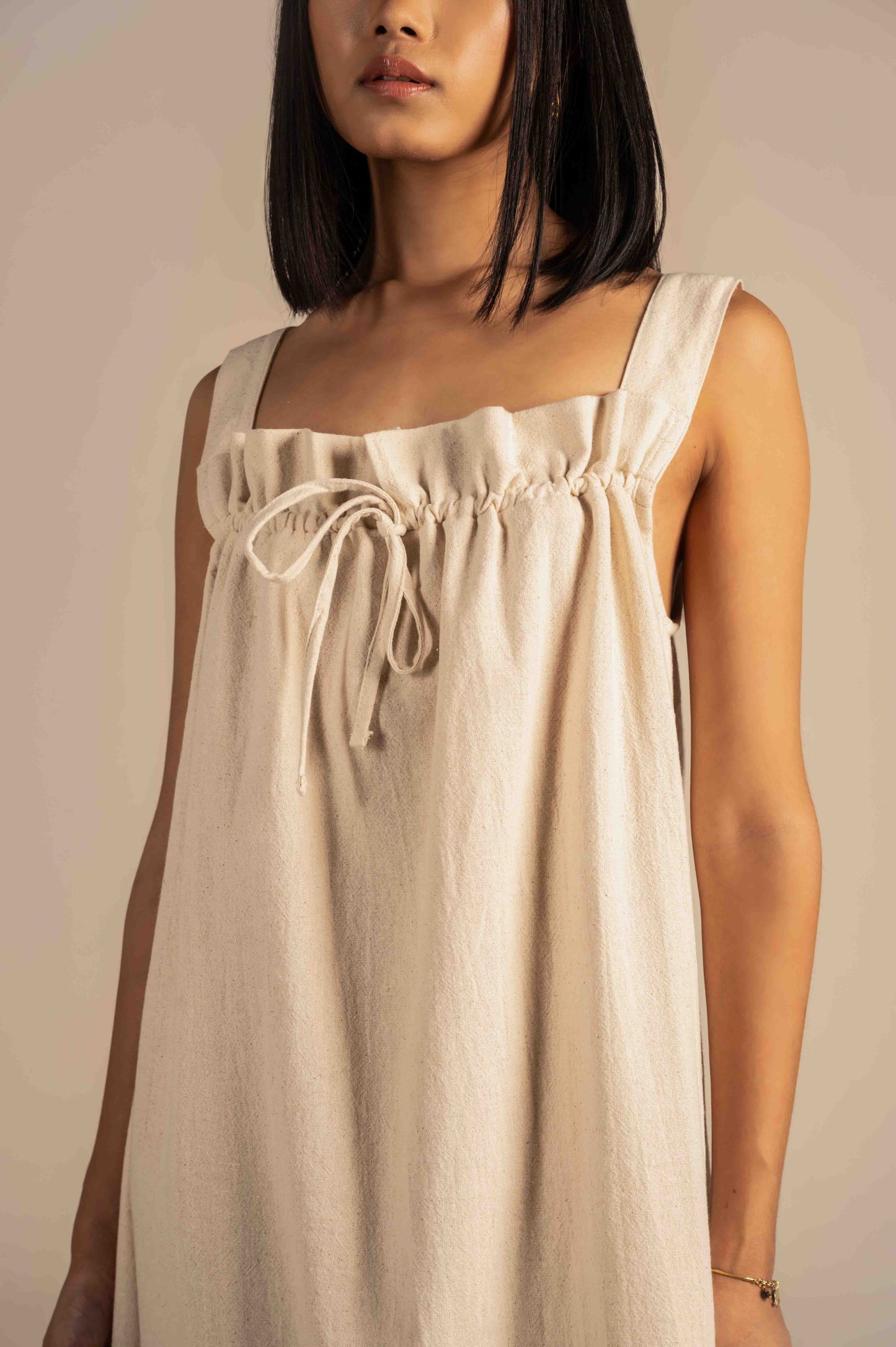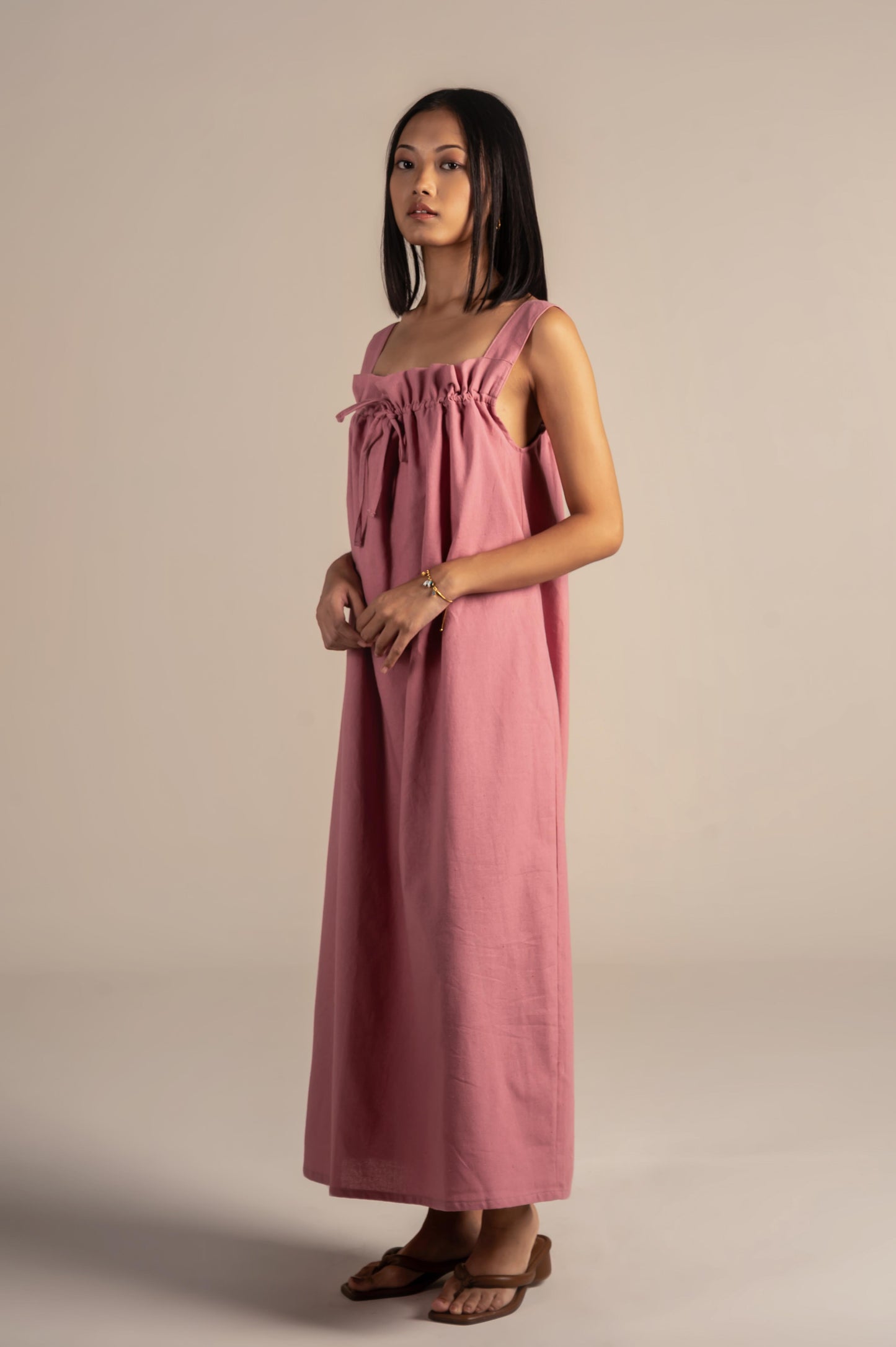This pinafore-style dress features a straight, midi-length silhouette with a front patch pocket for a utilitarian touch. The adjustable shoulder straps tie at the front, allowing for a customized fit. Crafted from textured, breathable fabric, it offers both comfort and durability. Perfect for layering over tees or tops for a casual, laid-back look.