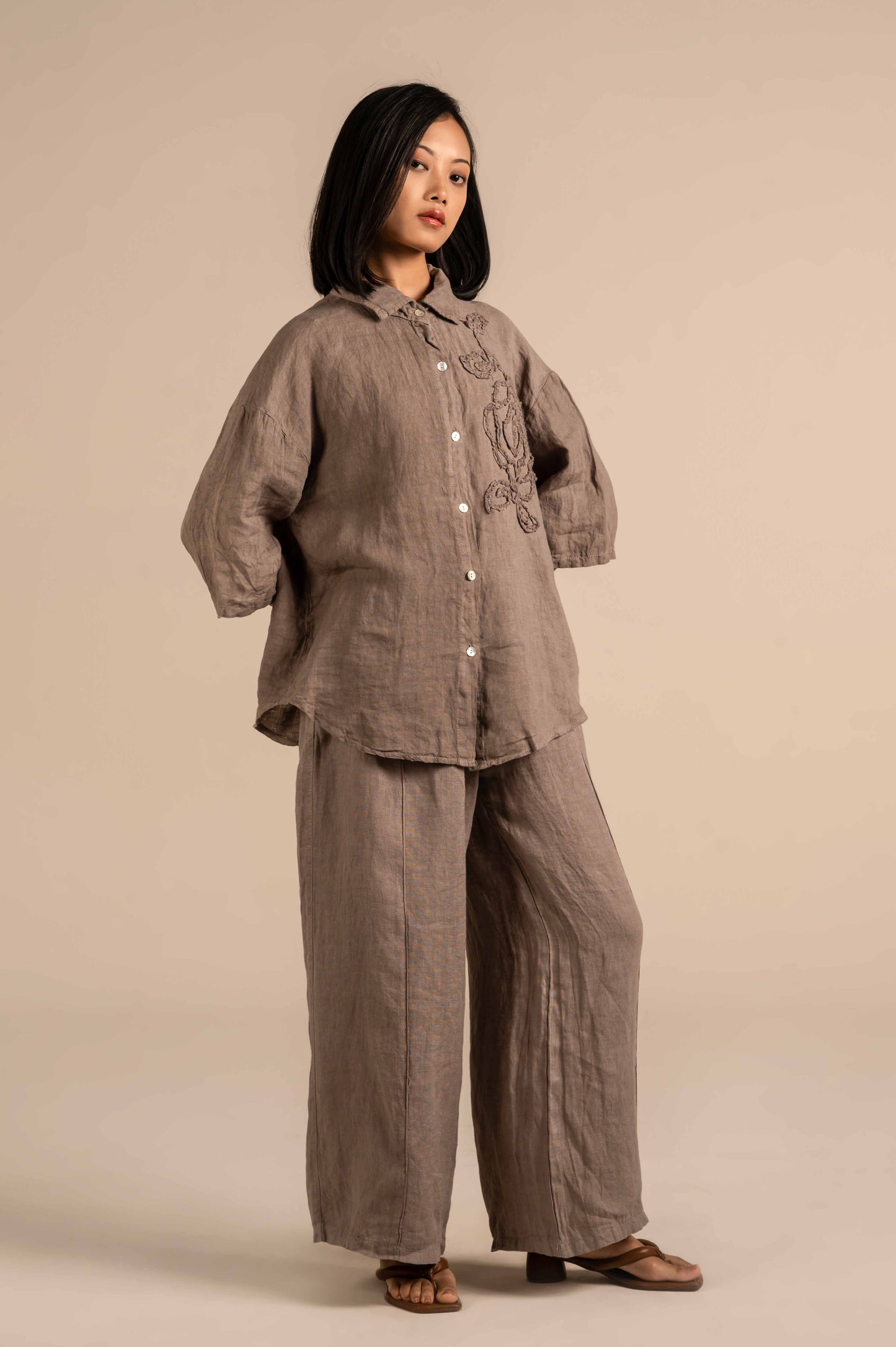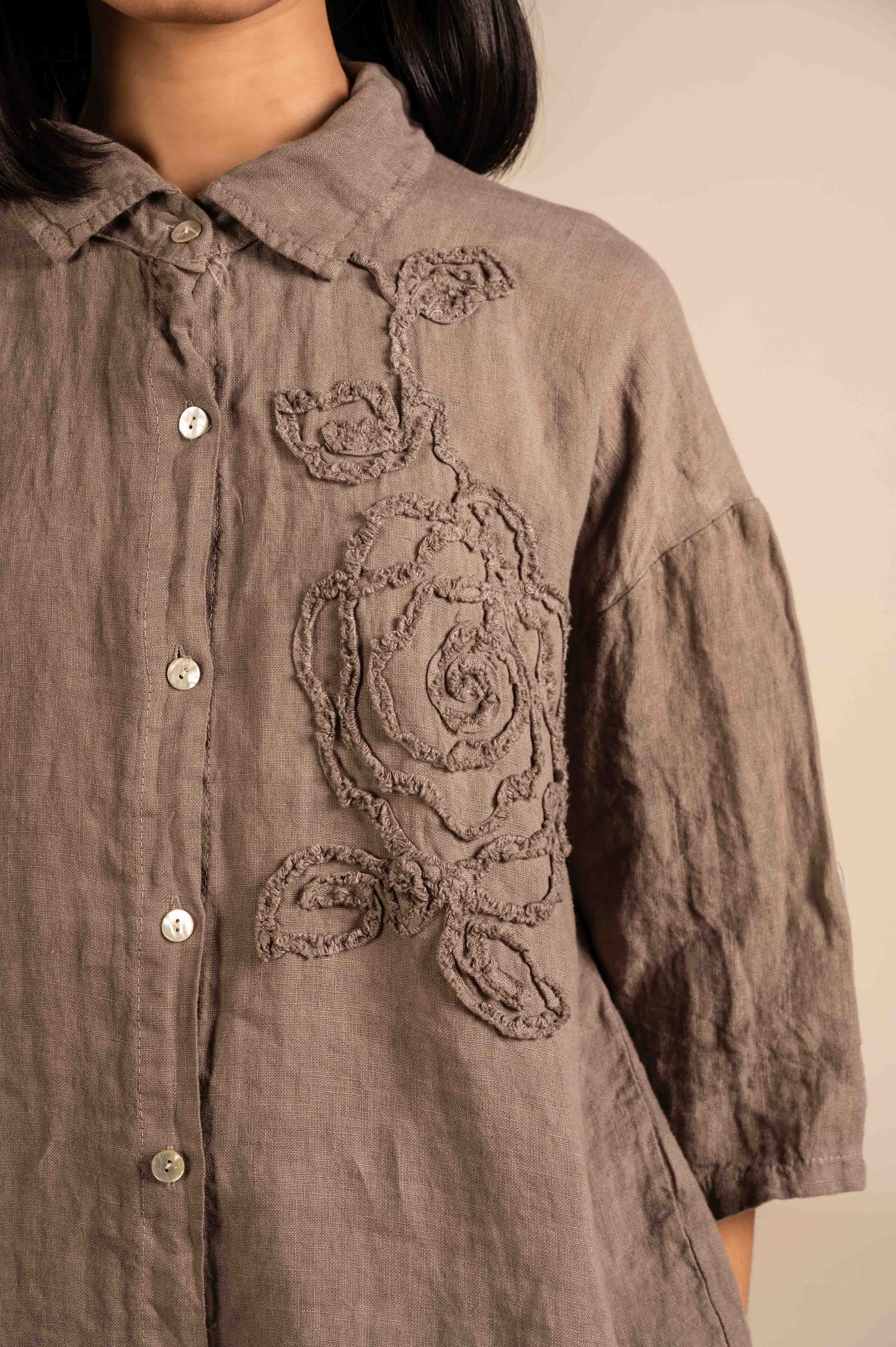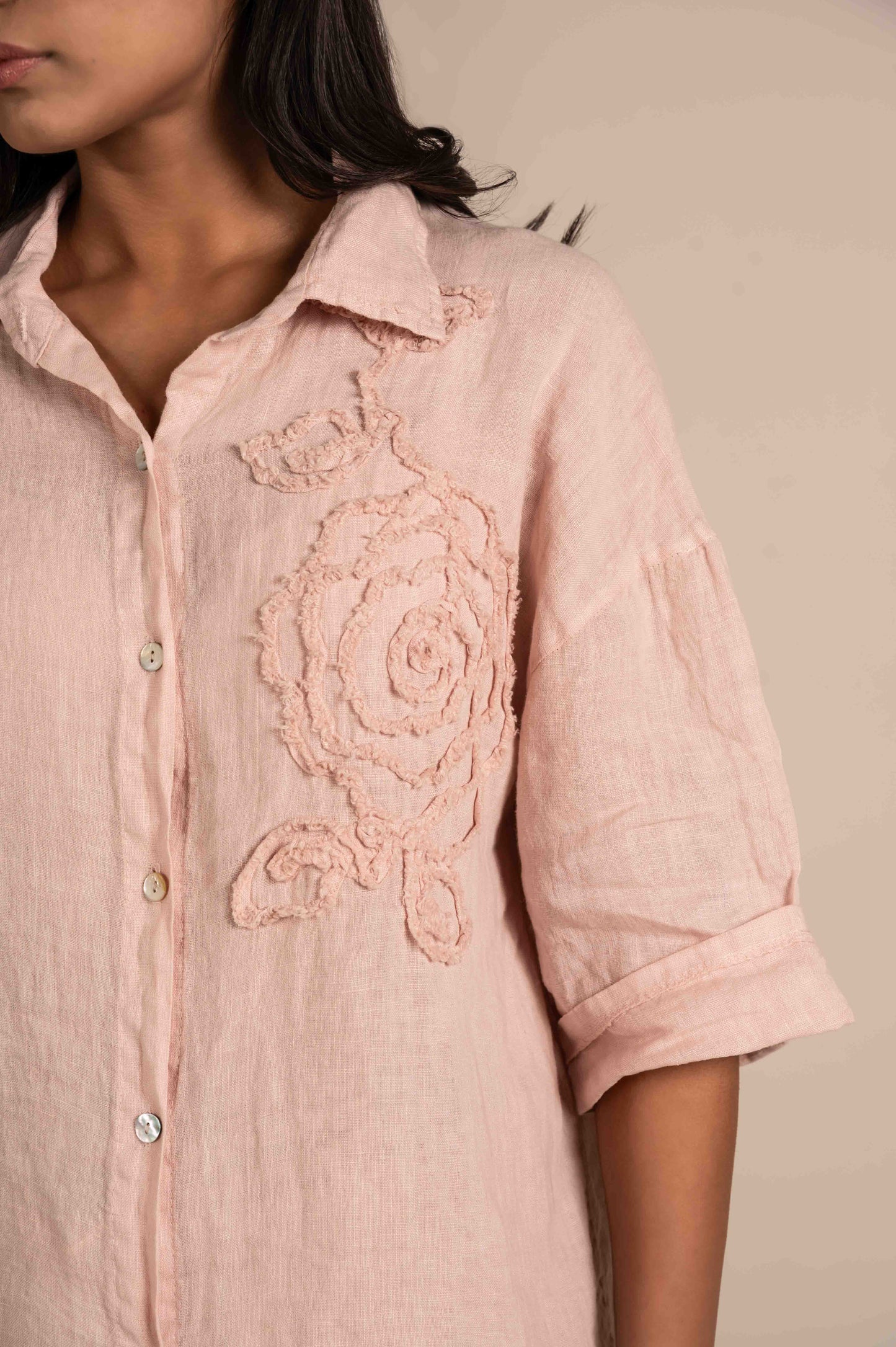 Chic longline linen shirts featuring intricate floral embroidery on the front, button-down design, roll-up sleeves with tabs, and a breezy relaxed fit„offered in free size for effortless everyday elegance.