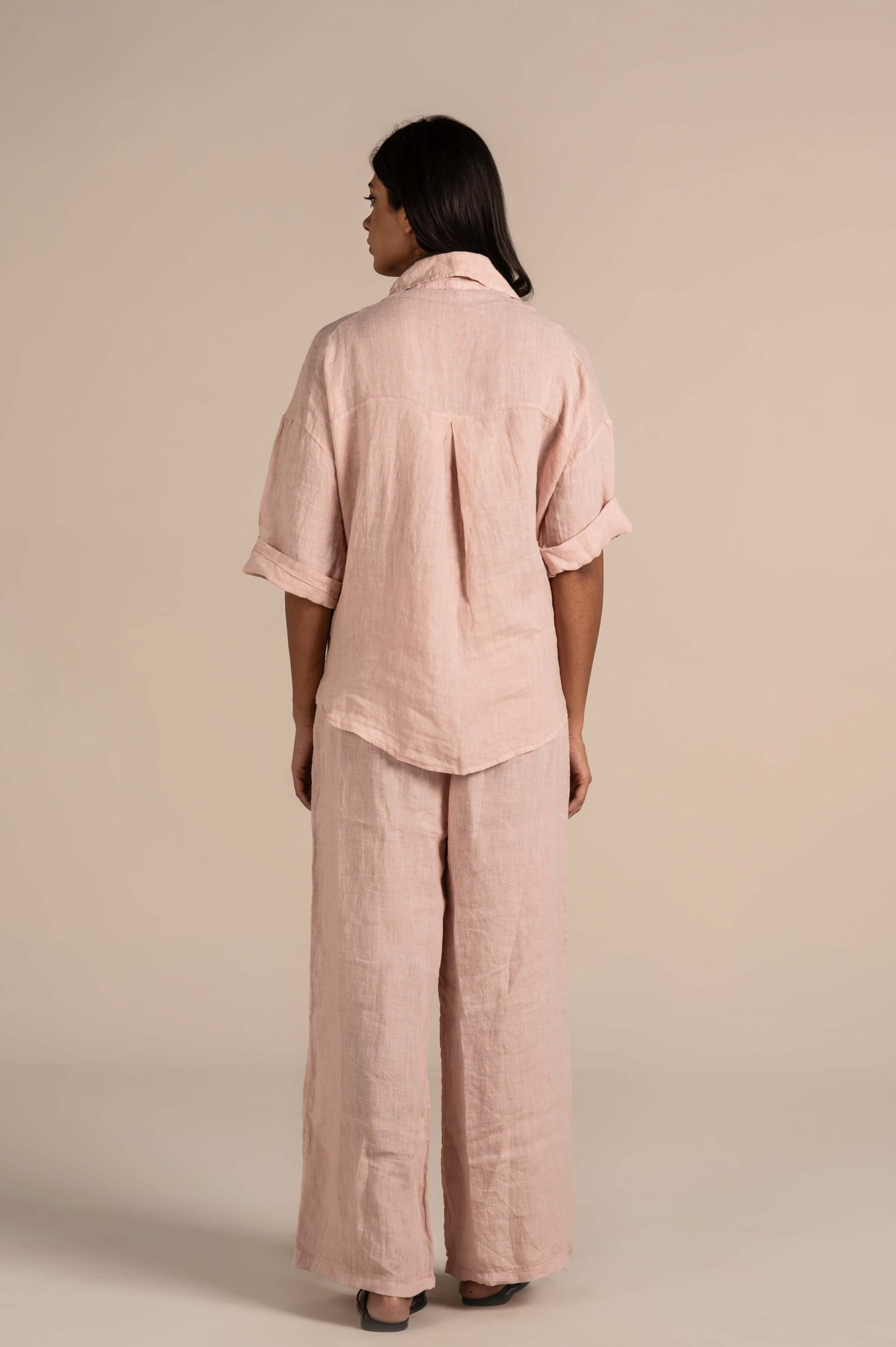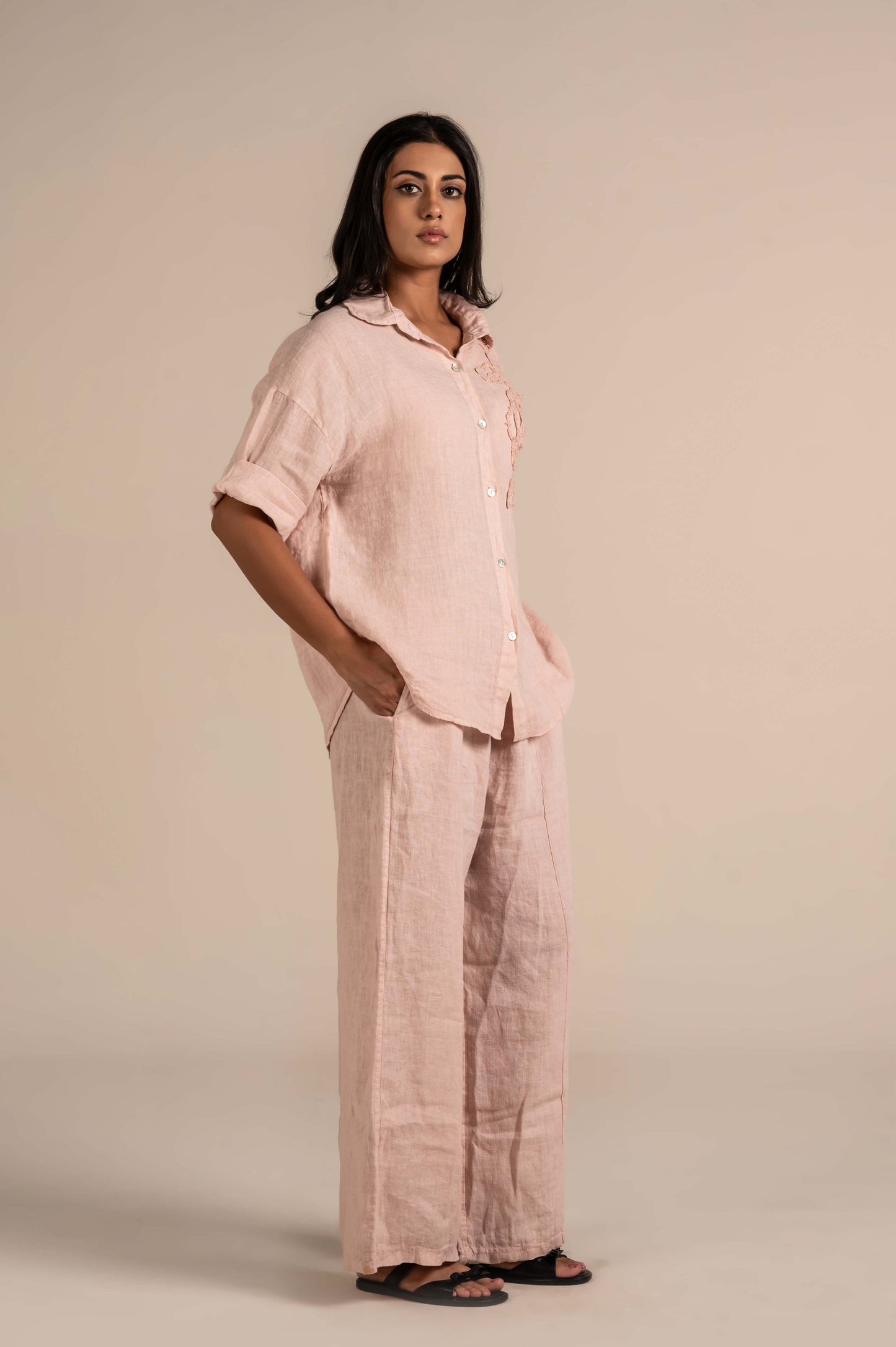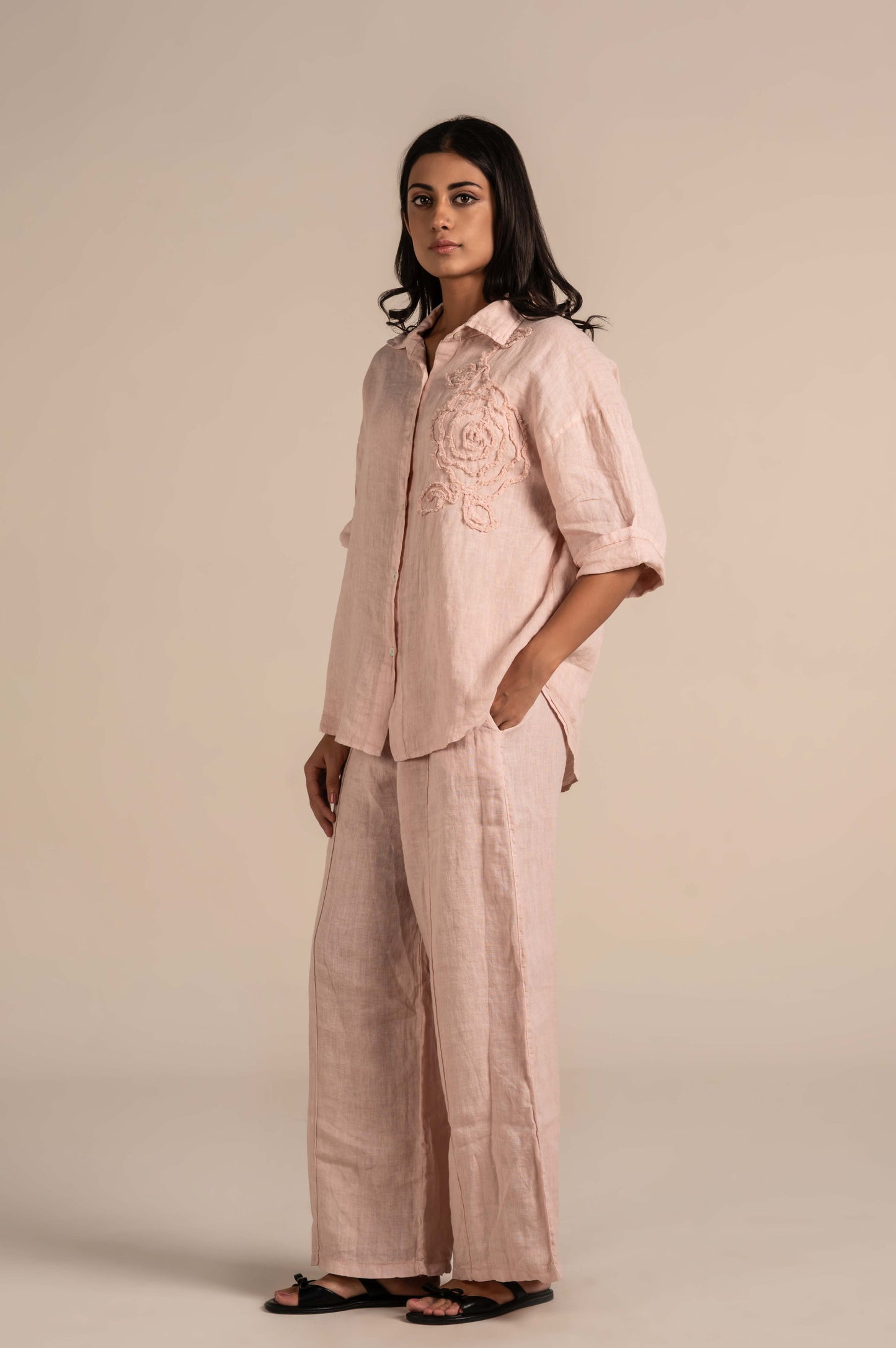 Chic longline linen shirts featuring intricate floral embroidery on the front, button-down design, roll-up sleeves with tabs, and a breezy relaxed fit„offered in free size for effortless everyday elegance.
