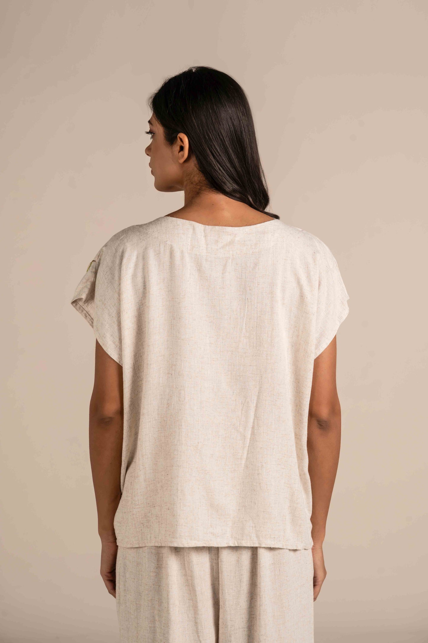 Breezy and breathable half-sleeve embroidered top featuring a relaxed fit, delicate floral hand embroidery, and available in a free size„perfect for casual days or graceful boho-chic styling.There is a front button-down design featuring dark wooden buttons. Scattered tiny embroidered blossoms and petals in various colors add a whimsical touch across the fabric.