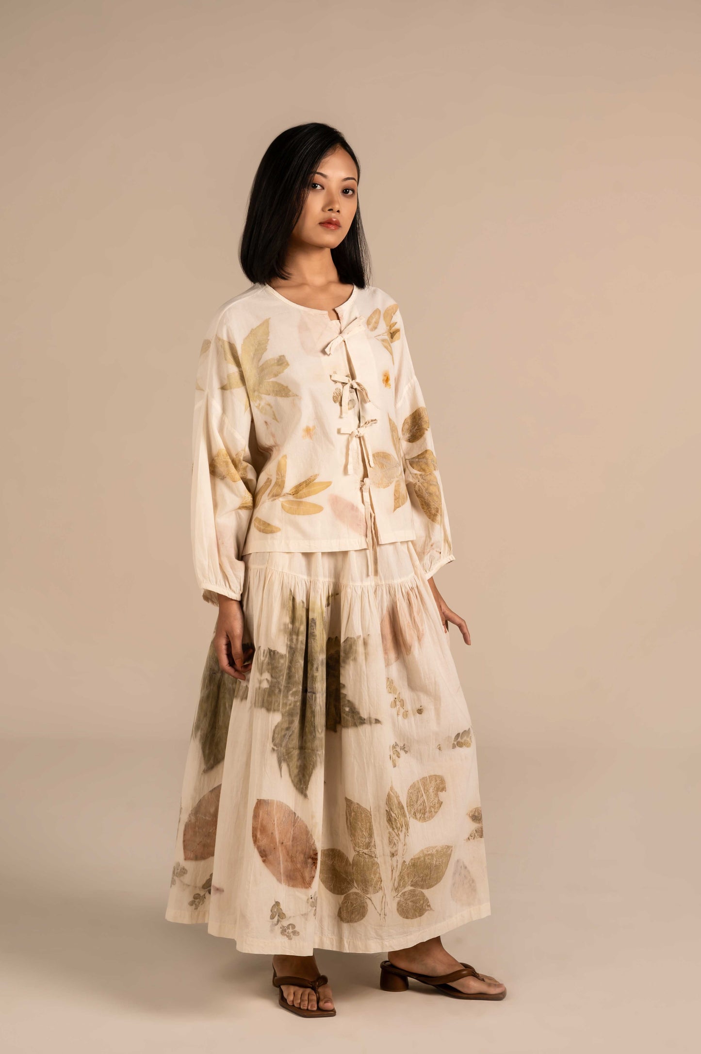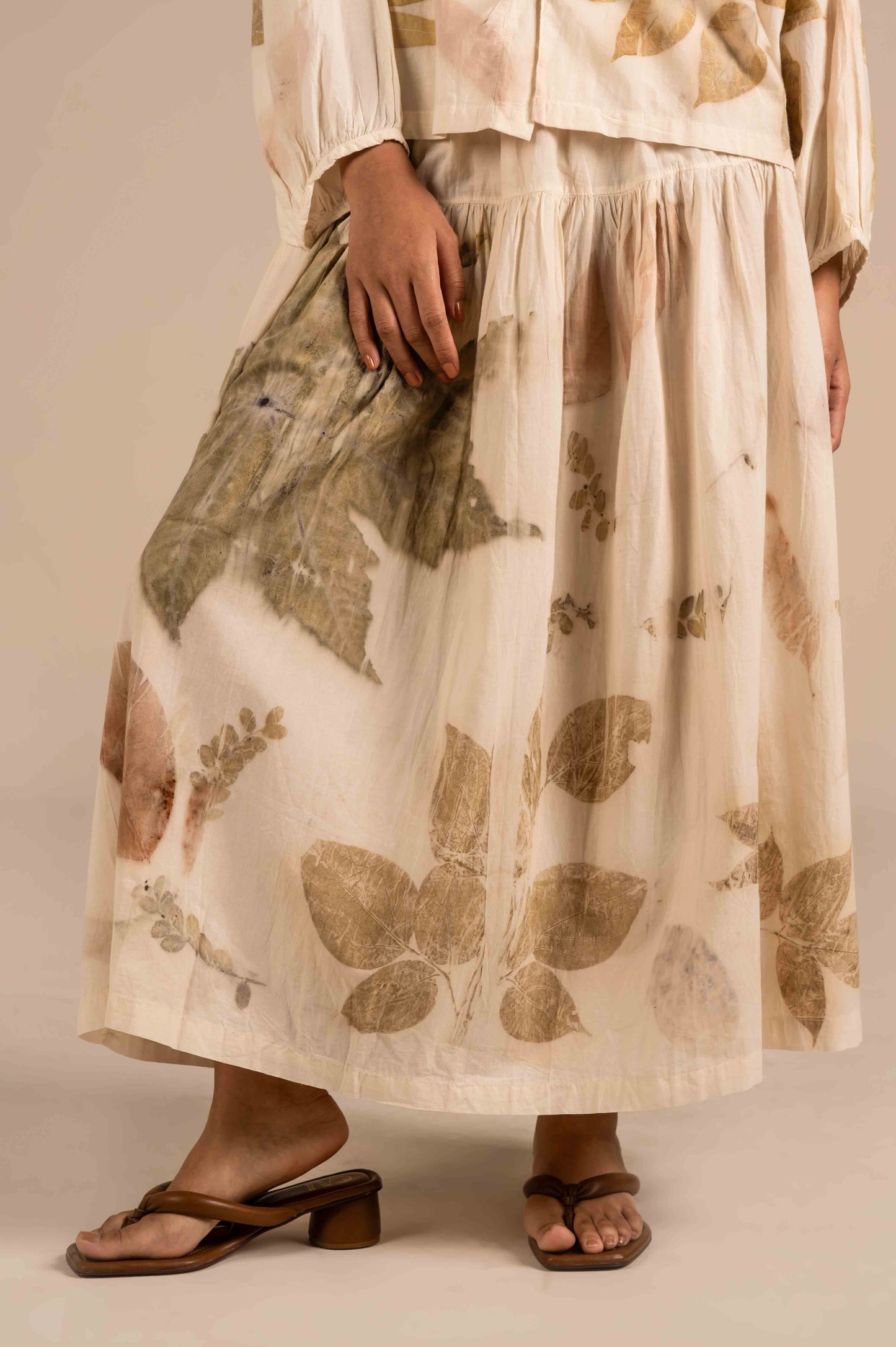 Full-length skirt with a relaxed, flowy silhouette, crafted from breathable fabric and adorned with a delicate hammered leaf texture. This nature-inspired piece brings together comfort and craftsmanship, making it perfect for both everyday elegance and relaxed boho styling. The leaf imprints and natural foliage patterns reflect a nature inspired print in a serene and organic color palette with bohemian aesthetic.
