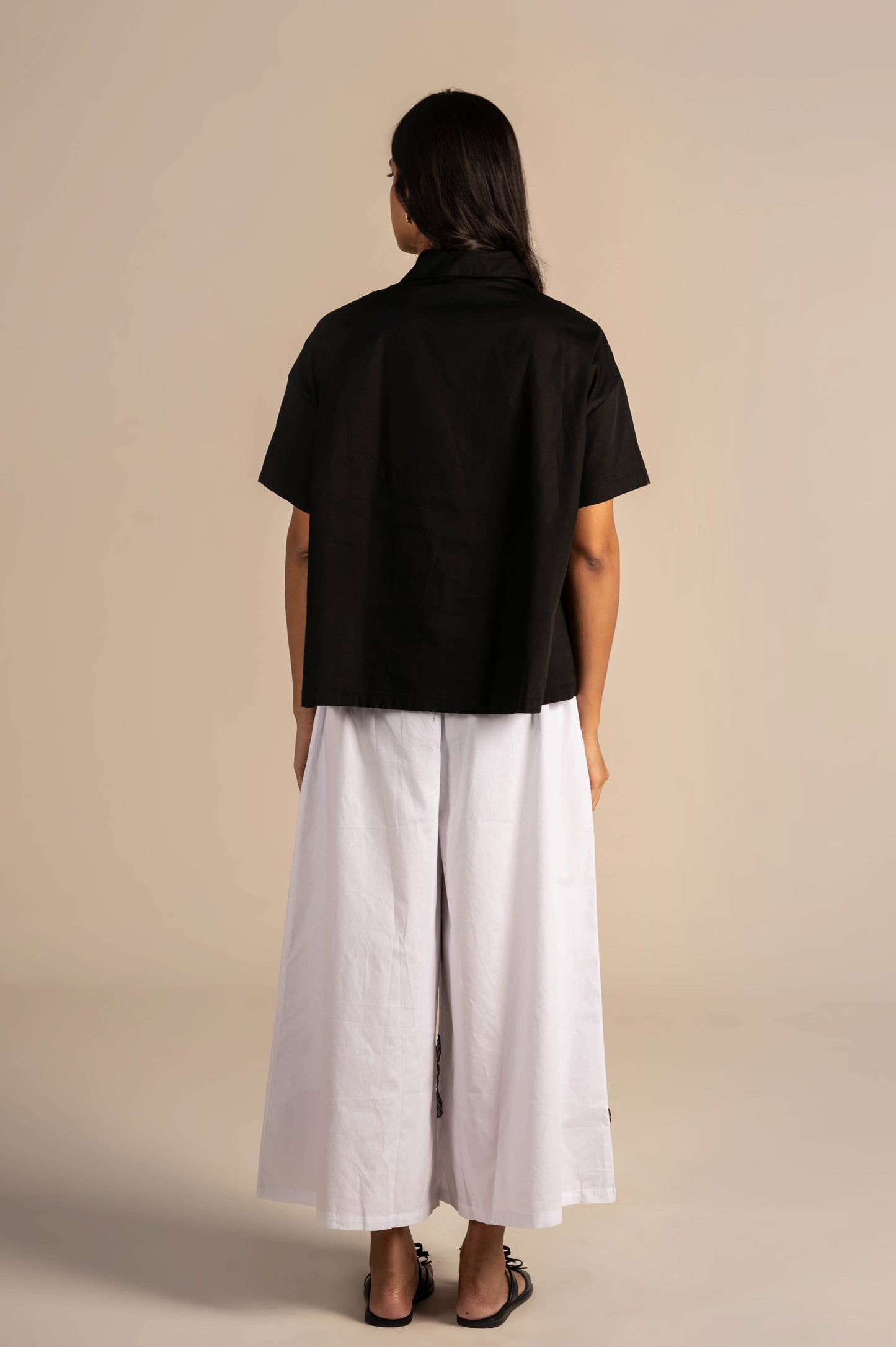 Elegant black button-down shirt features a striking applique, adding a bold yet refined touch. It blends classic tailoring with modern flair„perfect for both formal and semi-casual occasions.
