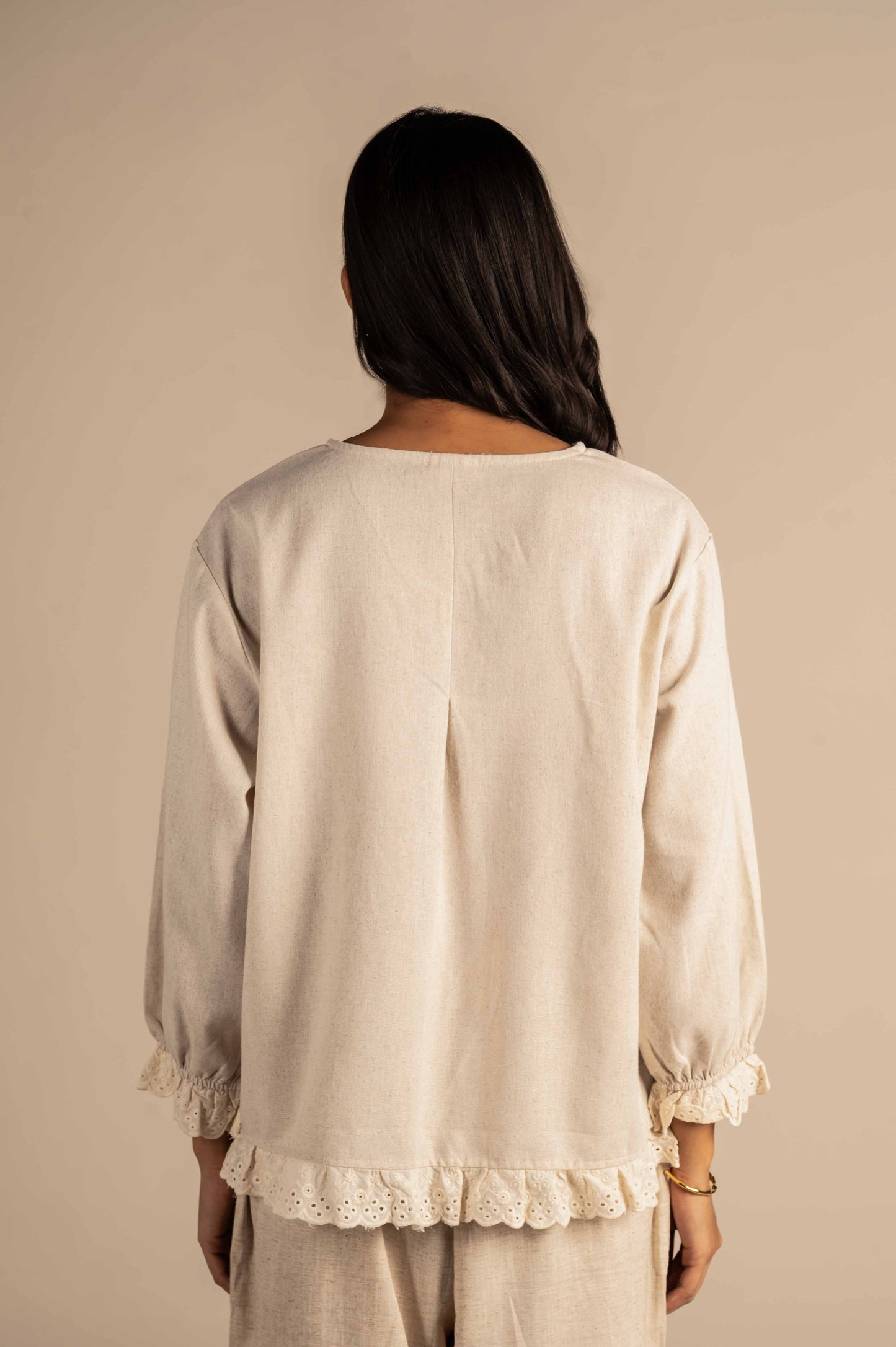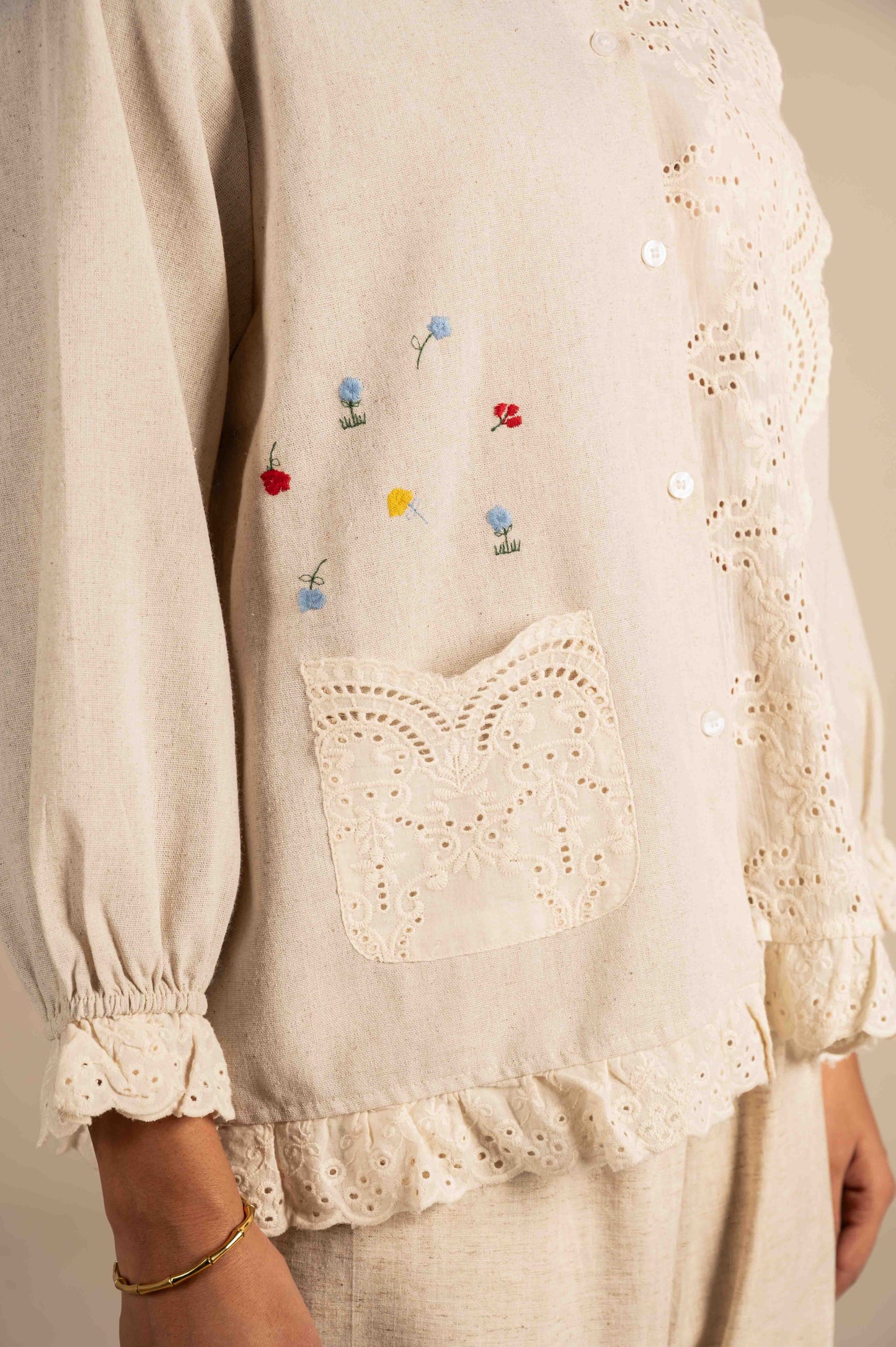 Graceful and stylish shirt with delicate lace embroidery and full sleeves for an effortlessly elegant look. Perfect for both everyday wear and special occasions.