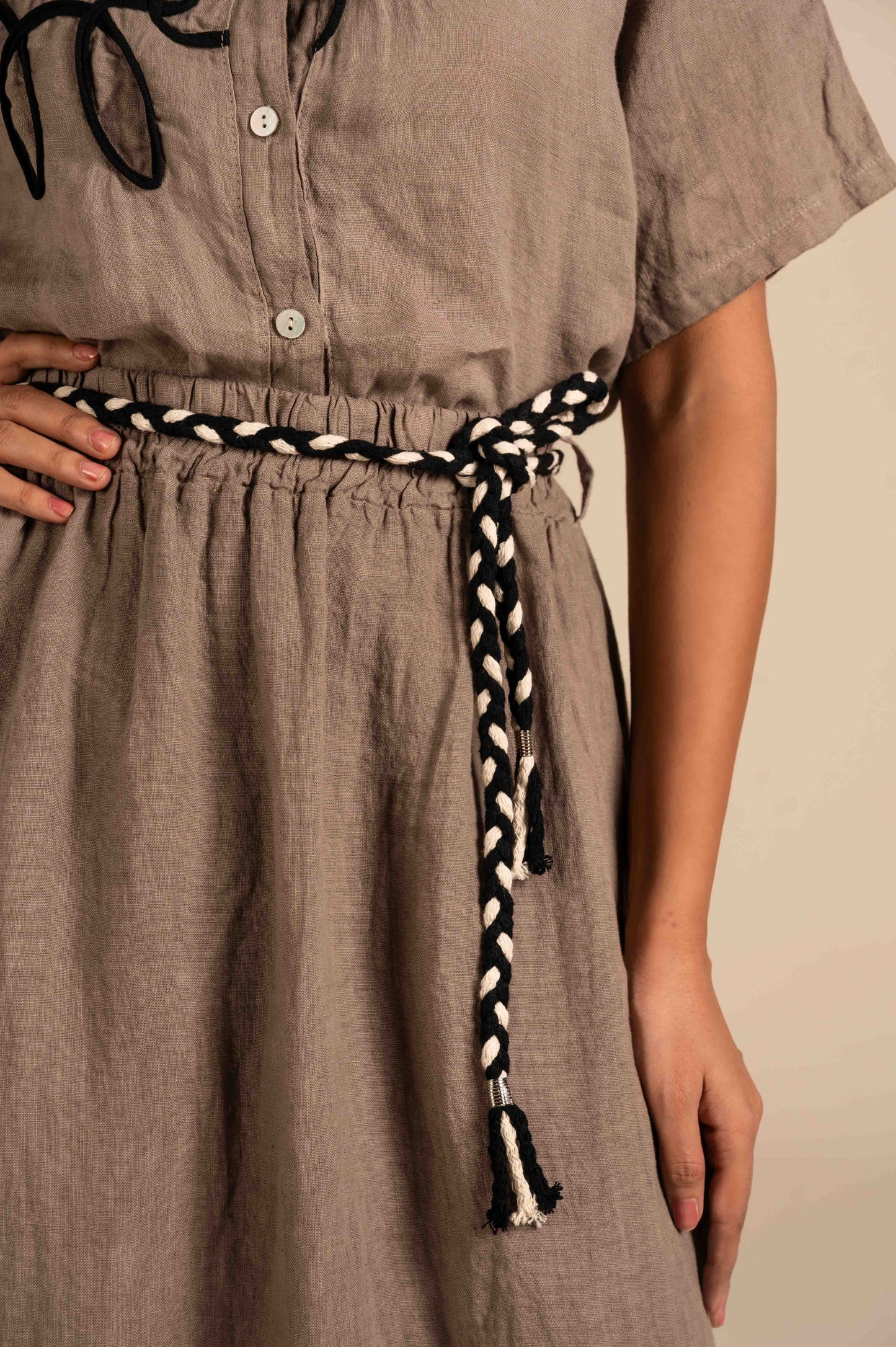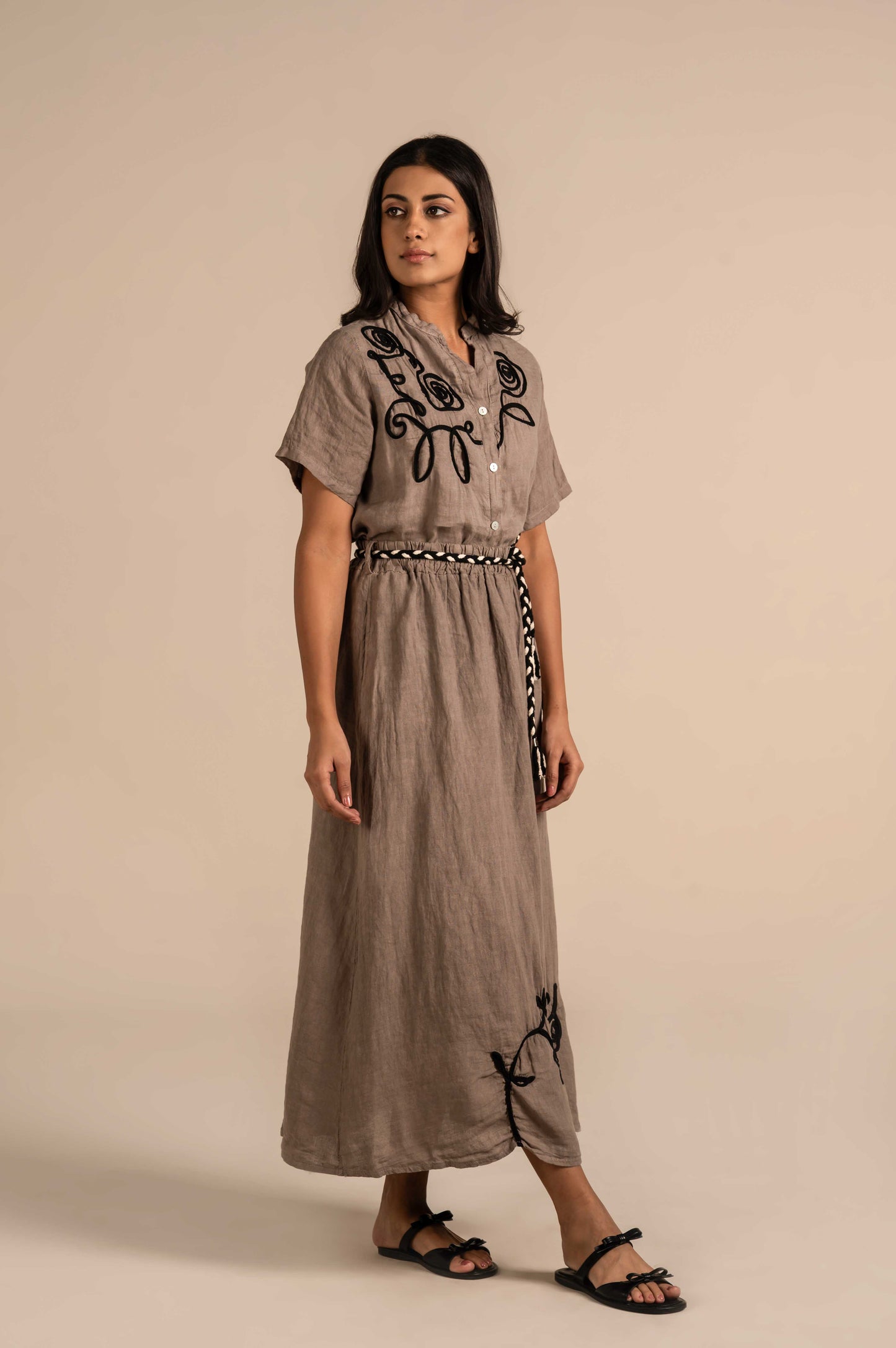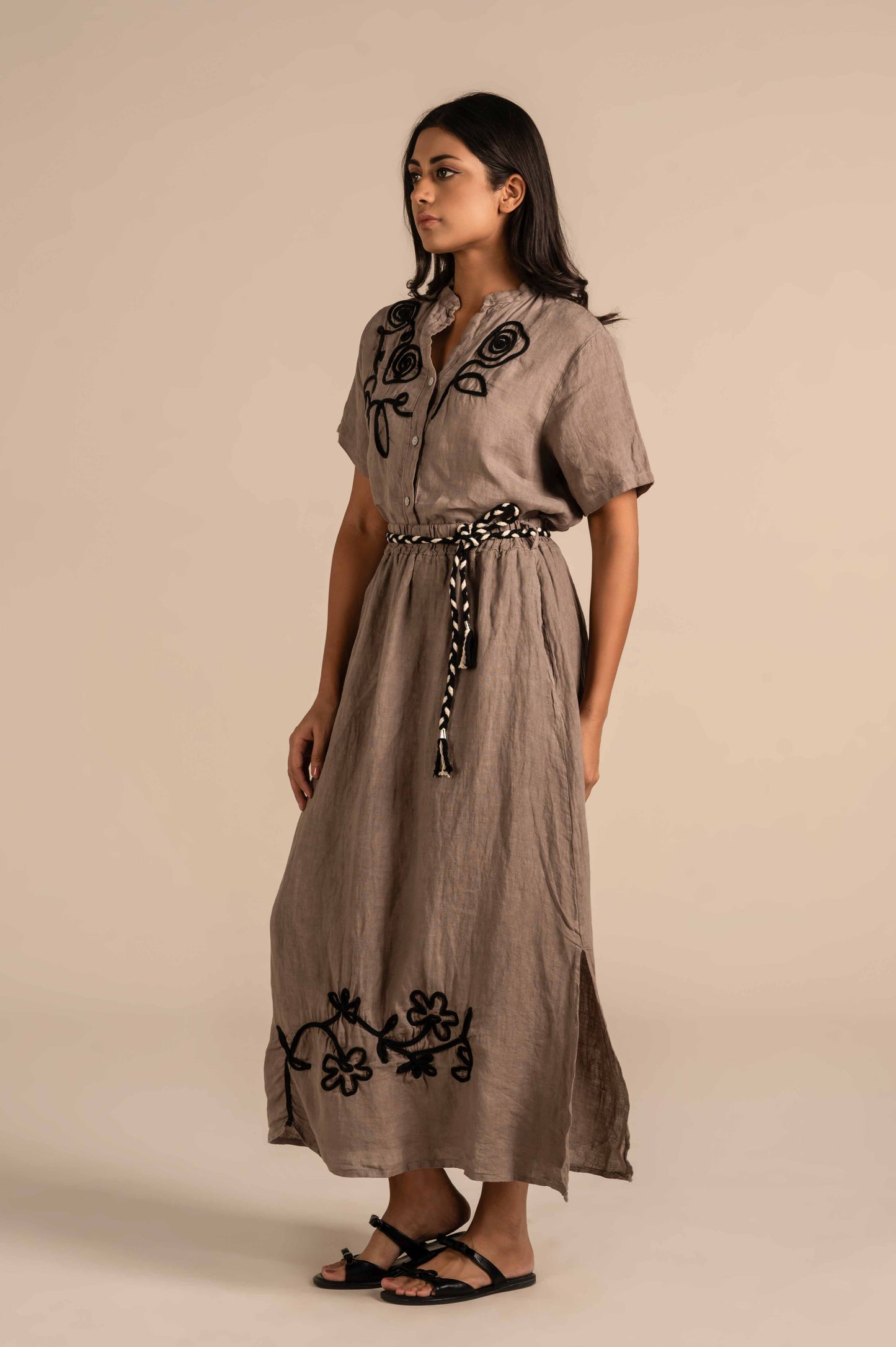 Short-sleeve linen shirt with bold floral embroidery