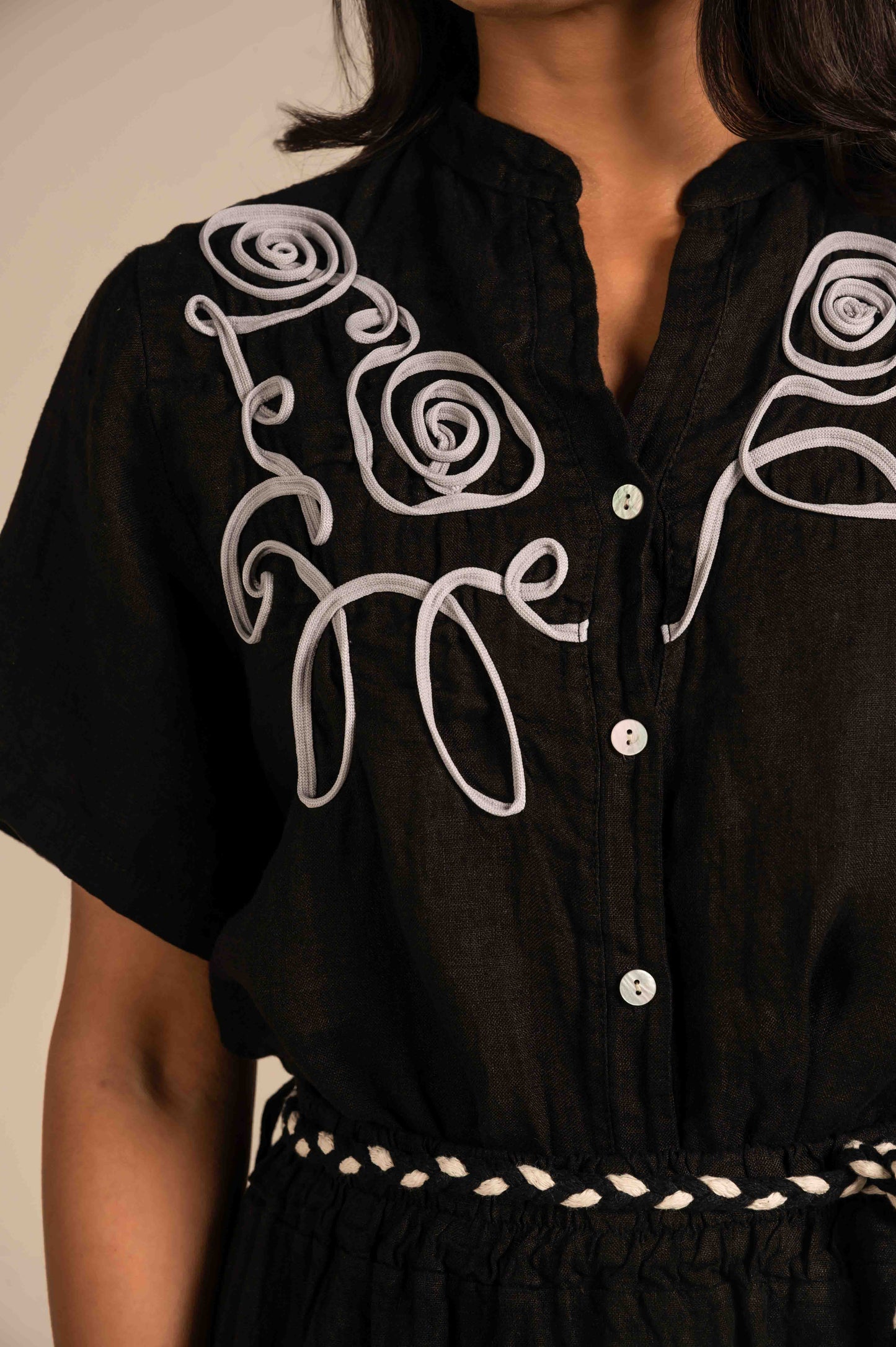 Eye-catching short-sleeve linen shirts featuring intricate oversized floral embroidery on the shoulders, a classic button-down front, and a breezy, relaxed fit„crafted in a soft, breathable fabric and offered in free size for a bold yet elegant everyday look.
