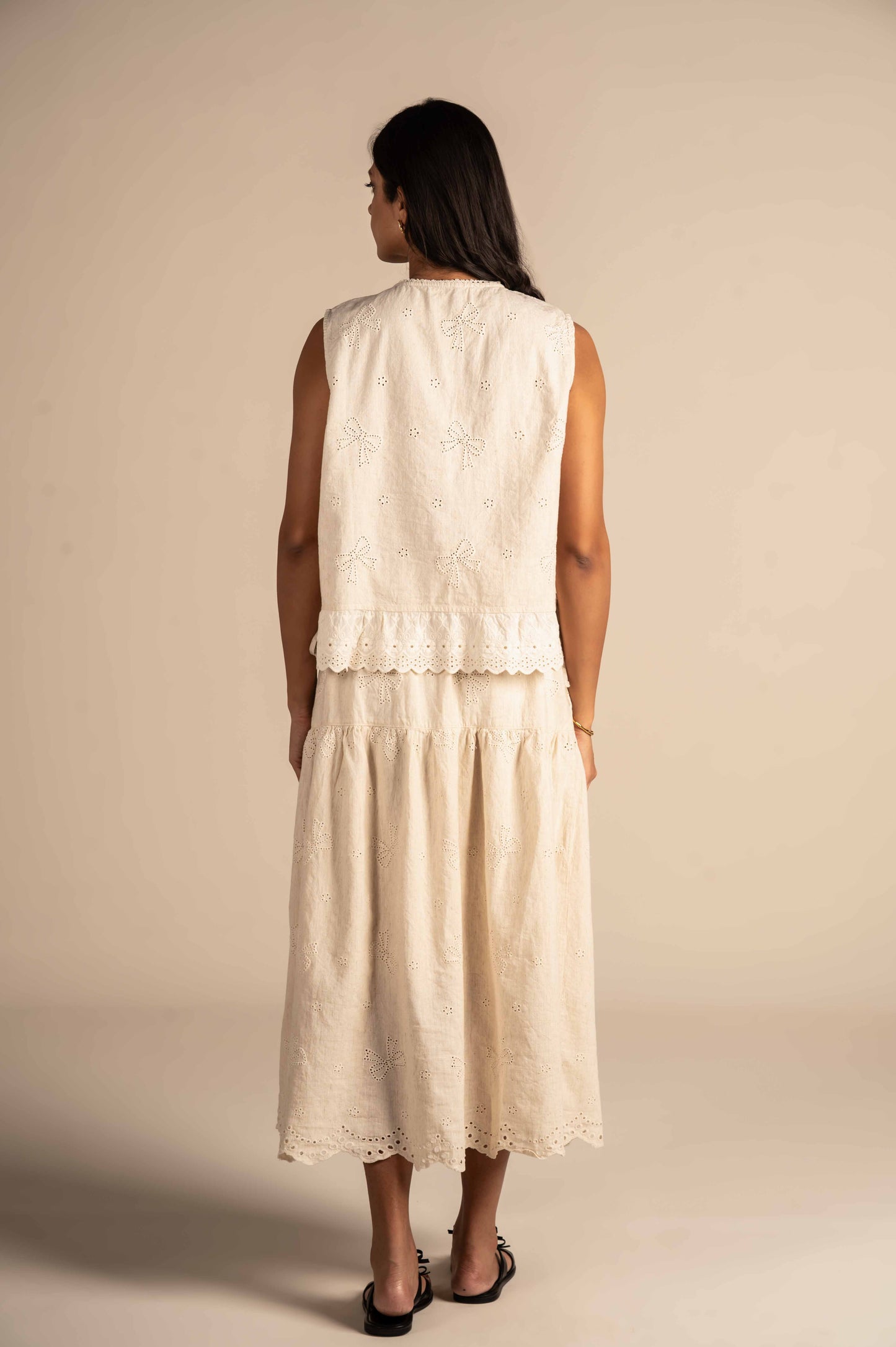 Chic and stylish sleeveless jacket features embroidered bow detailing for a subtle yet elegant touch. Perfect for layering with a fashionable flair