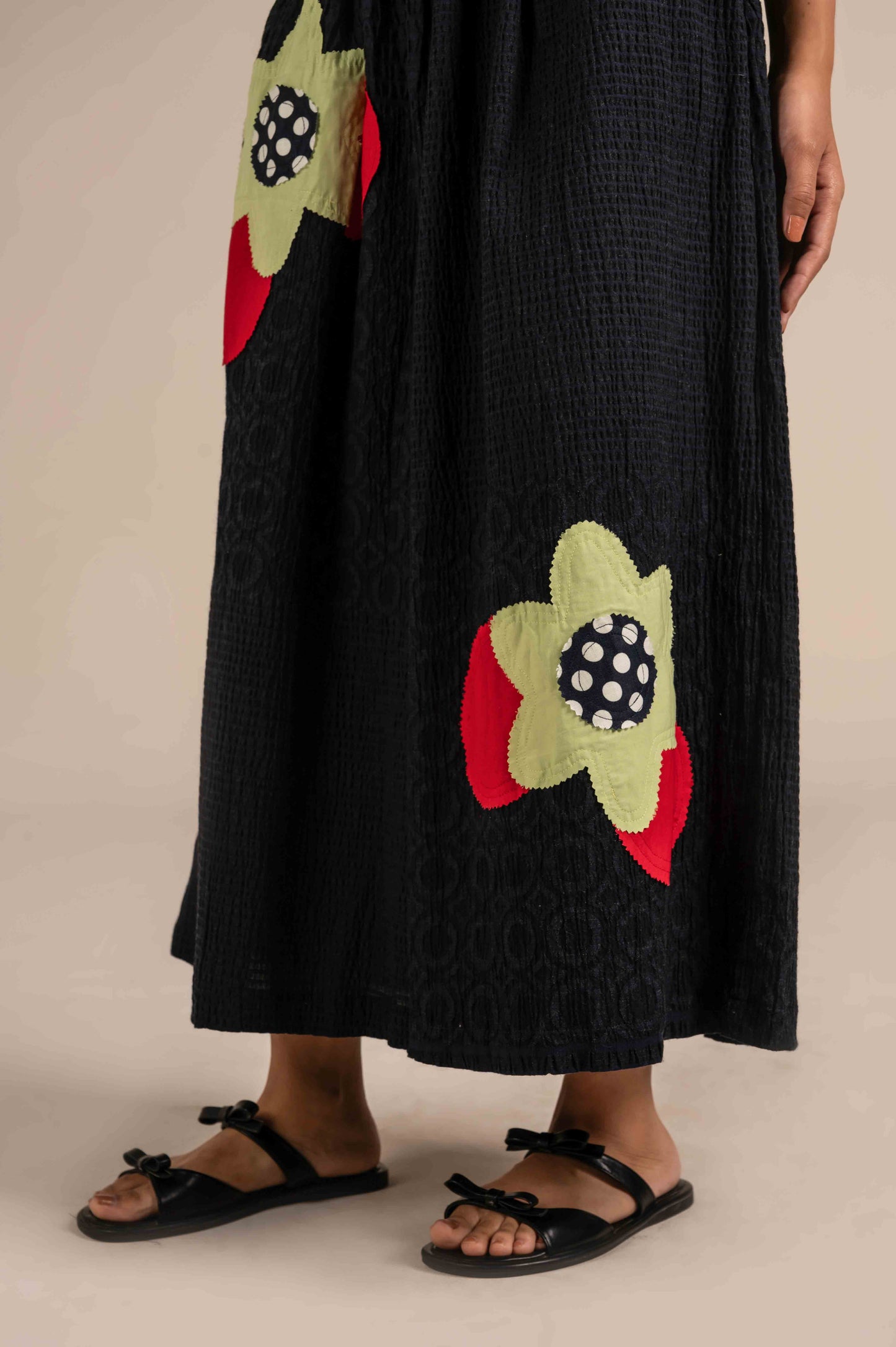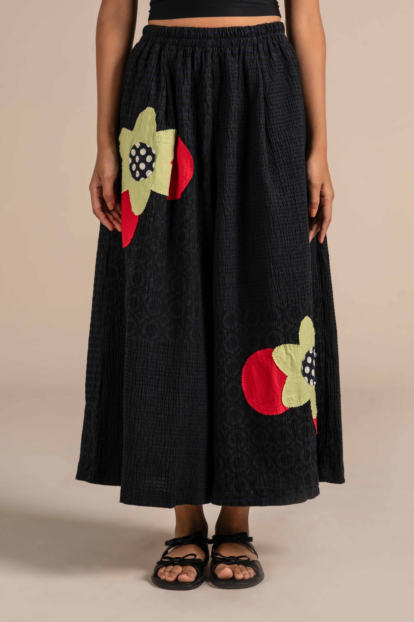 These black wide-leg pants feature a comfortable elastic waistband and a relaxed fit, perfect for casual wear. Bold floral appliqués in lime green and bright red with a navy polka-dot center adorn both legs, adding a playful, artistic touch. Crafted from a textured fabric, they combine comfort with standout style. Ideal for pairing with simple tops to let the statement details shine.