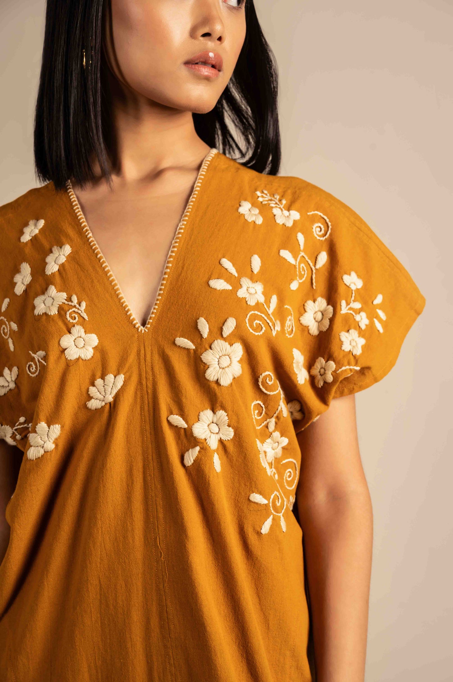 Flowy and relaxing dress features delicate white floral embroidery around the neckline, adding a touch of charm to its minimalist design. Made from breathable fabric with a relaxed fit, it's perfect for warm days, casual outings, or laid-back gatherings.The embroidery features finely detailed flowers, adding depth and elegance to the otherwise solid fabric.