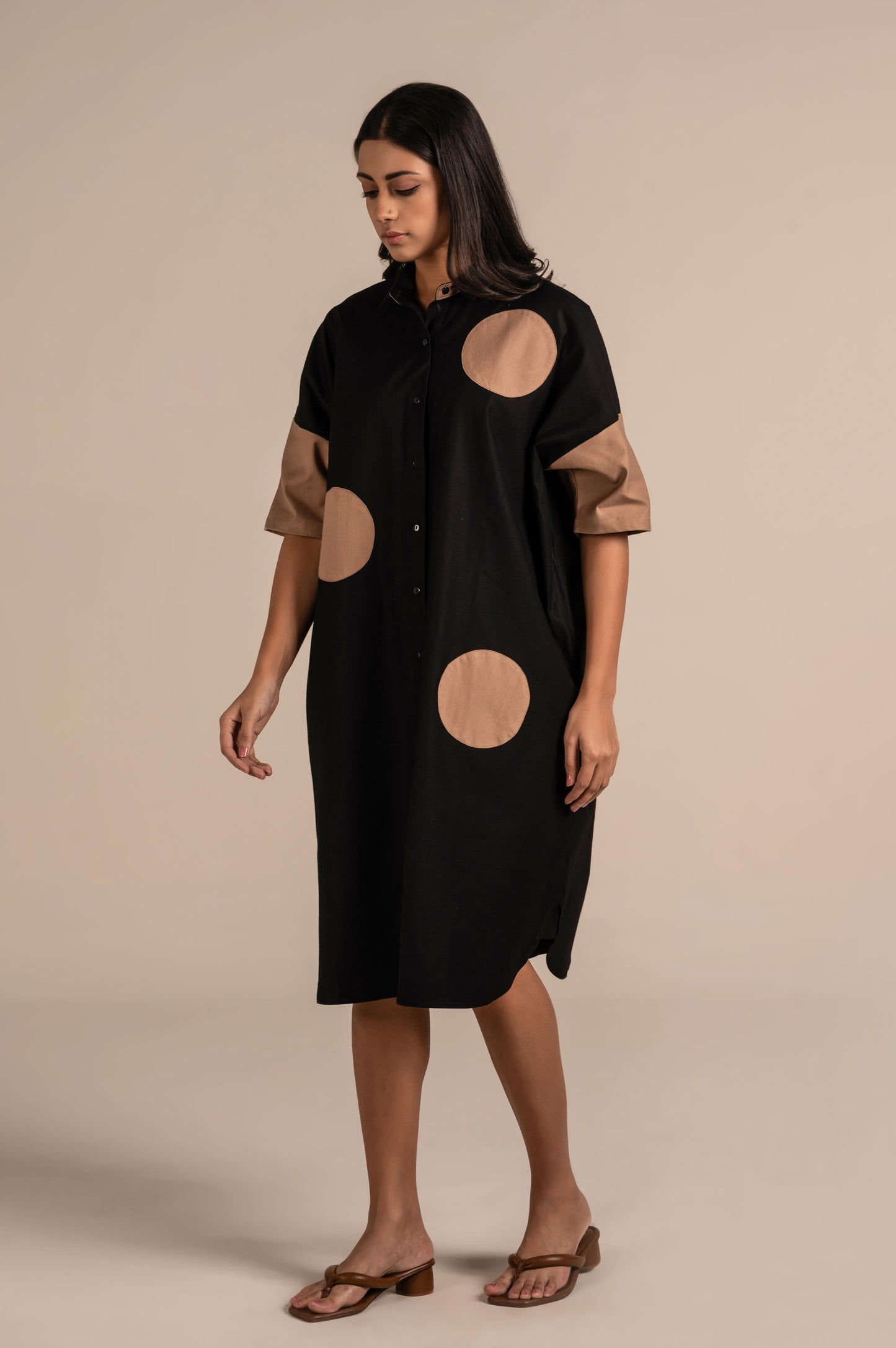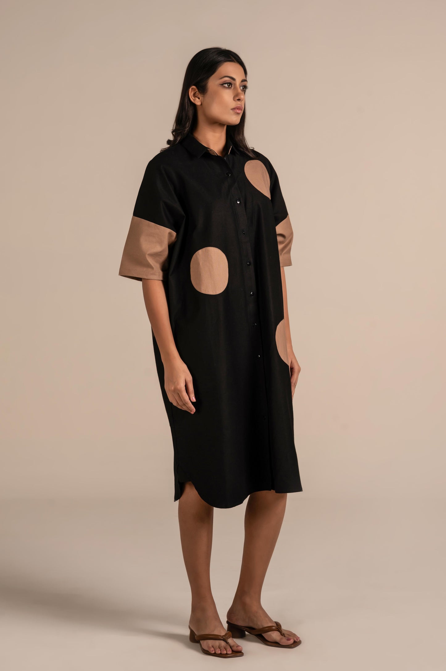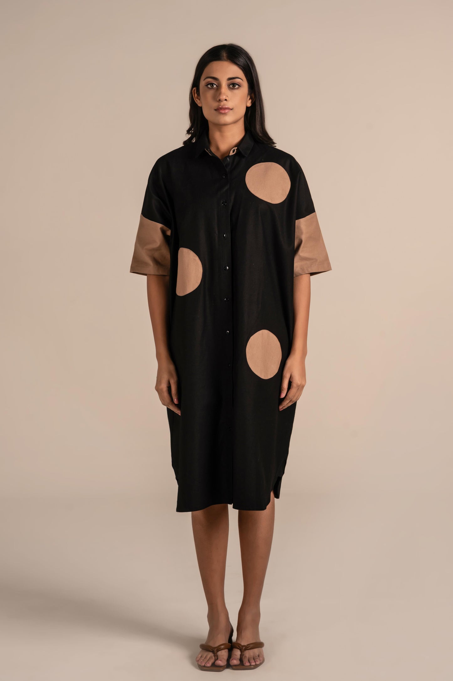 This is a contemporary winter shirt dress featuring a front button-down design and a classic collar. The short sleeves and oversized polka-dot appliqués in contrasting beige add a bold, playful element to the minimalist silhouette. Crafted from a smooth, structured fabric, it blends modern geometric style with everyday comfort. Perfect for making a chic statement in casual or semi-formal settings.