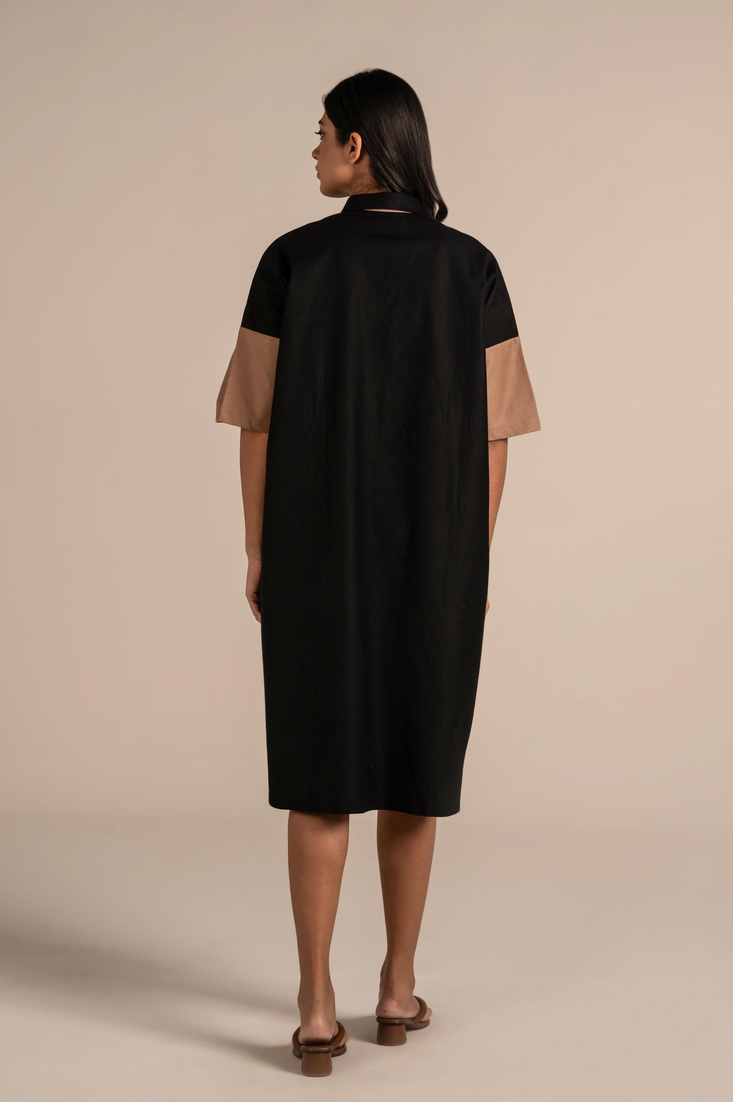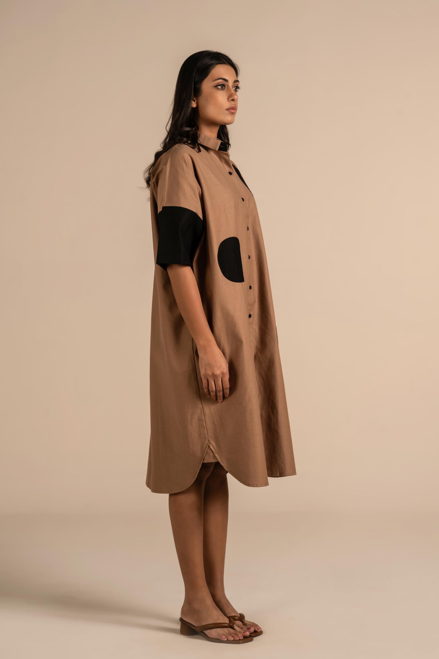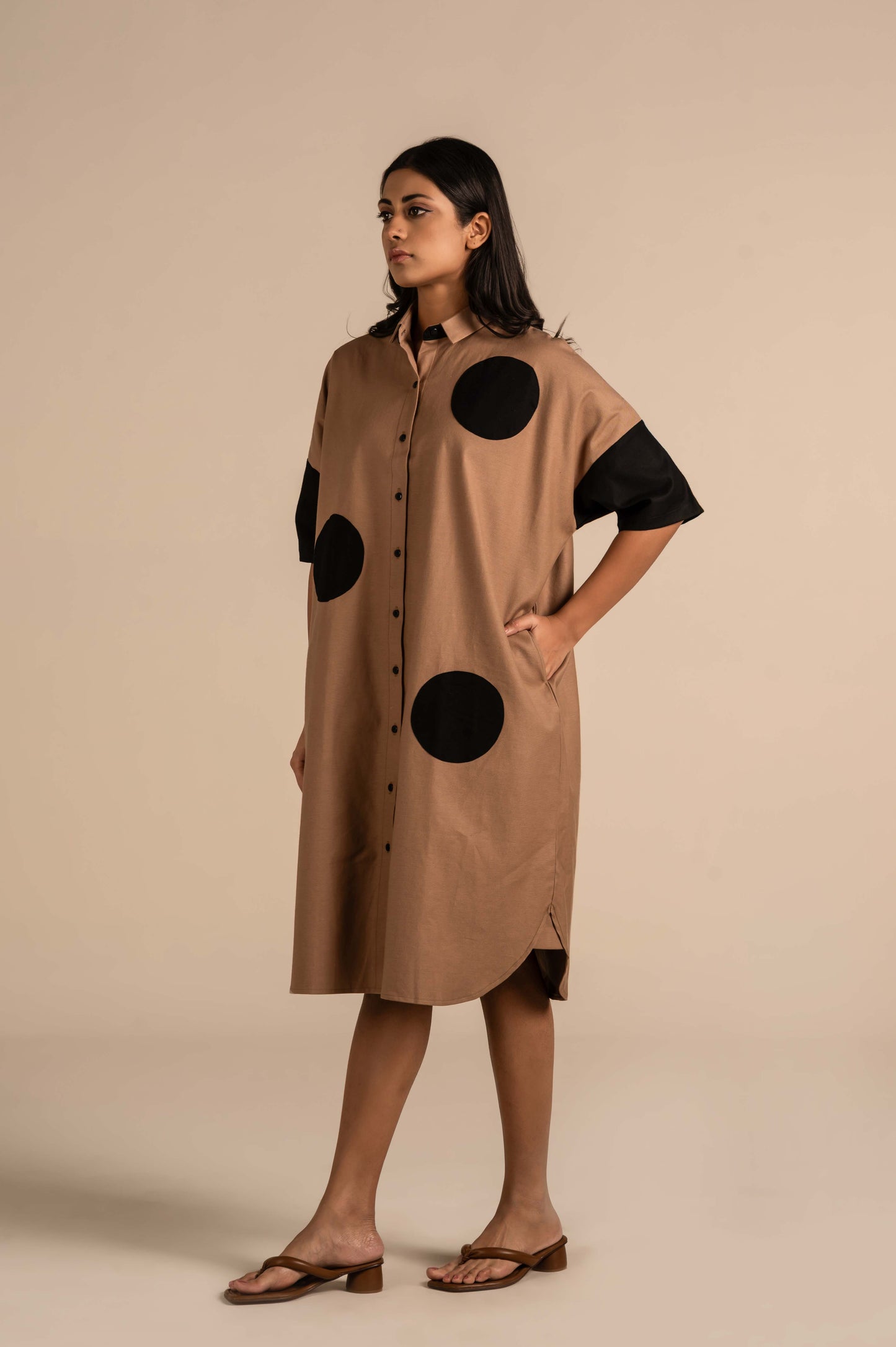 This is a contemporary winter shirt dress featuring a front button-down design and a classic collar. The short sleeves and oversized polka-dot appliqués in contrasting beige add a bold, playful element to the minimalist silhouette. Crafted from a smooth, structured fabric, it blends modern geometric style with everyday comfort. Perfect for making a chic statement in casual or semi-formal settings.