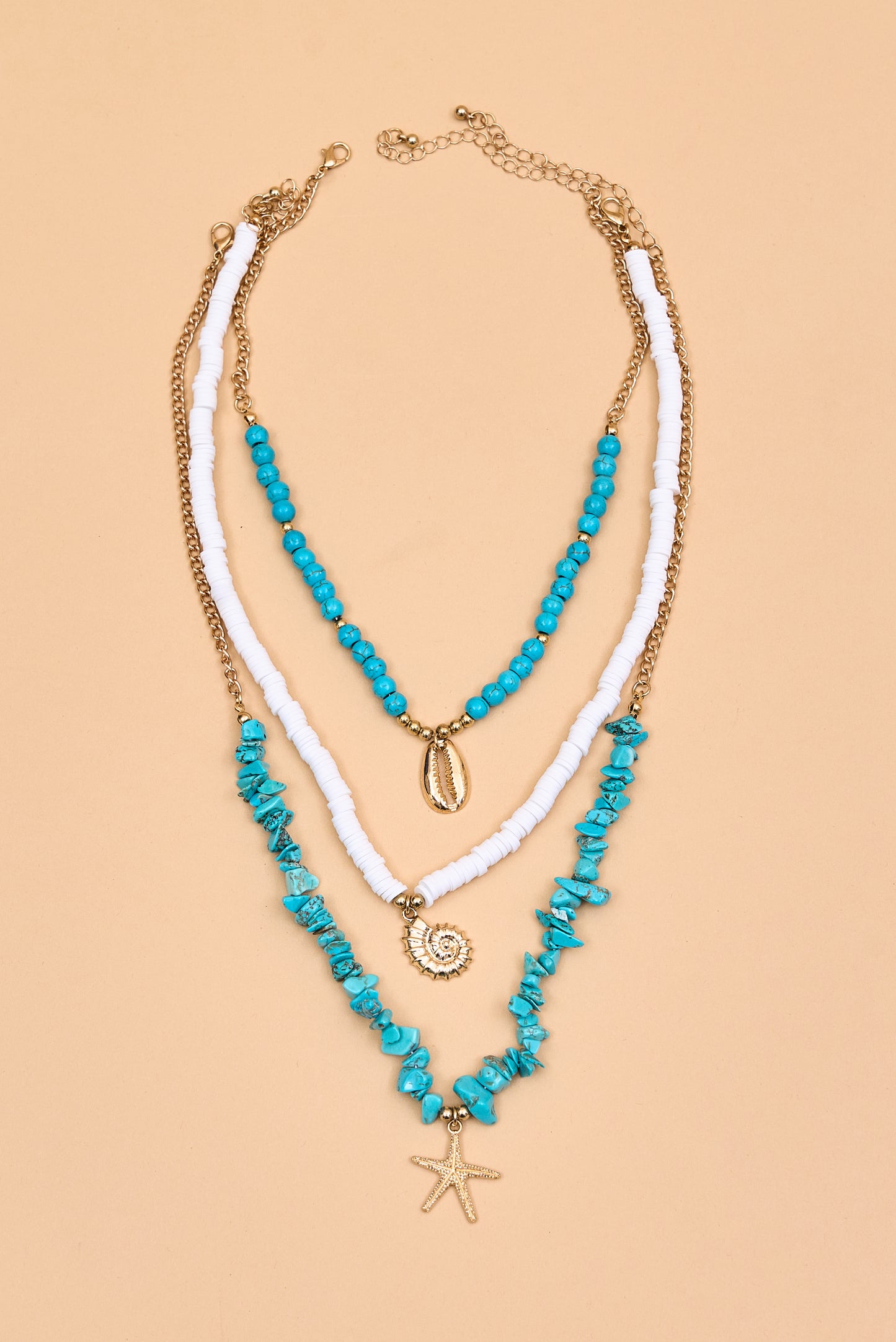 Infuse your look with vibrant coastal energy through this layered necklace set, combining turquoise beads, delicate pearls, and gold-tone seashell and starfish charms for a fresh, beach-inspired style