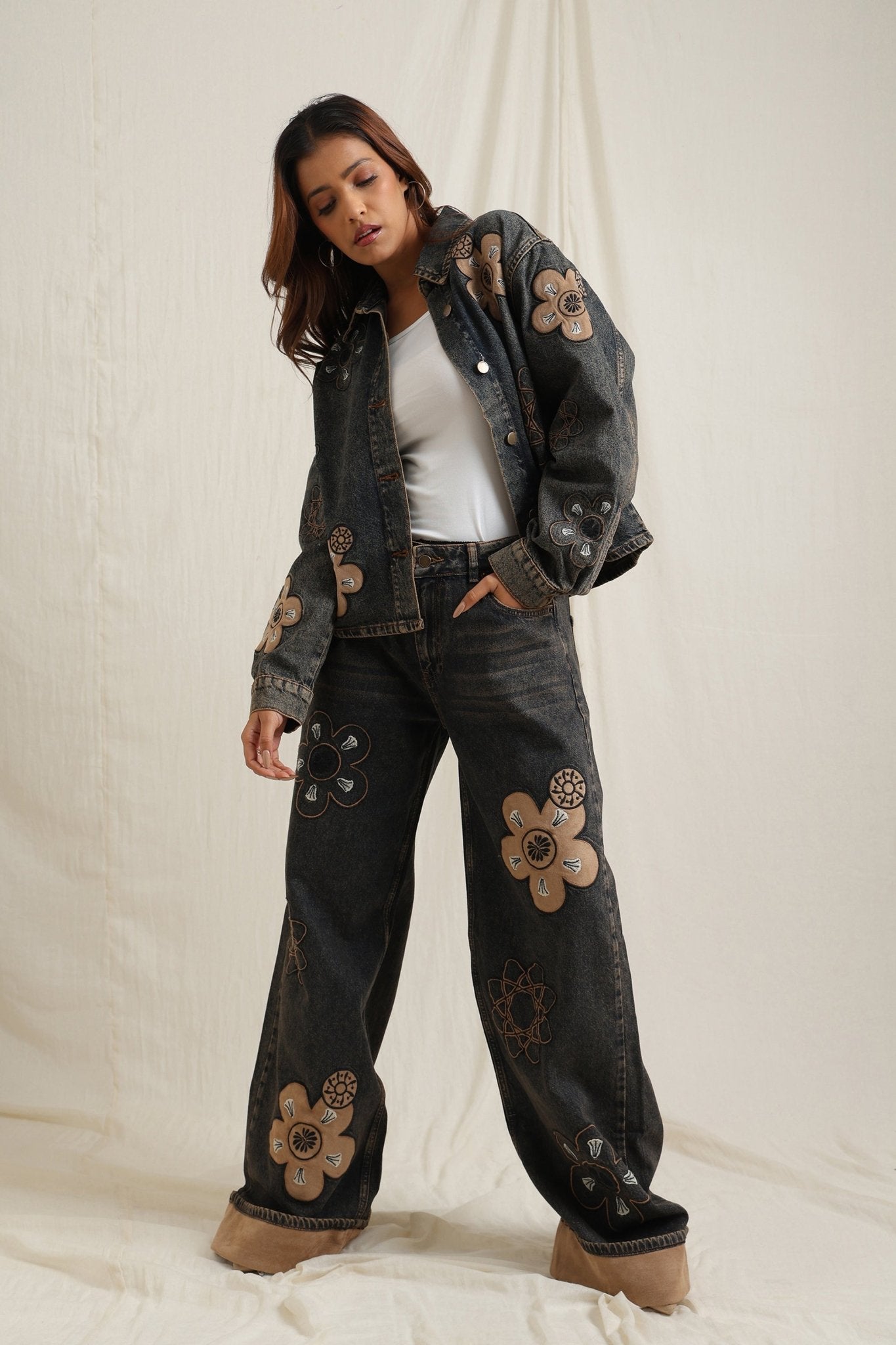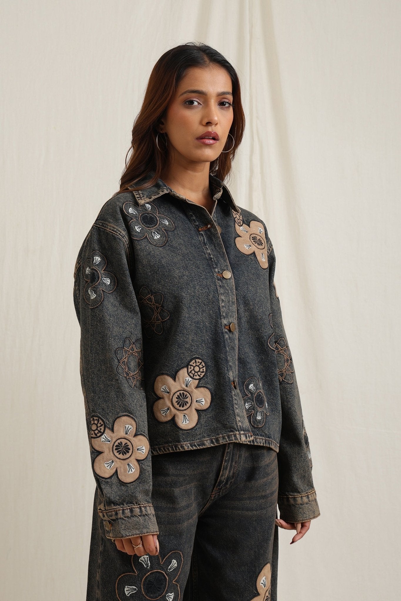 Embroidered flowery jacket featuring intricate floral detailing for a vibrant touch.