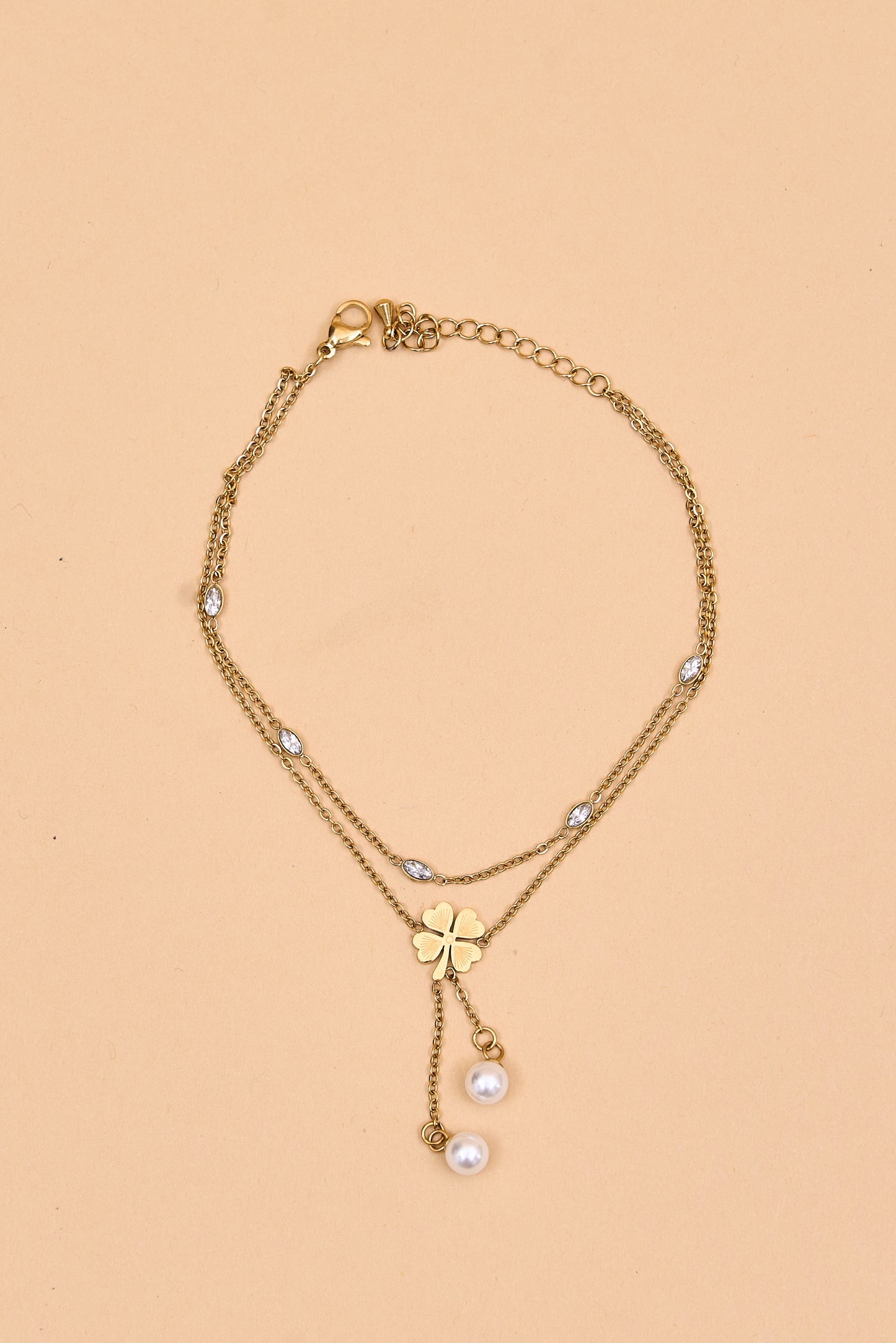 Gold bracelet with pearls and leaf clover charm.