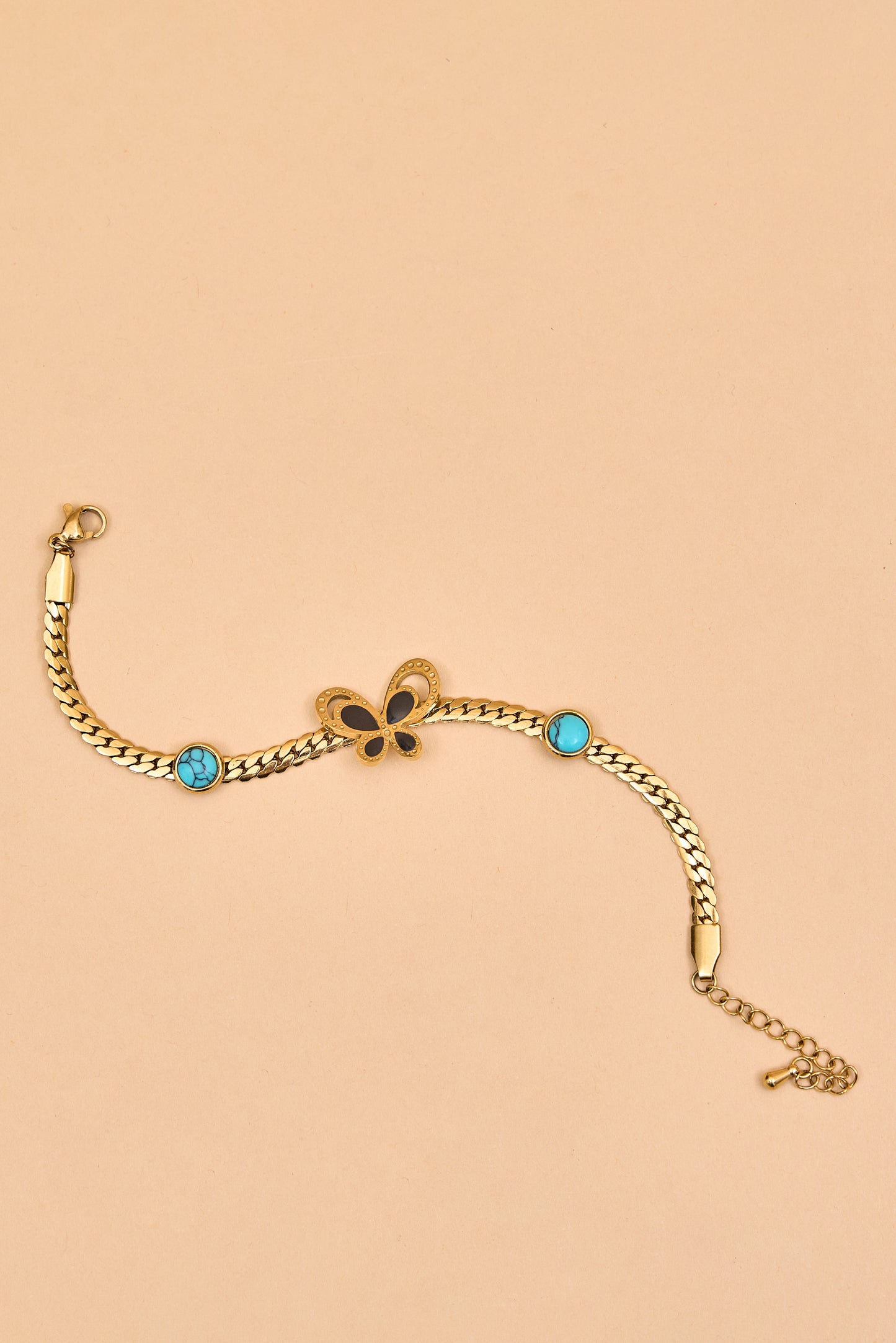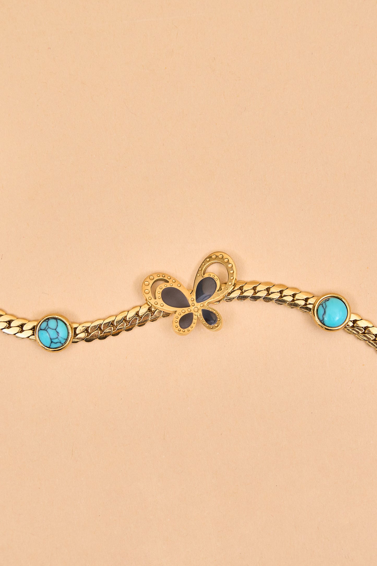 Sleek gold bracelet with butterfly center charm.