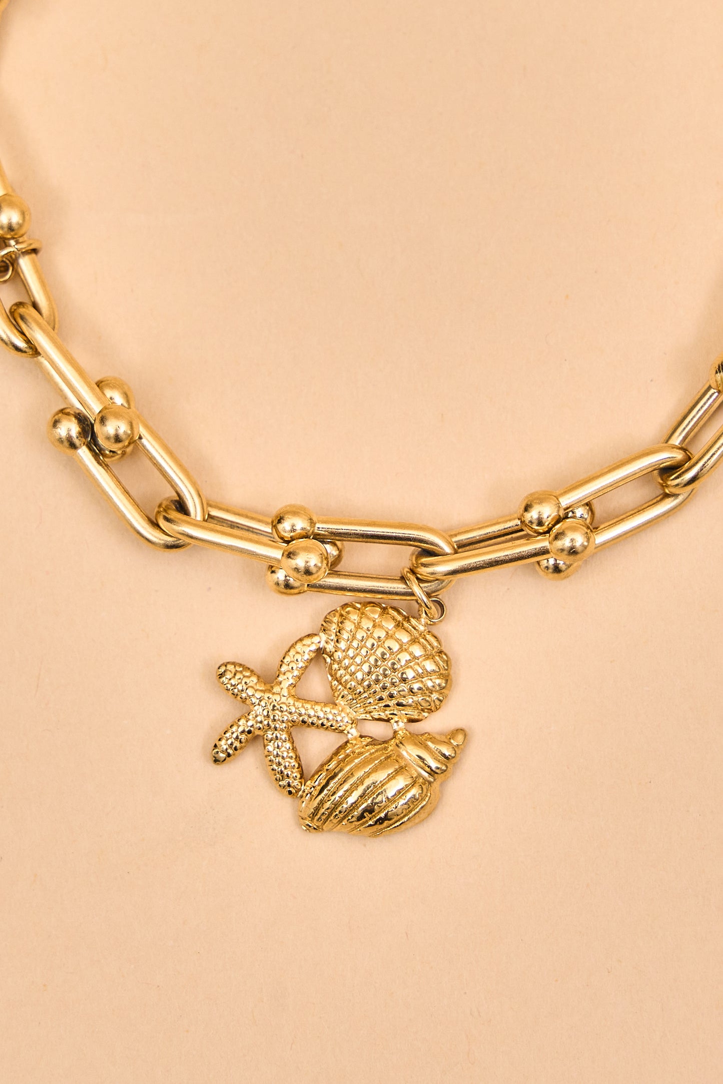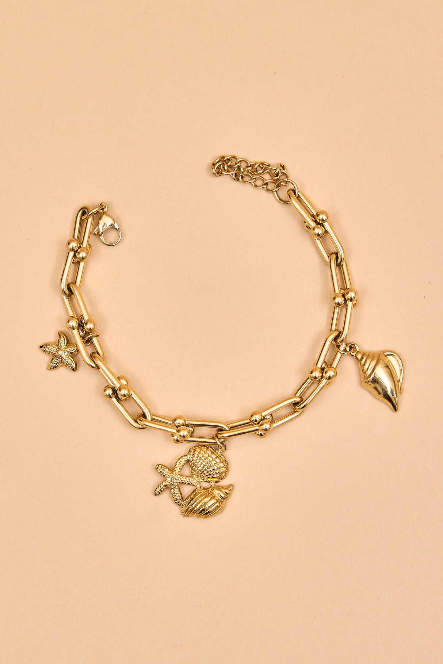 Gold charm bracelet with ocean-inspired accents.