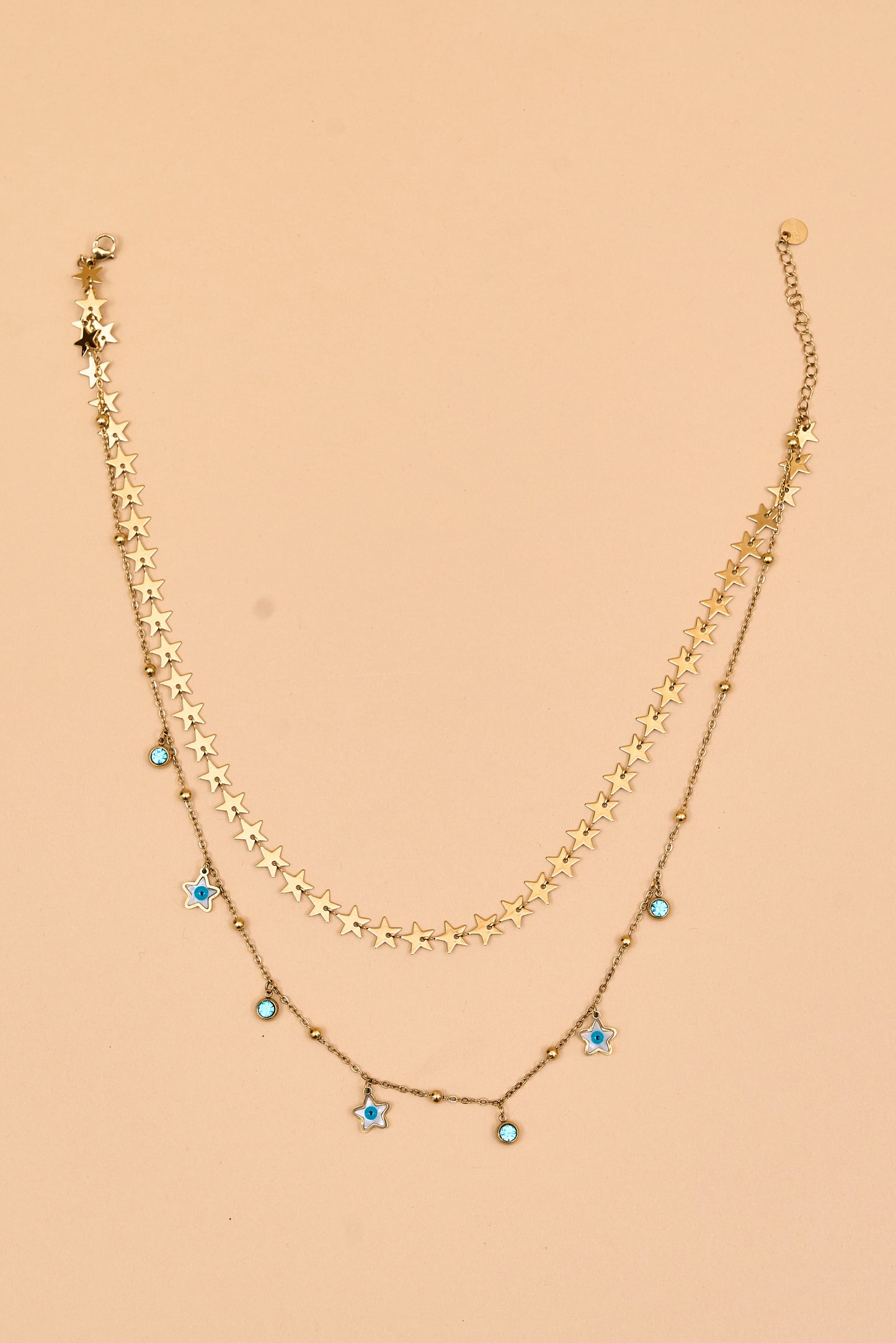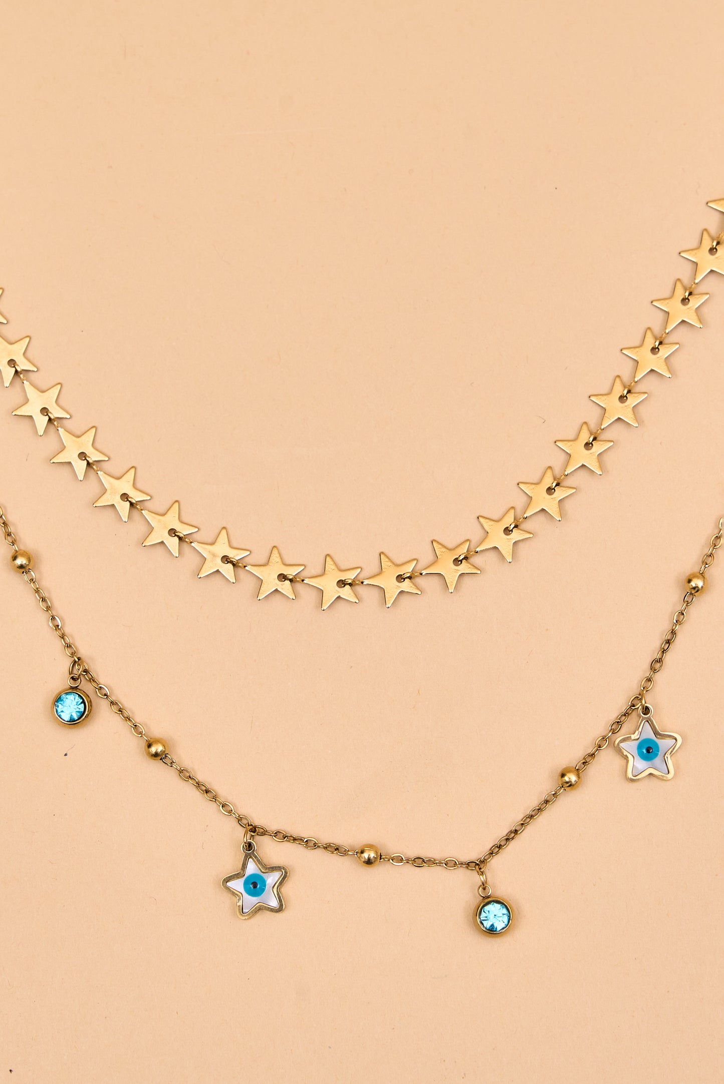 Gold layered necklace with star and hoop accents.