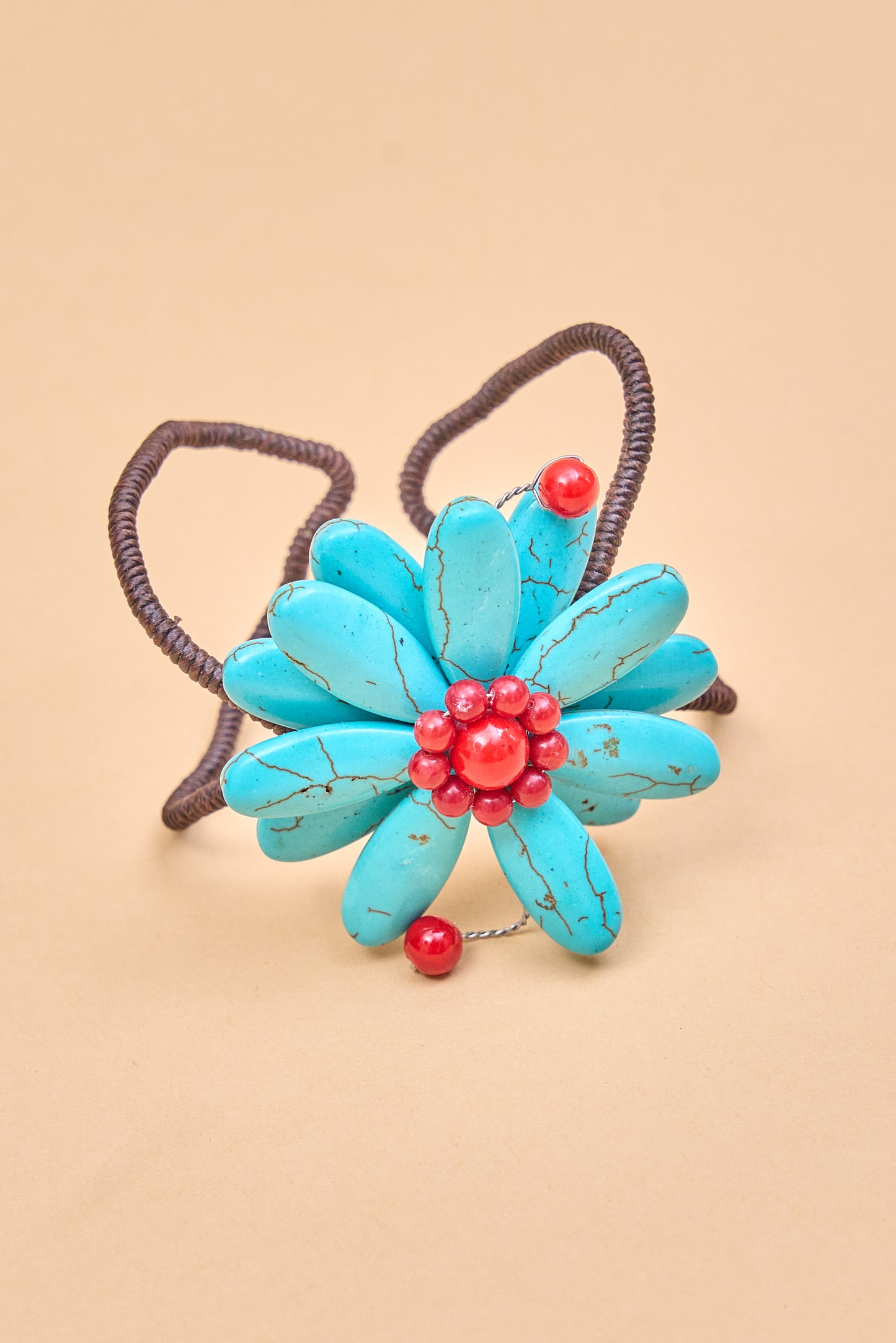 Regular price Rs. 1,050Bold flower bracelet featuring large turquoise petals and red bead center. Eye-catching and vibrant.
