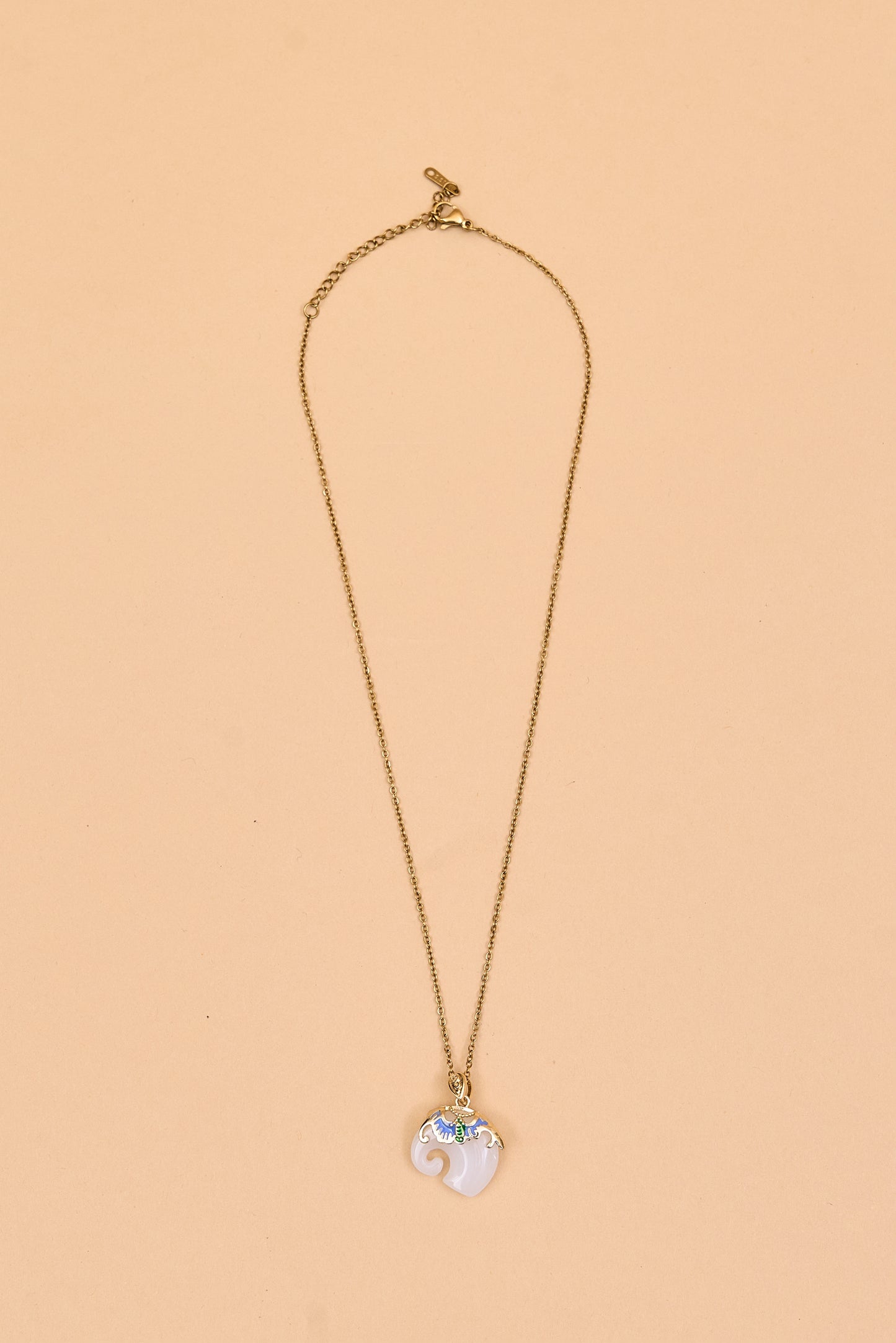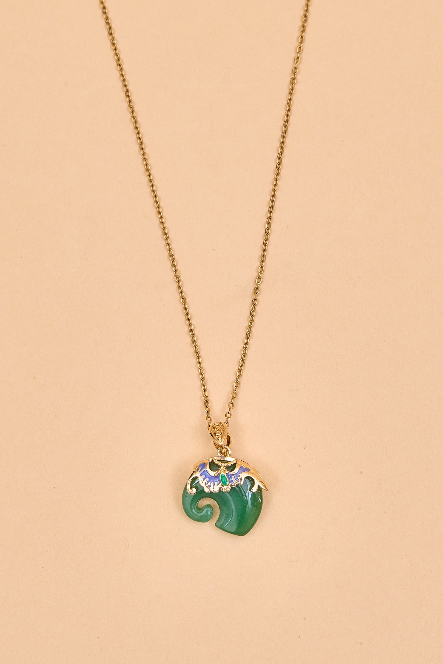 This elegant elephant necklace features a gold-toned chain with a unique pendant. The pendant is intricately shaped with smooth curves and adorned at the top with ornate gold detailing, highlighted by colorful accents. The combination of vibrant hues and rich textures gives it a luxurious, artisanal feel. Perfect as a statement piece, it blends traditional charm with contemporary elegance.