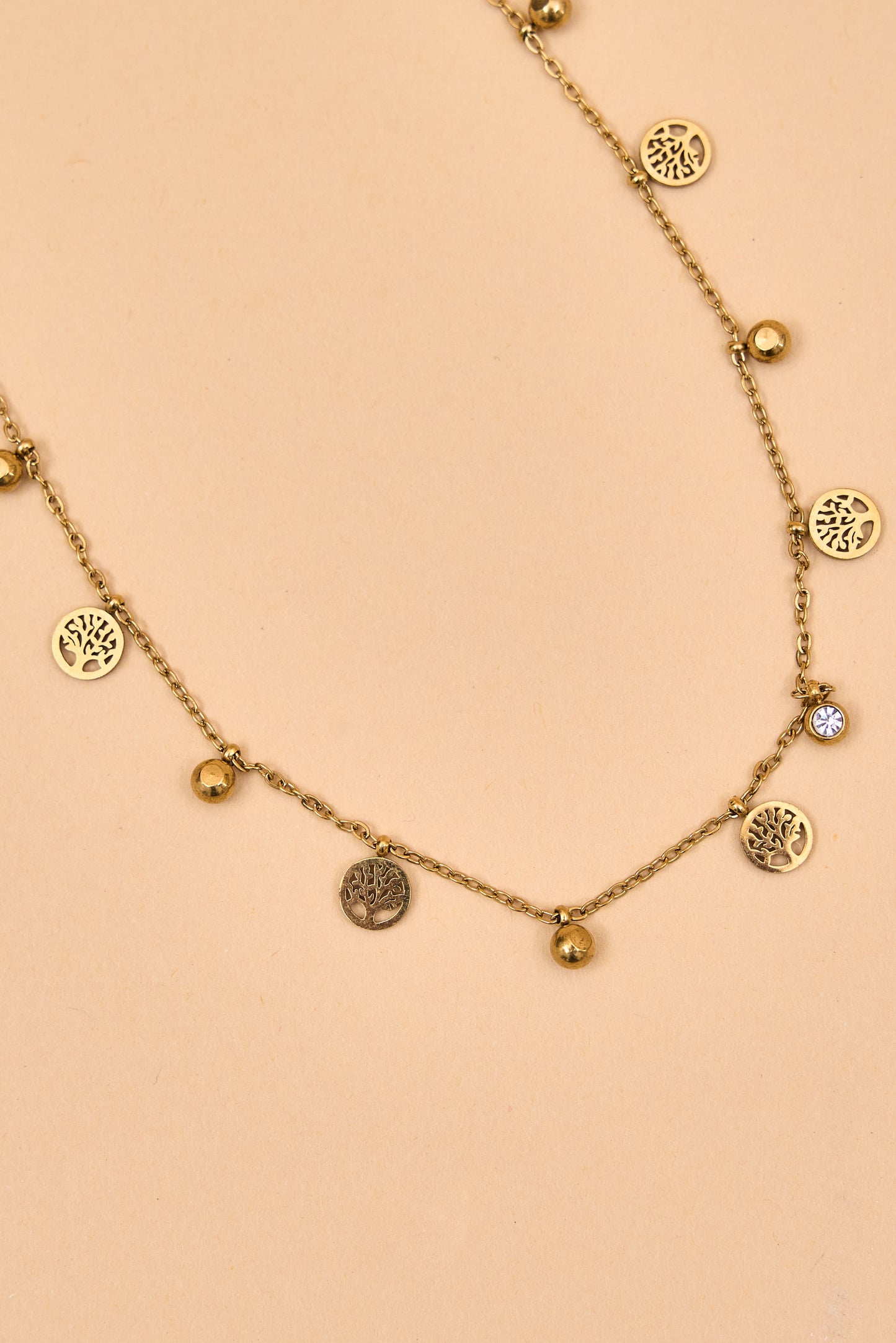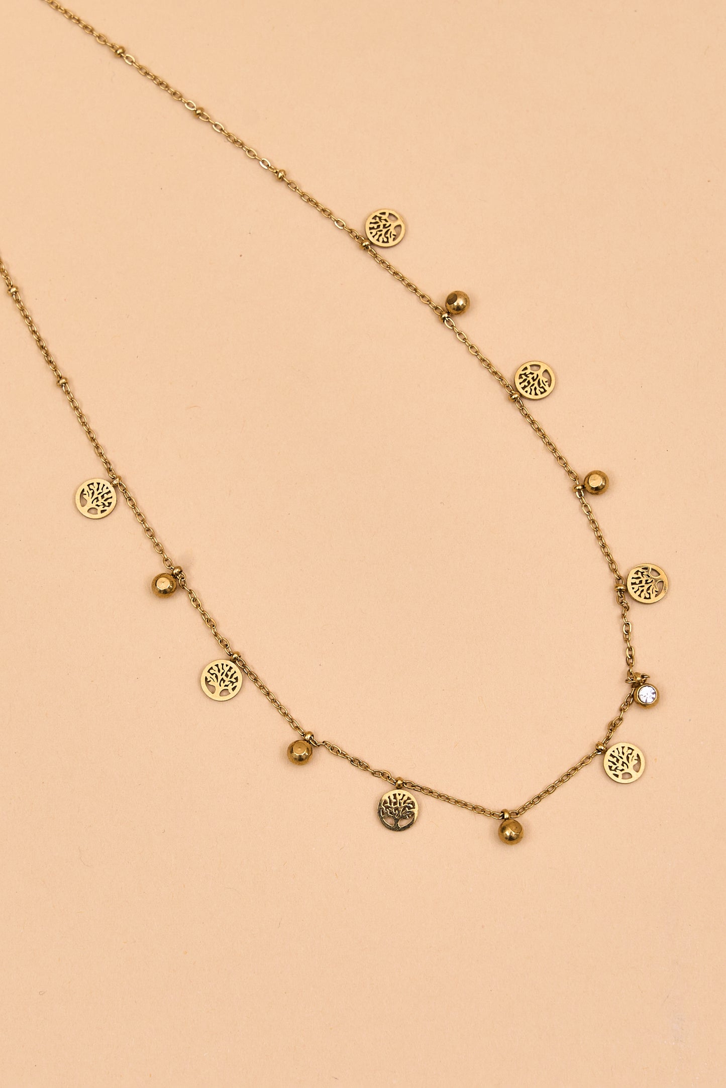 This elegant gold-toned chain features a series of delicate charms, including engraved gold discs, smooth polished discs, and sparkling crystal-like stones. The alternating textures and finishes add visual interest while maintaining a refined, minimal aesthetic. Lightweight and versatile, itês ideal for adding a subtle touch of charm to both casual and dressy looks.