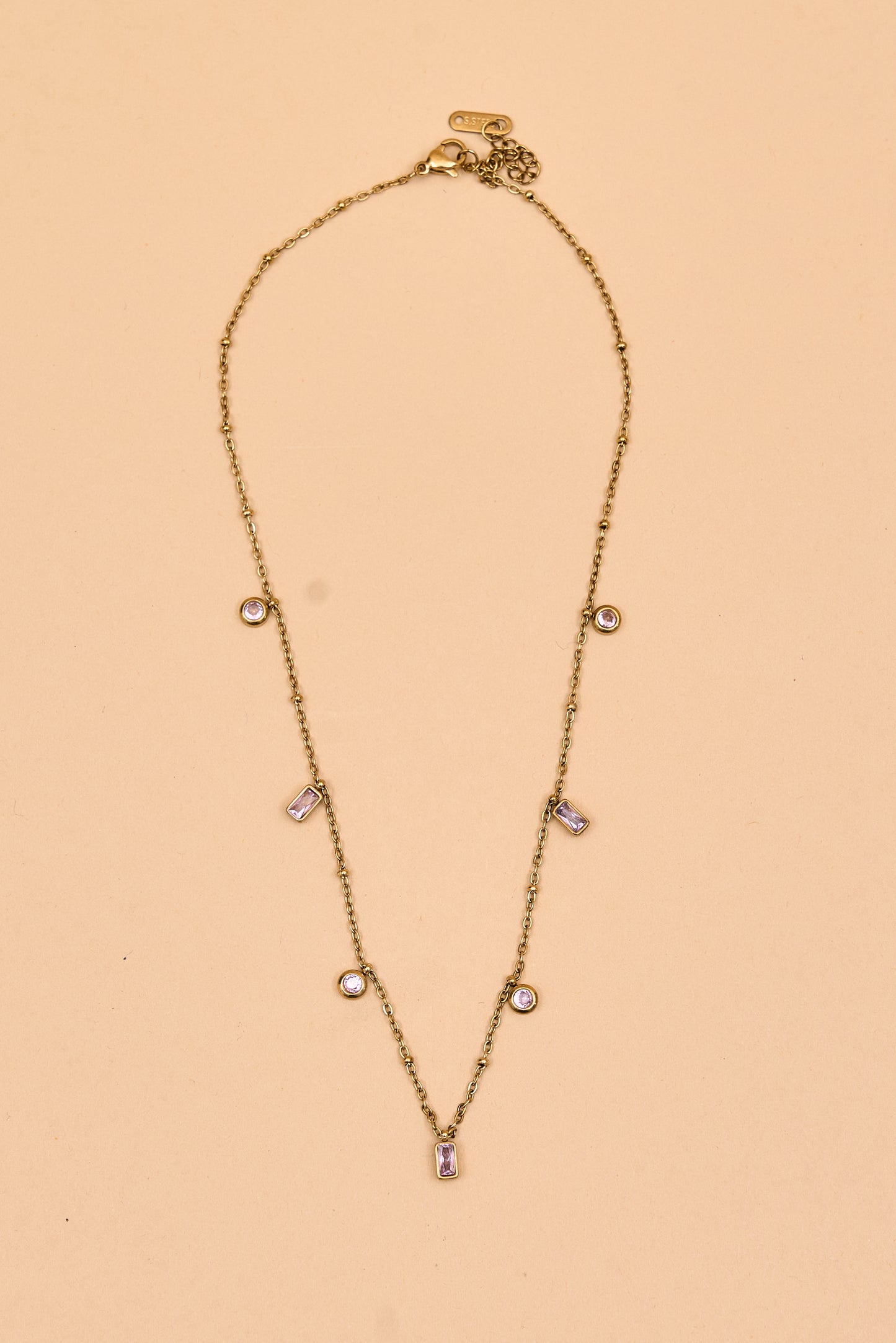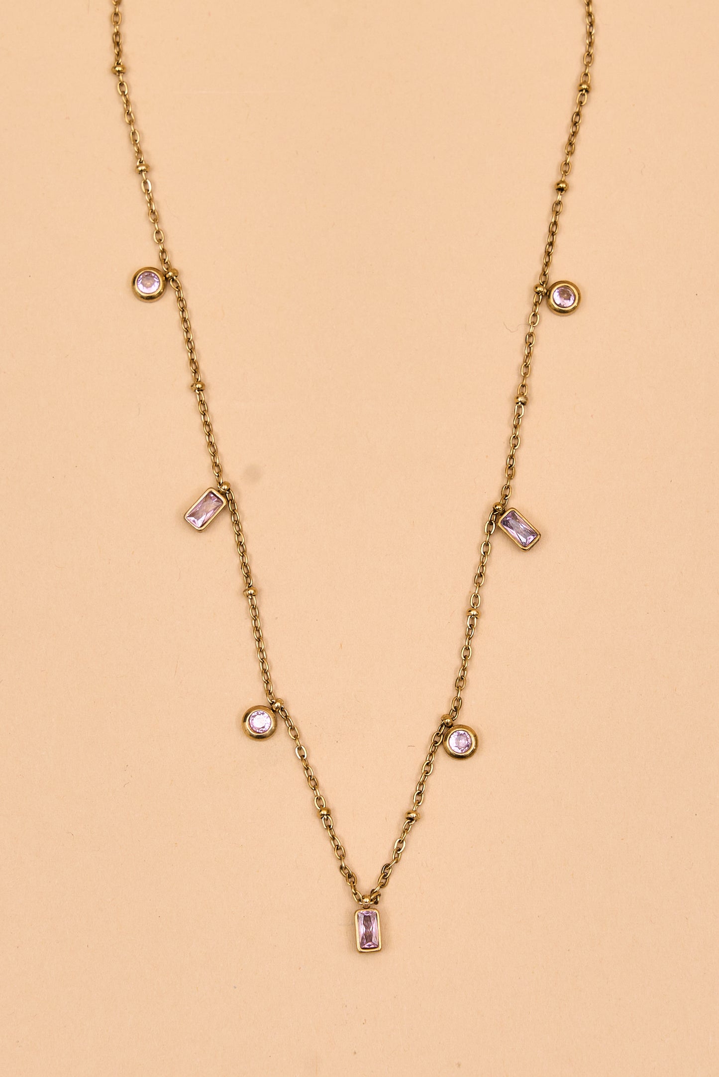 This delicate gold-toned chain features small, unique charms in varied geometric shapes, each adorned with a subtle crystal accent. The design alternates between open rectangular links and spiral motifs, creating a modern yet understated look. Lightweight and refined, itês perfect for everyday wear or layering for added style.