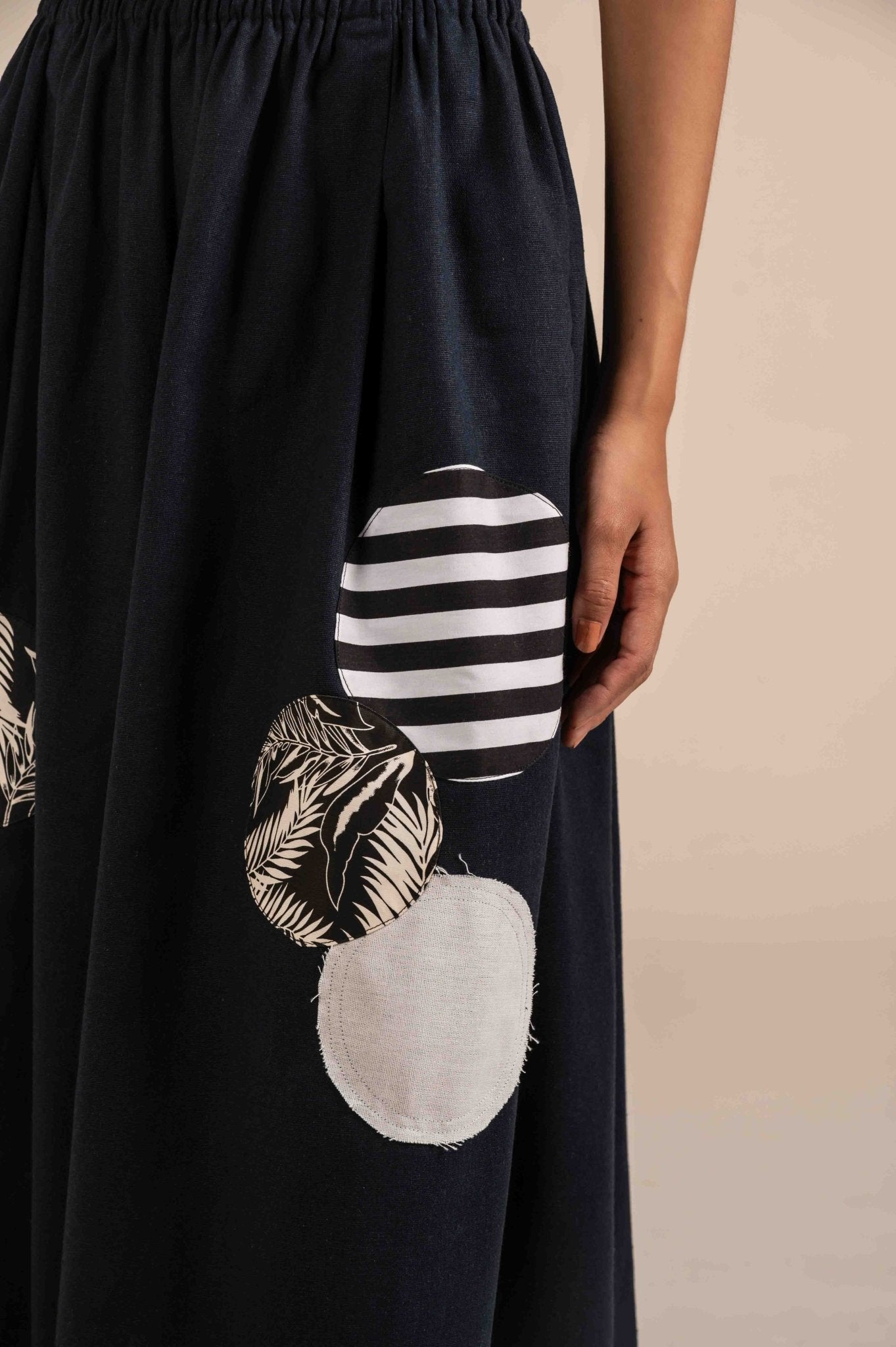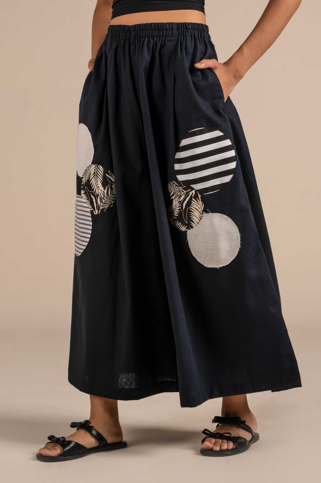 These navy blue wide-leg pants feature a relaxed fit with a comfortable elastic waistband for all-day ease. The design is elevated with bold circular appliqués in monochrome patterns, including stripes, solids, and abstract prints, creating a modern, artistic look. Crafted from a smooth, lightweight fabric, they offer both comfort and statement style. Perfect for pairing with simple tops to highlight the unique detailing.