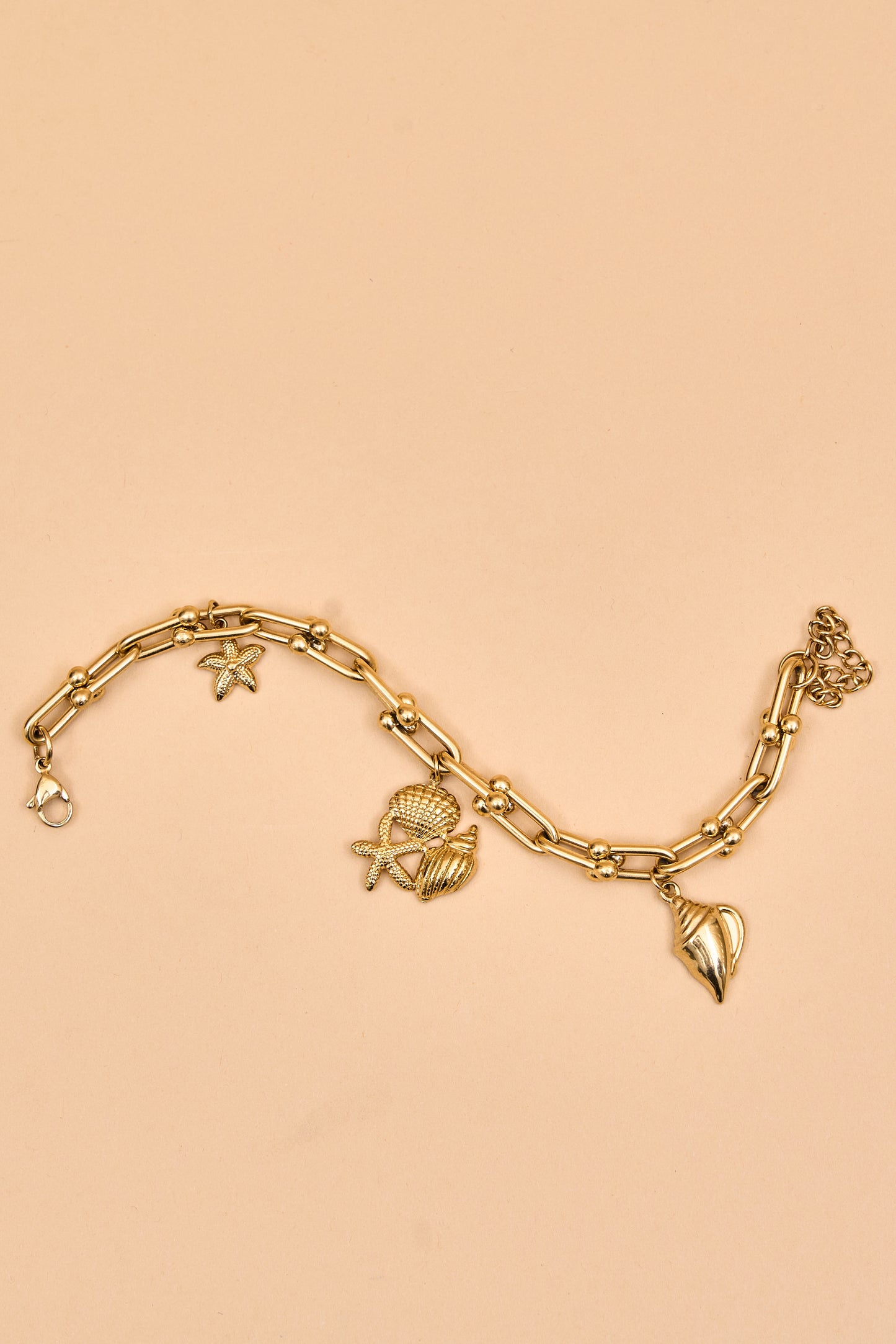 Gold charm bracelet with ocean-inspired accents.
