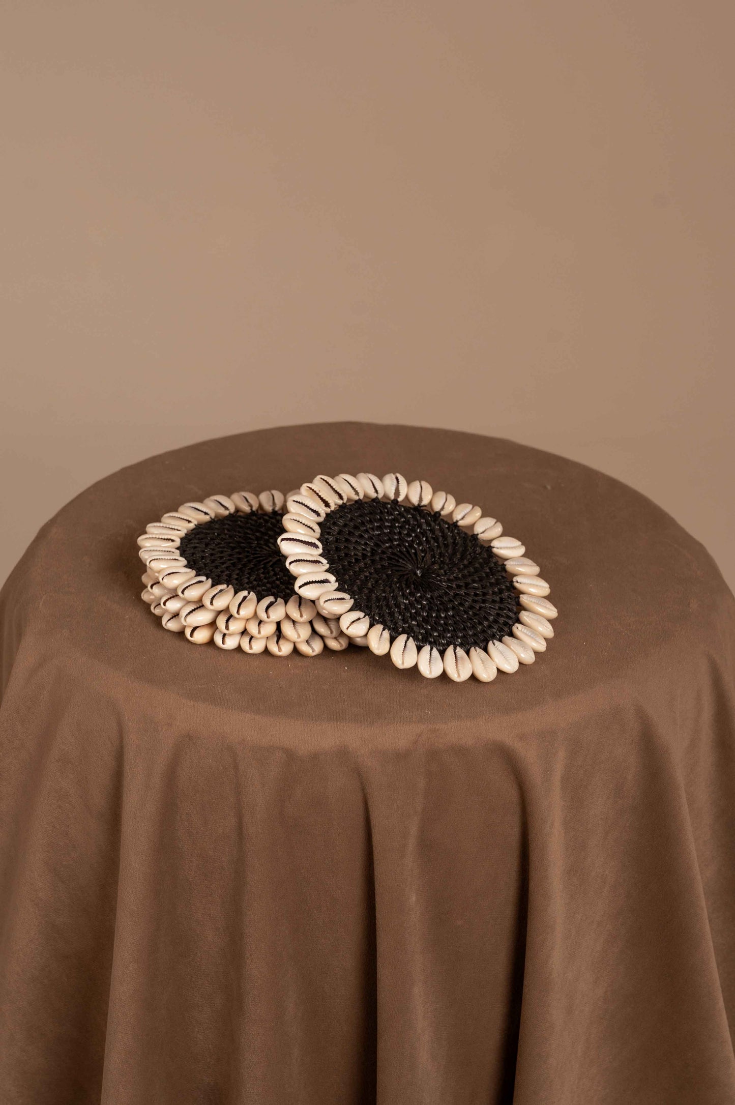 Regular price Rs. 480A handcrafted round coaster with black jute center and a border of shells. Adds a coastal charm to your coffee table