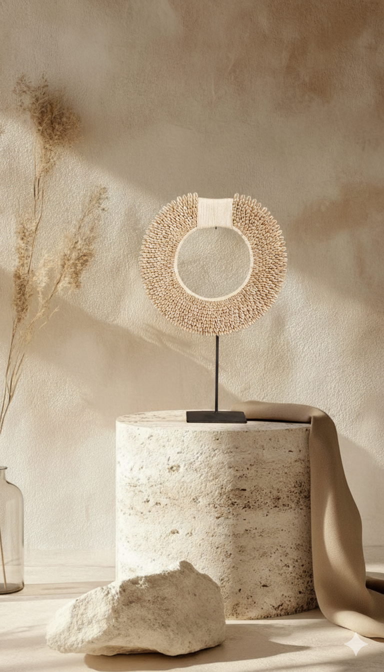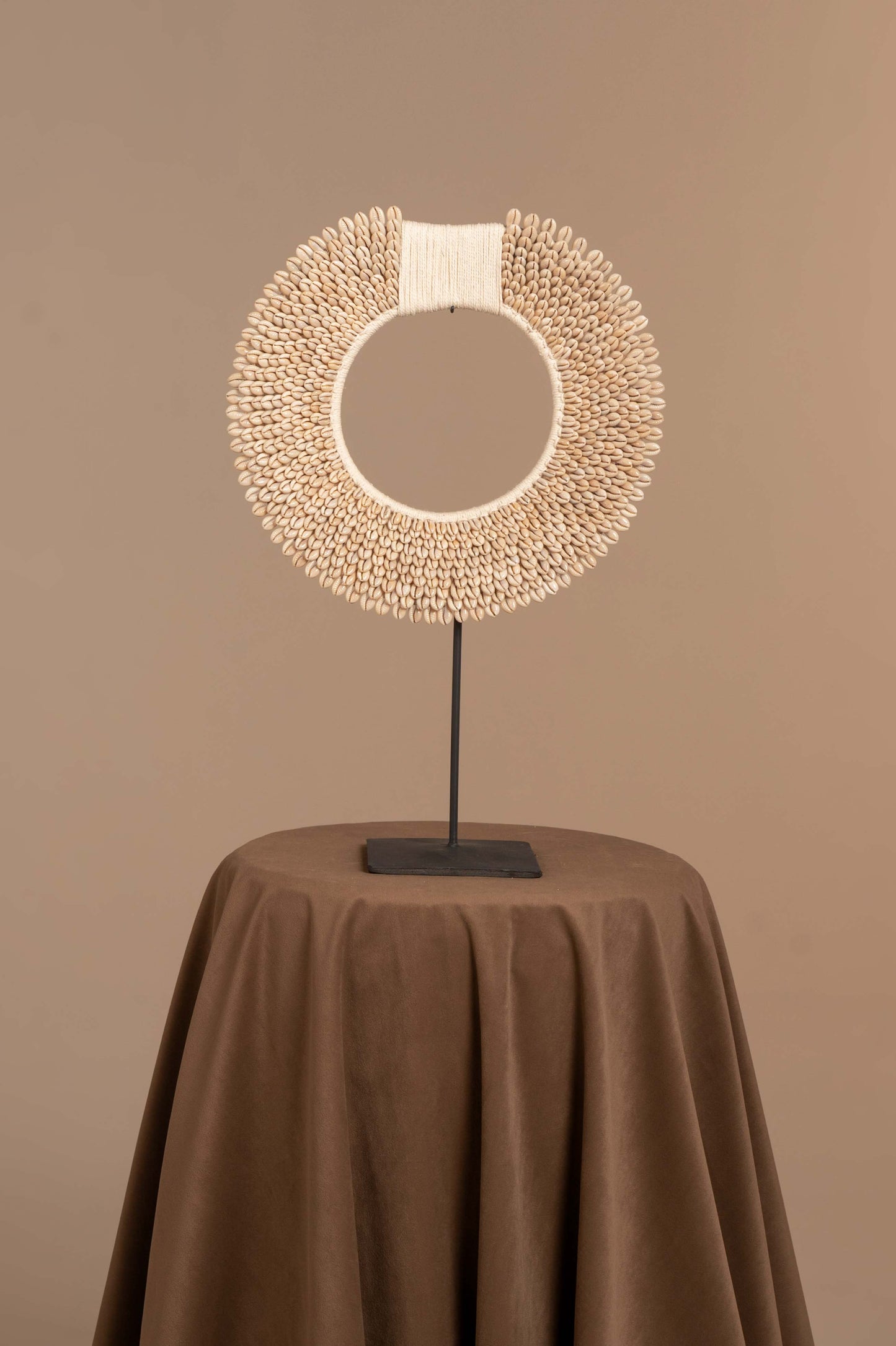 A round tabletop ringed with small cowrie shells and macrame details. A standout boho accent for any flat surface