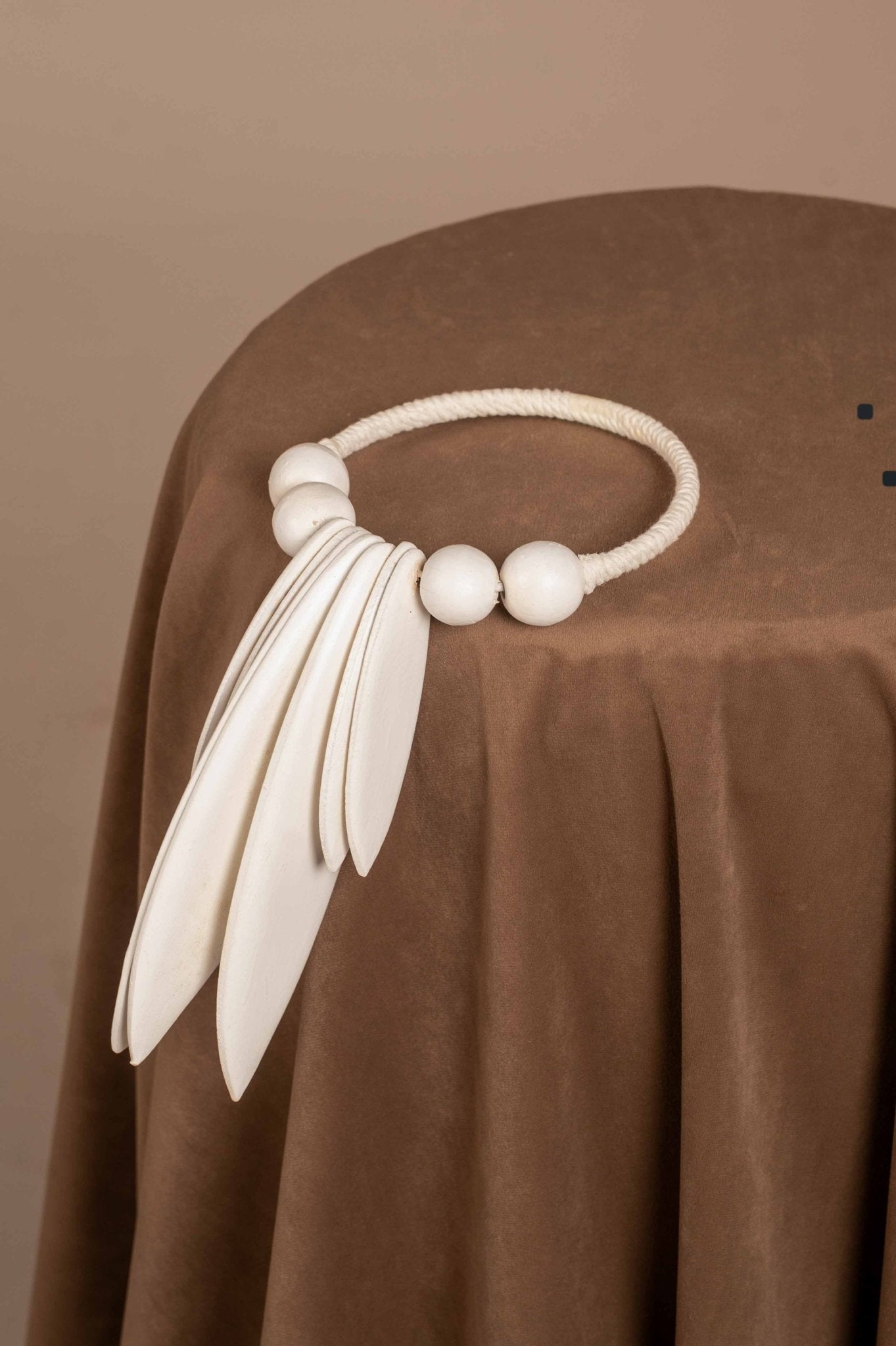 Regular price Rs. 900A modern boho wall hanging featuring white wooden beads and leaf-like drops. Perfect for adding a soft, artisanal touch to small spaces.