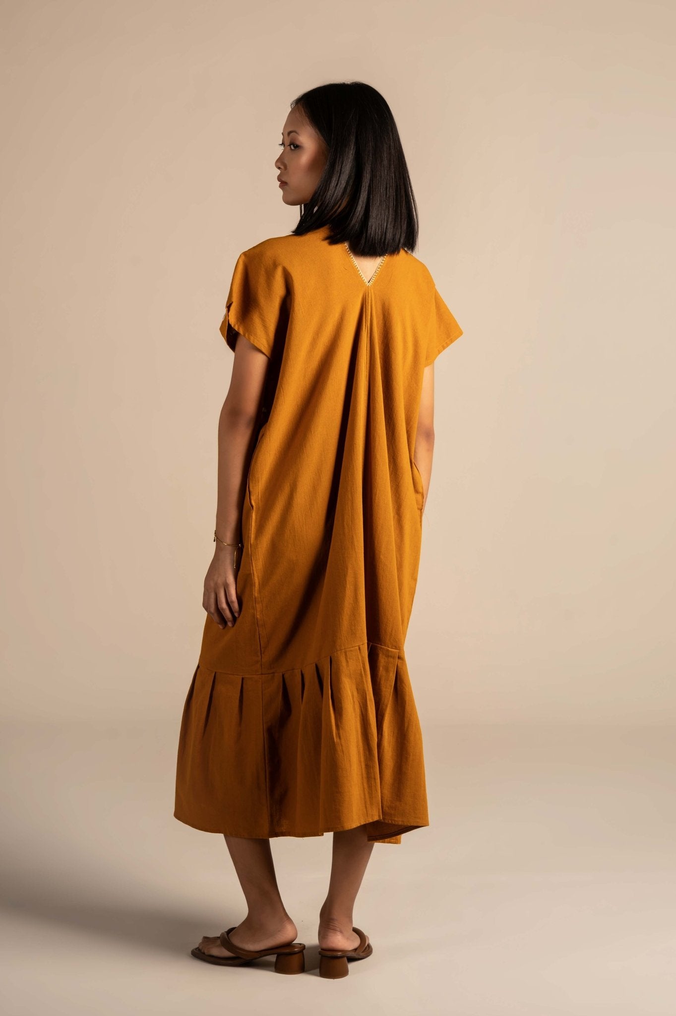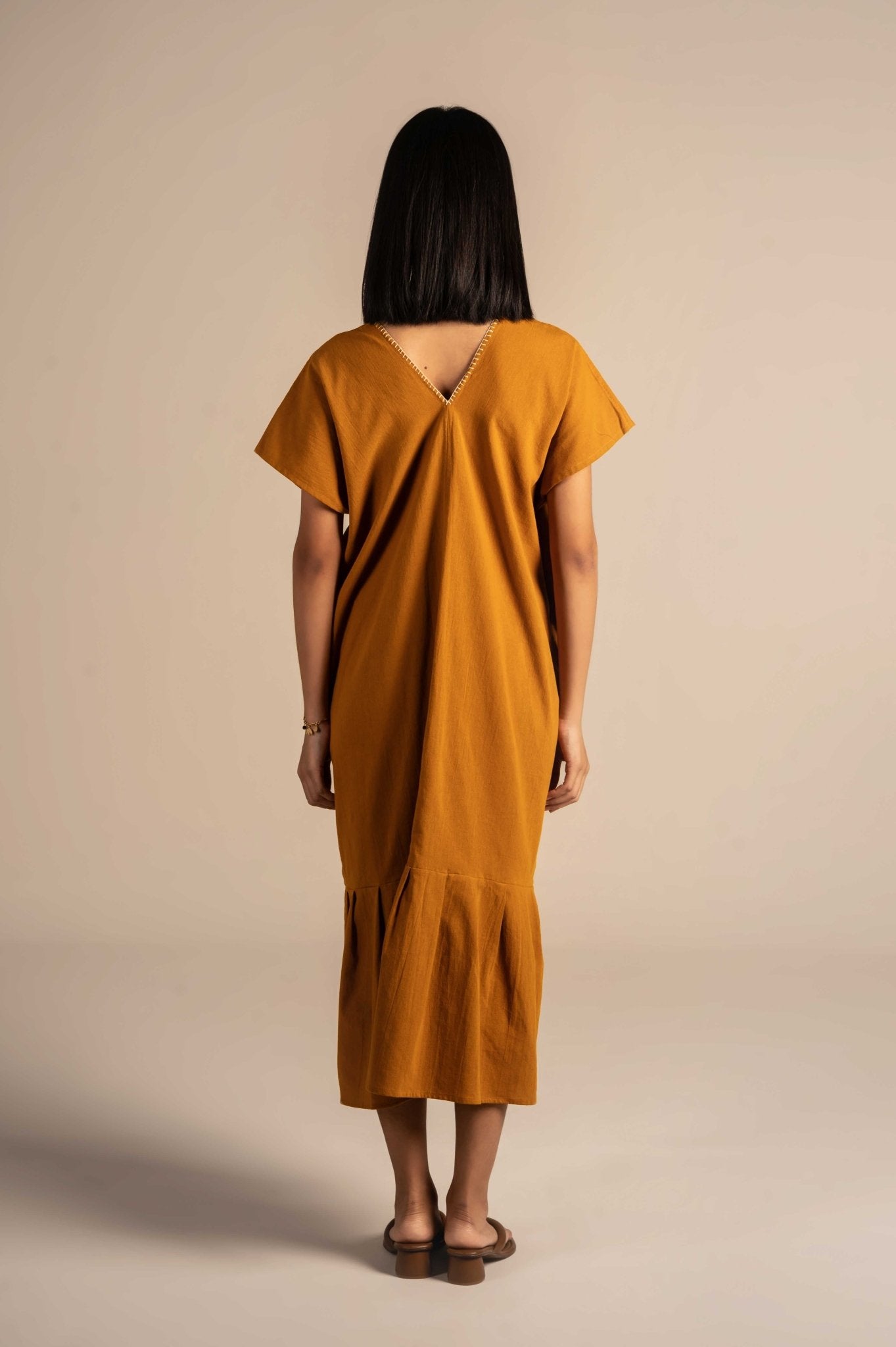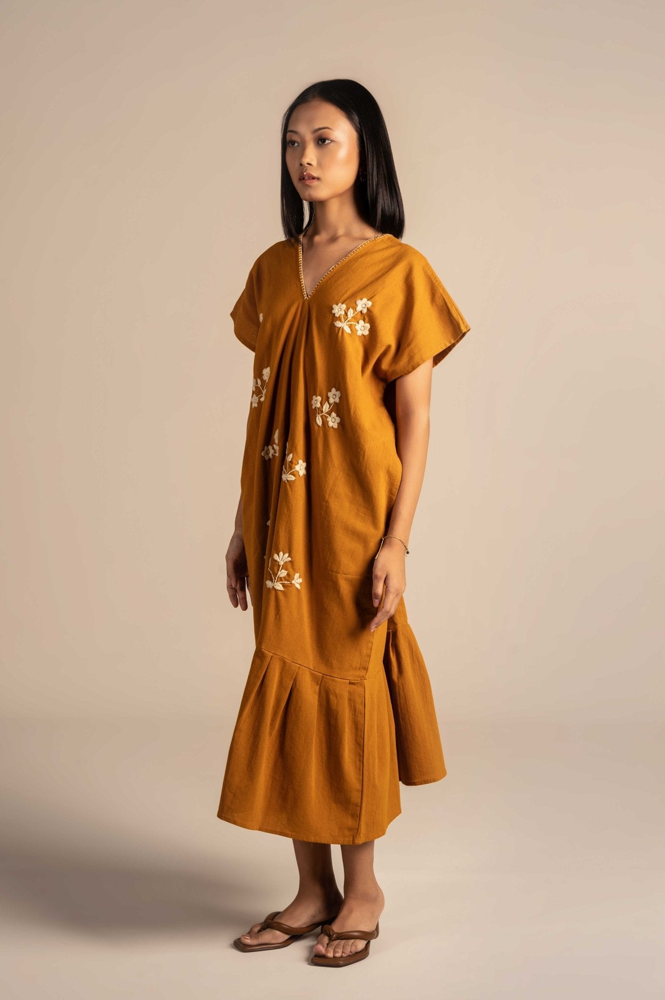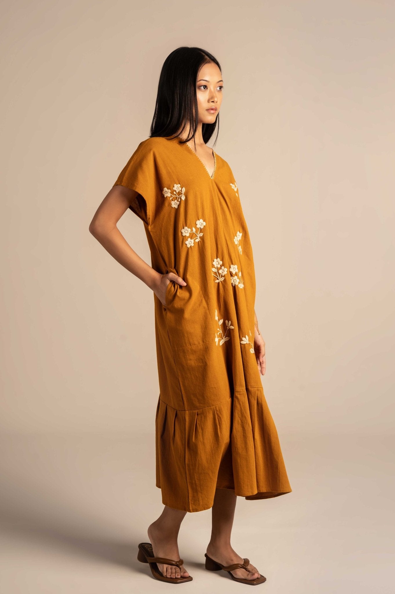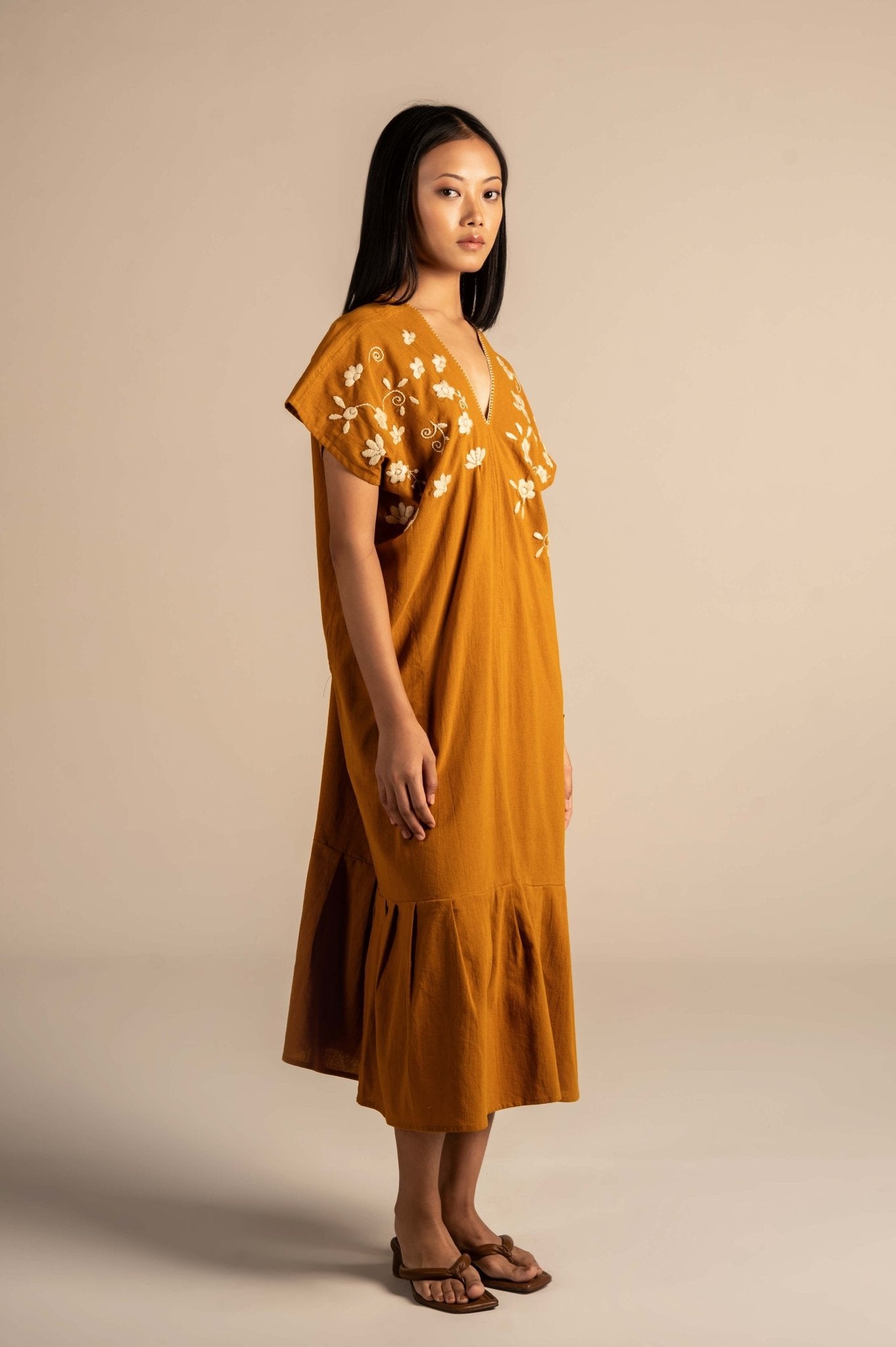 Flowy and relaxing dress features delicate white floral embroidery around the neckline, adding a touch of charm to its minimalist design. Made from breathable fabric with a relaxed fit, it's perfect for warm days, casual outings, or laid-back gatherings.The embroidery features finely detailed flowers, adding depth and elegance to the otherwise solid fabric.