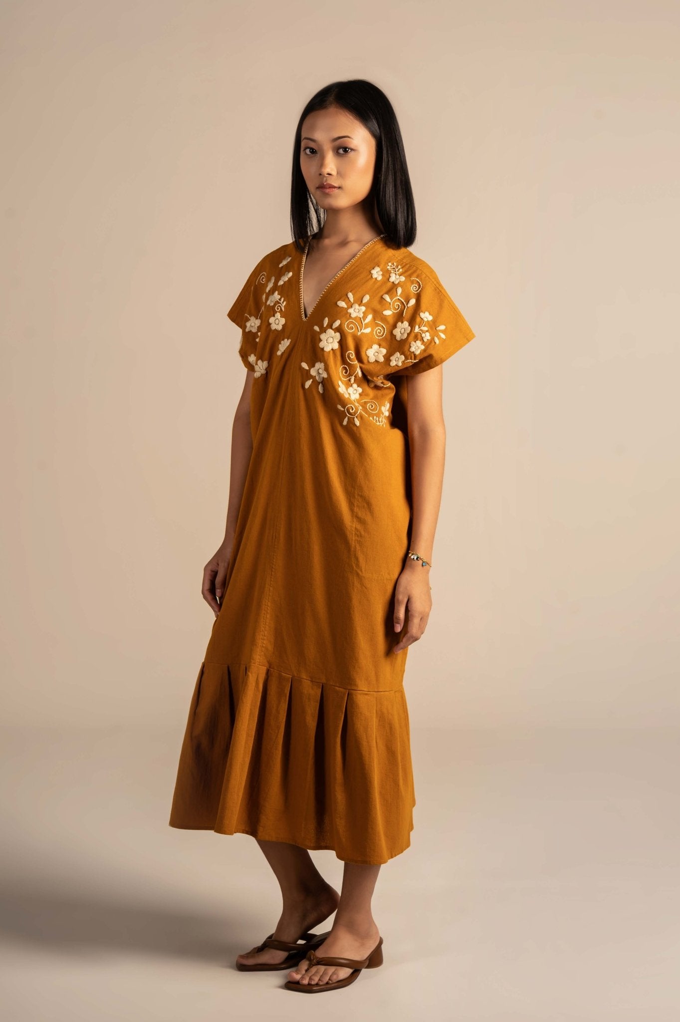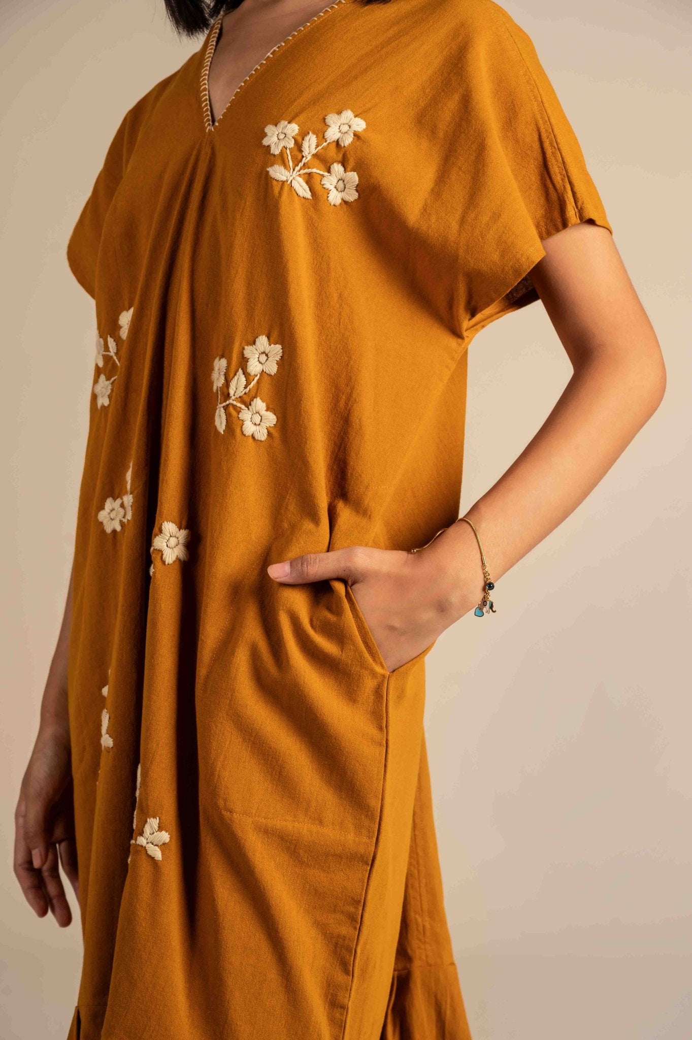 Half sleeves dress with white floral embroidery detailing