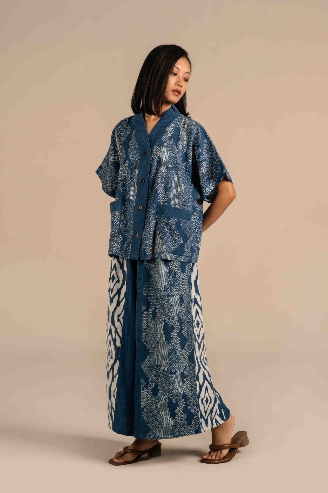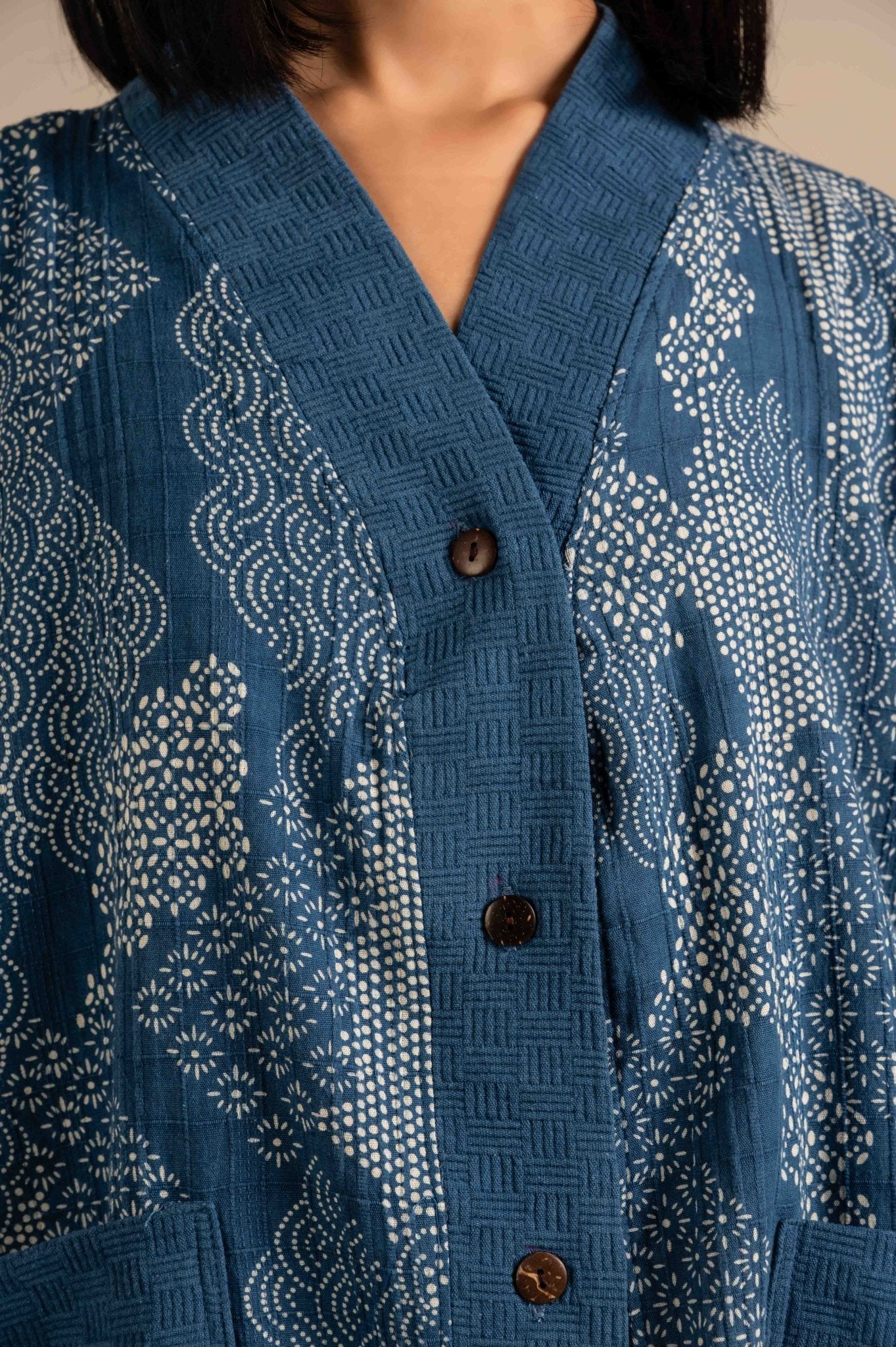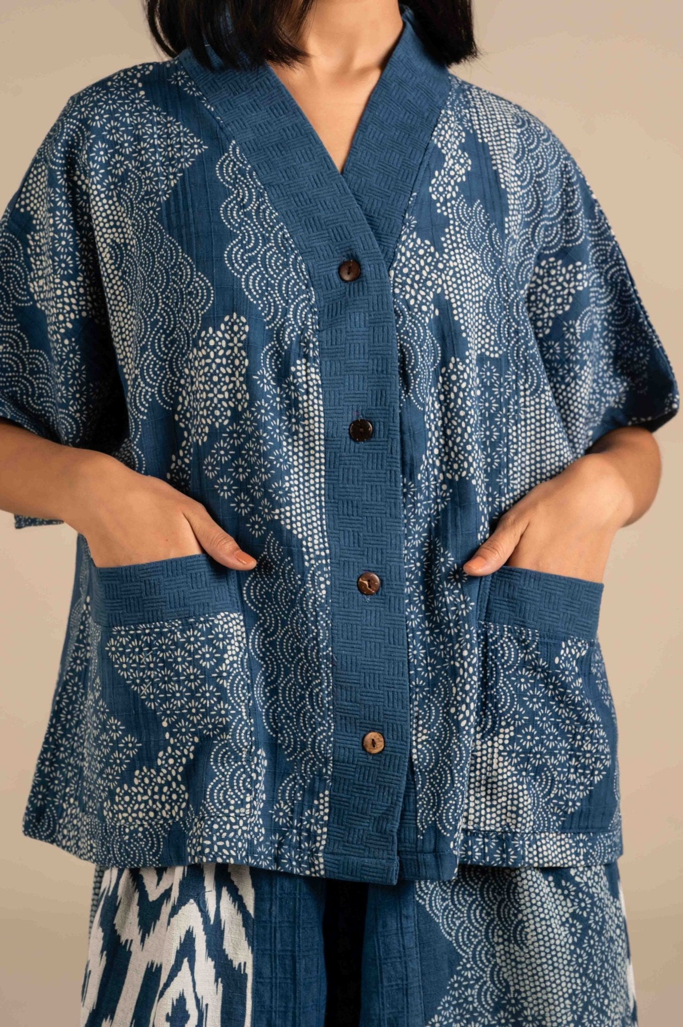 This indigo blue shirt features a patchwork design combining floral, micro prints for a vibrant, artisanal look. Half sleeves and relaxed fit offer casual comfort, while the tie-up detail at the hem adds a playful touch. Crafted from soft, breathable fabric, it blends traditional patterns with modern styling. Perfect for pairing with denims or linen pants for a chic, boho vibe.