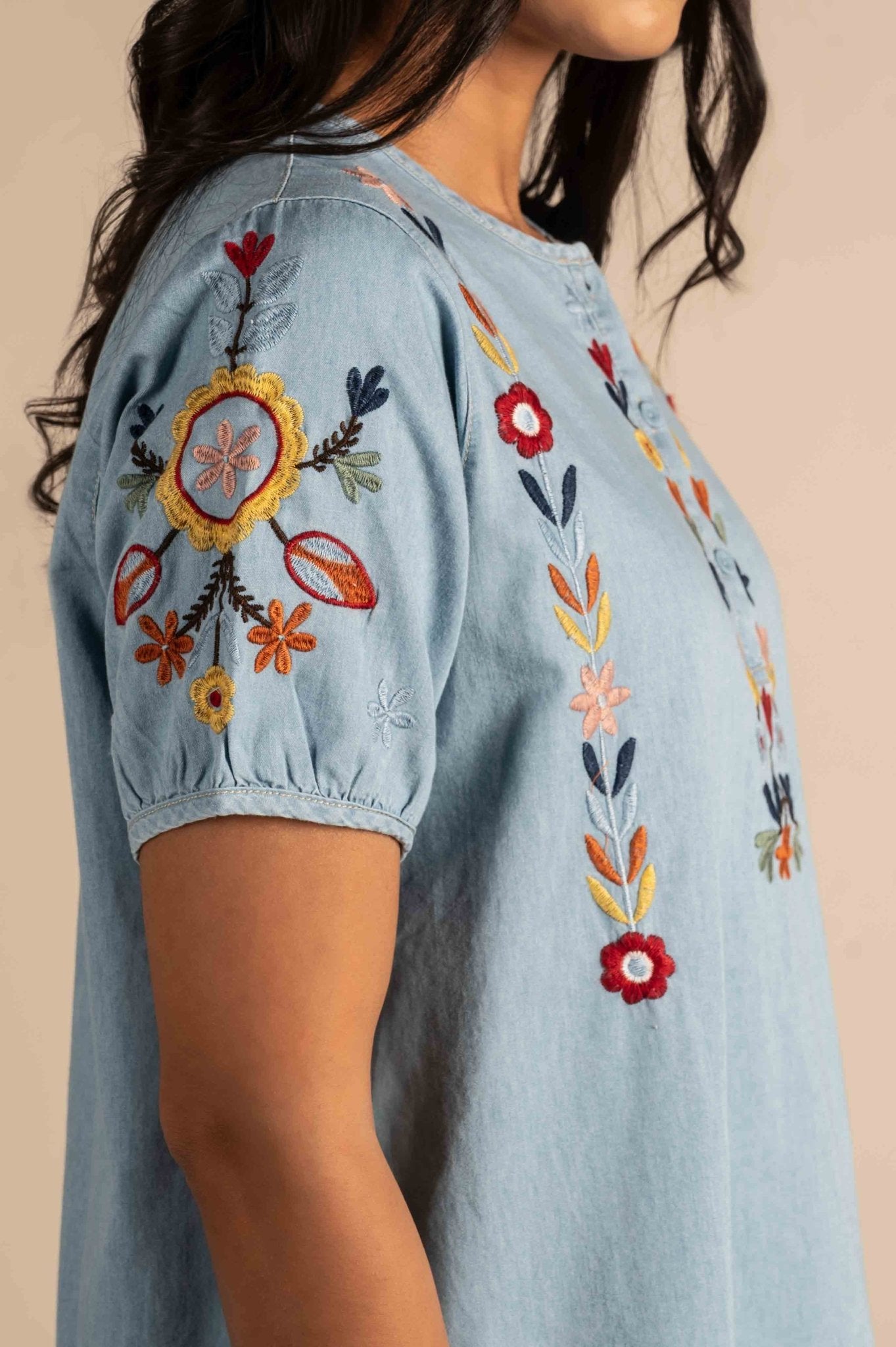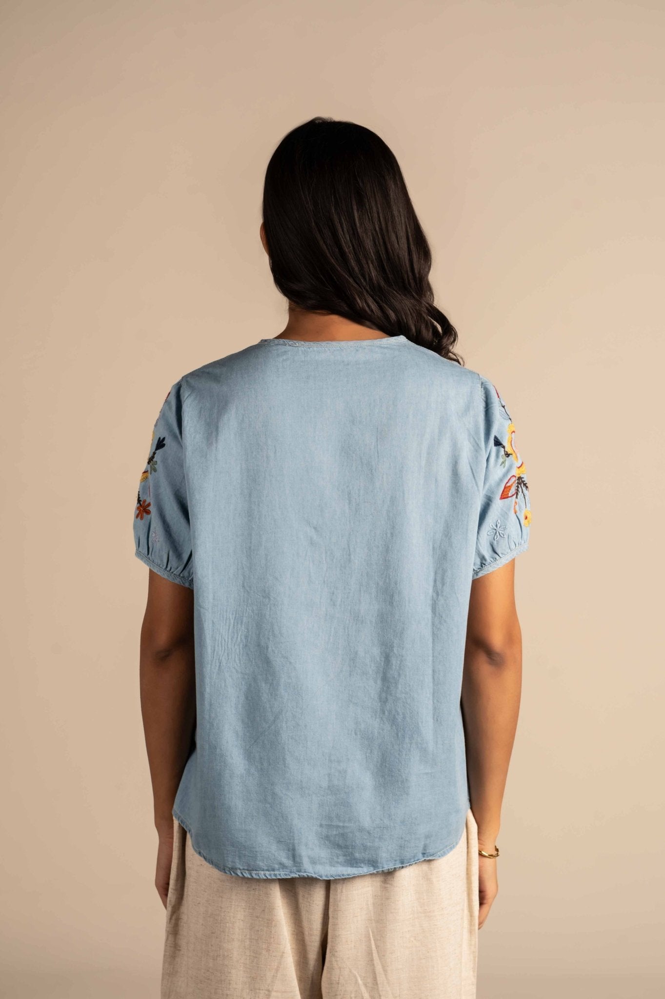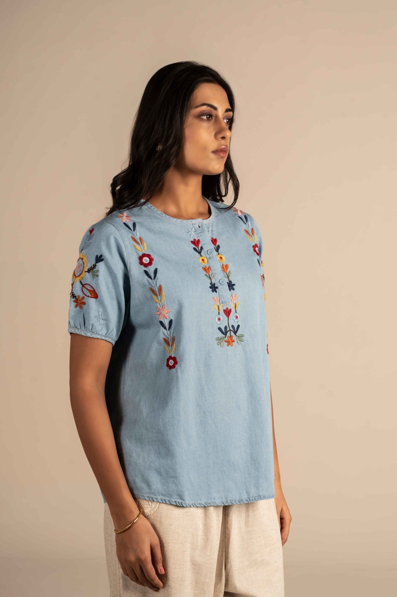 Chic and feminine top with full sleeves, a button-down front, and delicate floral embroidery. Perfect for adding charm to any outfit