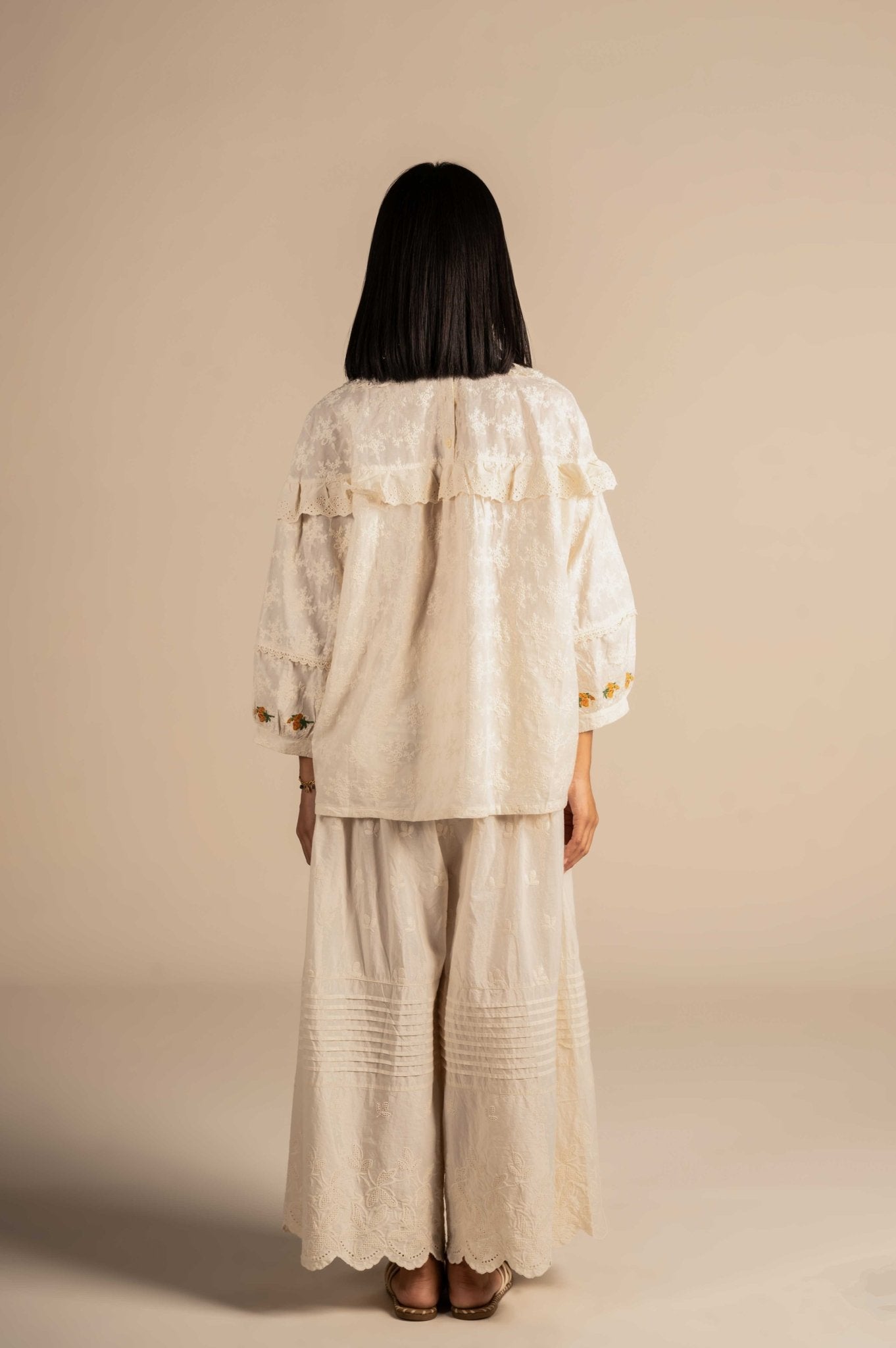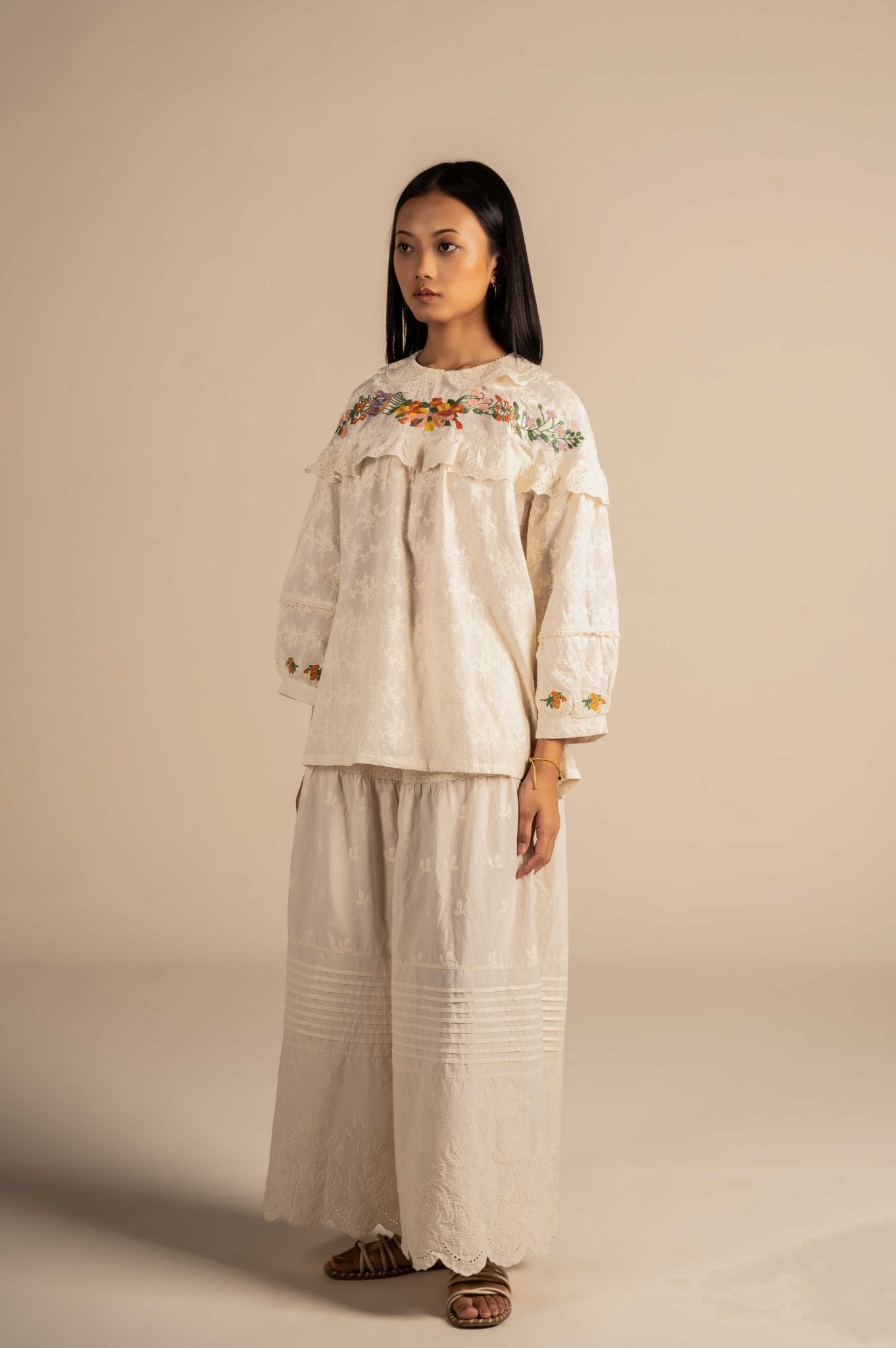 Delicate and elegant full-sleeve top is adorned with intricate lace and floral embroidery, adding a soft, sophisticated touch. Perfect for a refined, feminine look.