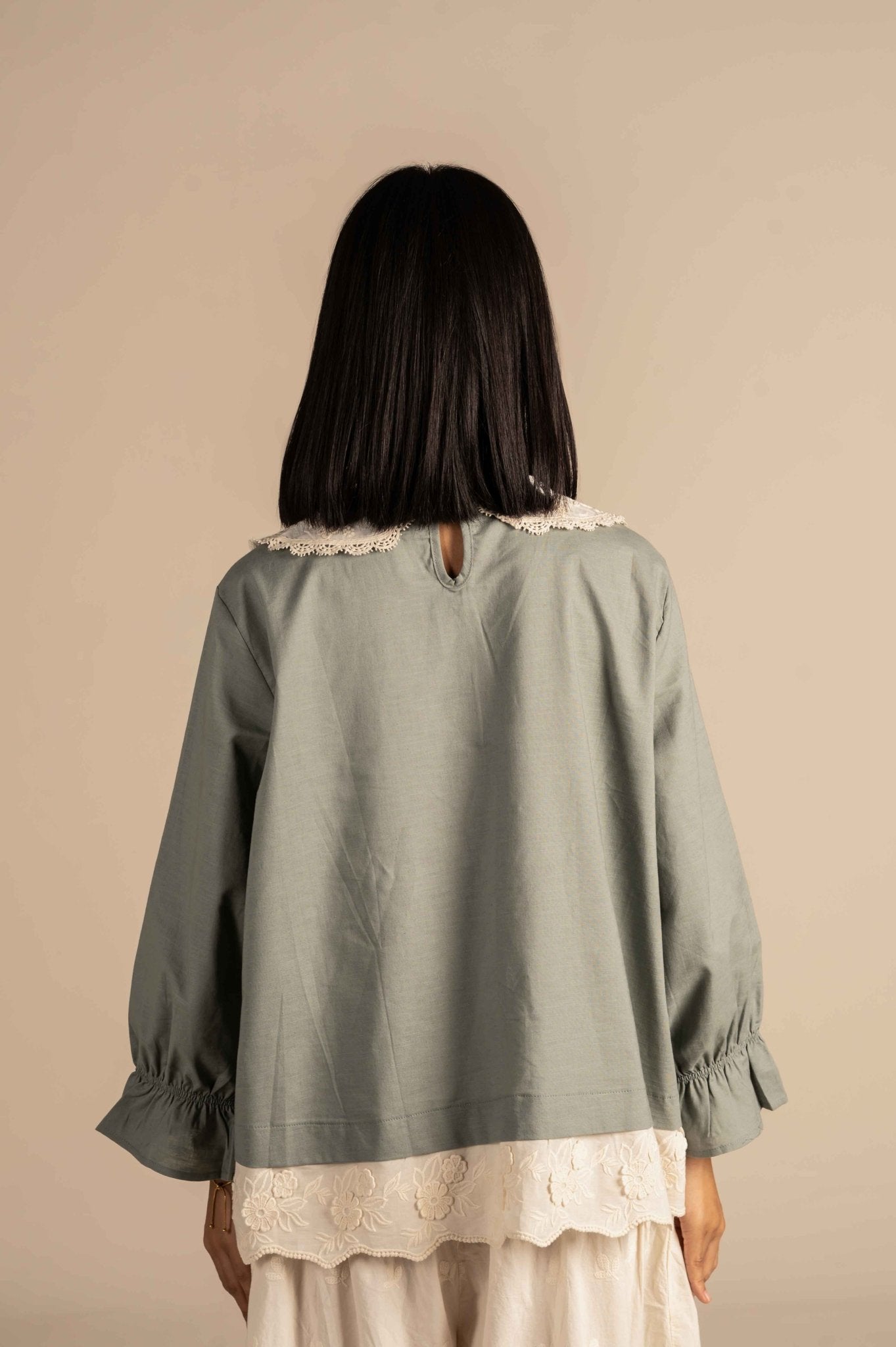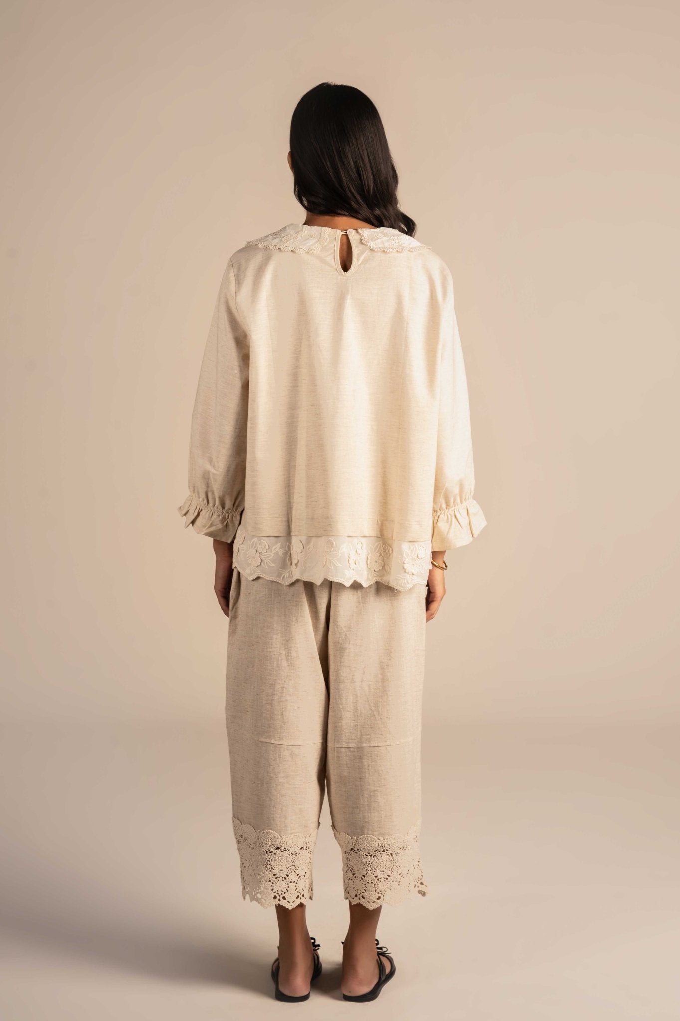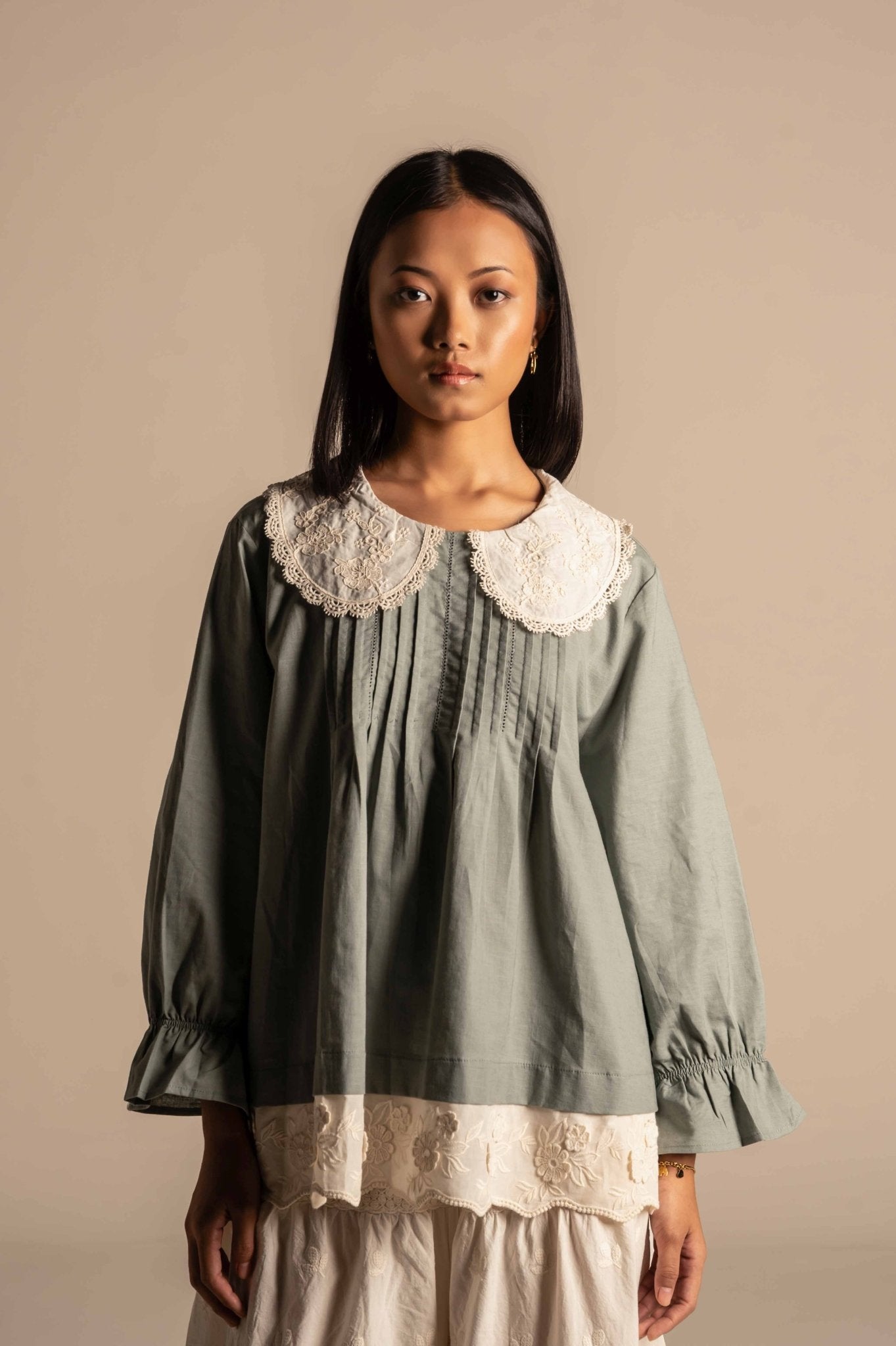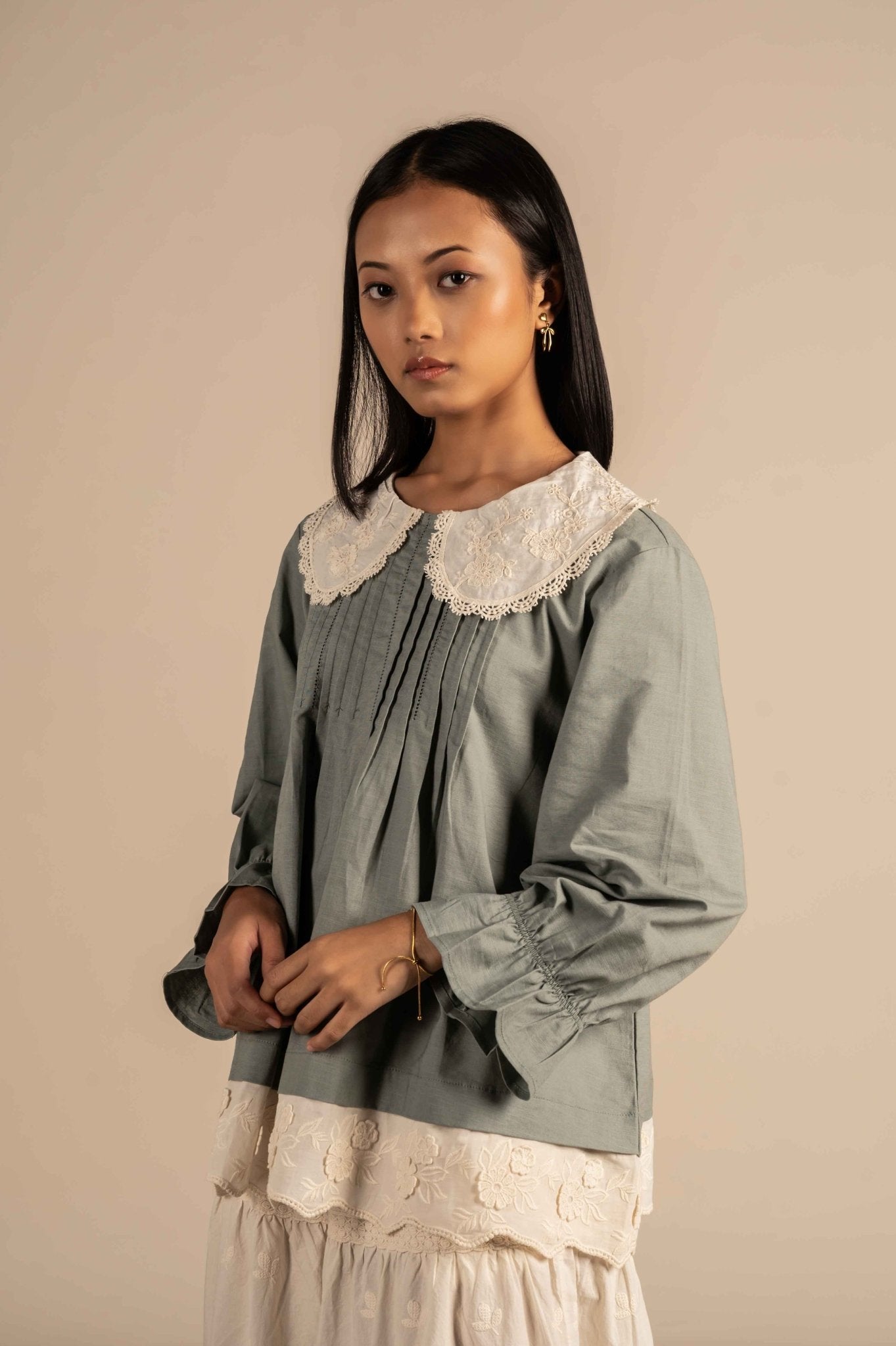 Delicate and charming full-sleeve Peter Pan top is adorned with intricate lace detailing for a soft, feminine look. Perfect for adding elegance to any outfit