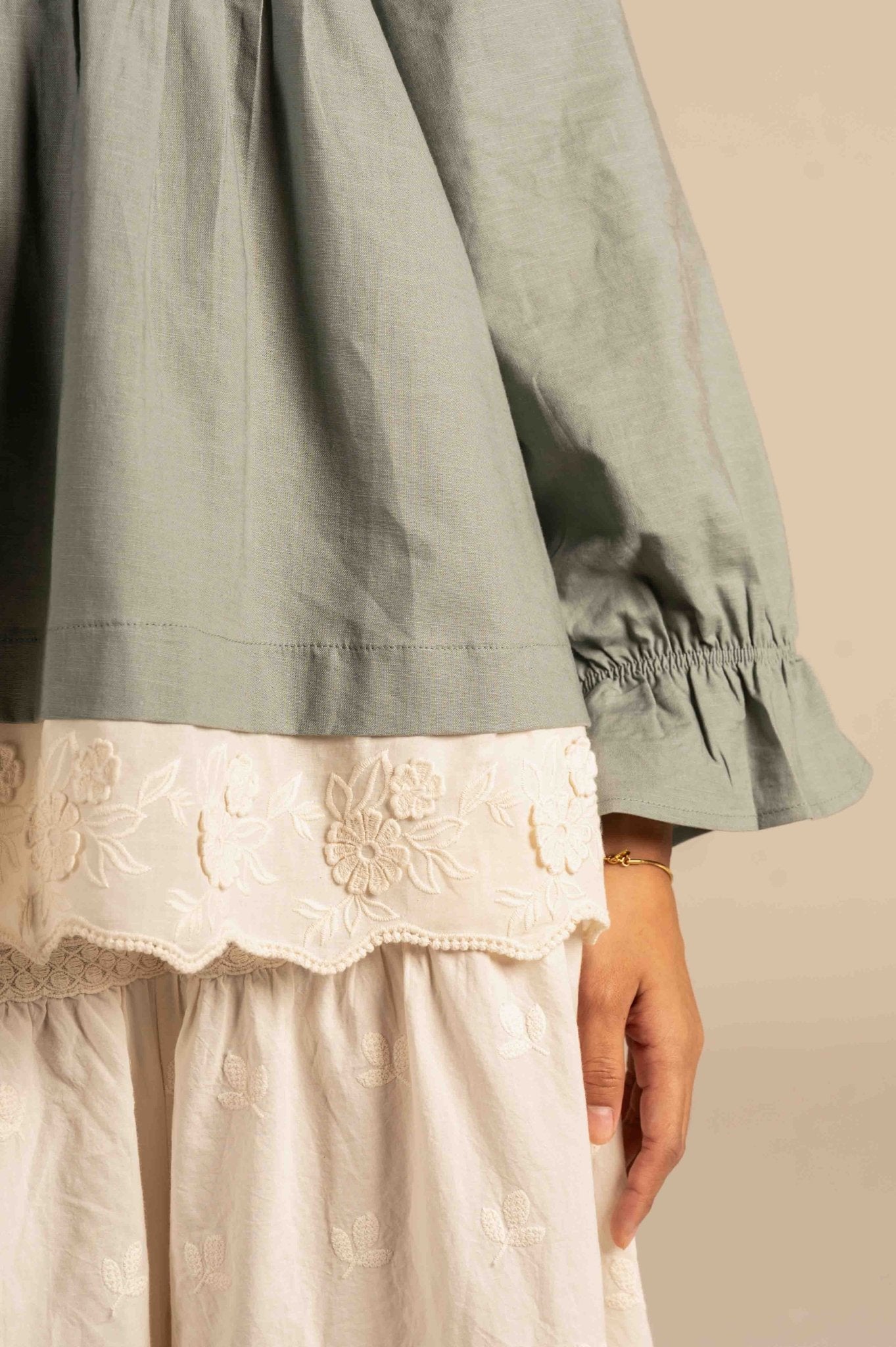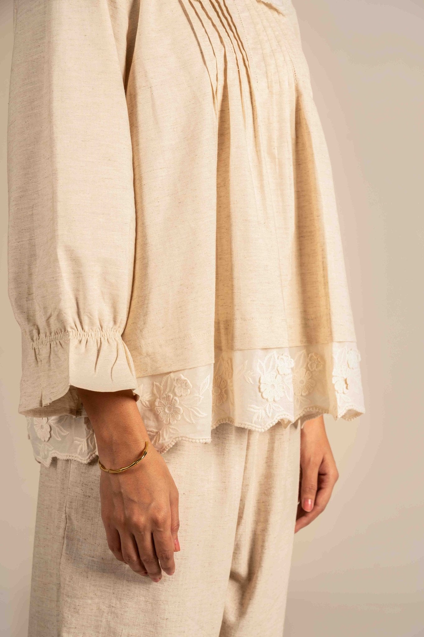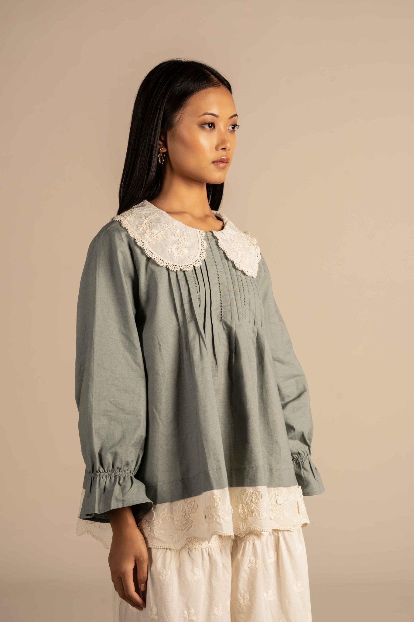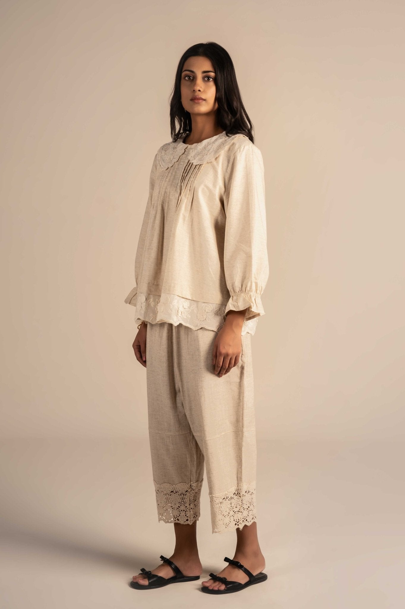 Delicate and charming full-sleeve Peter Pan top is adorned with intricate lace detailing for a soft, feminine look. Perfect for adding elegance to any outfit