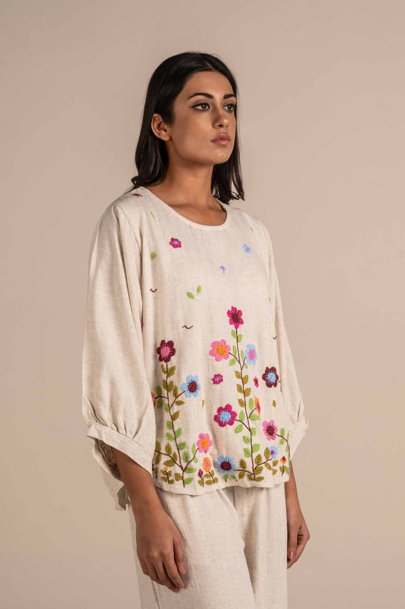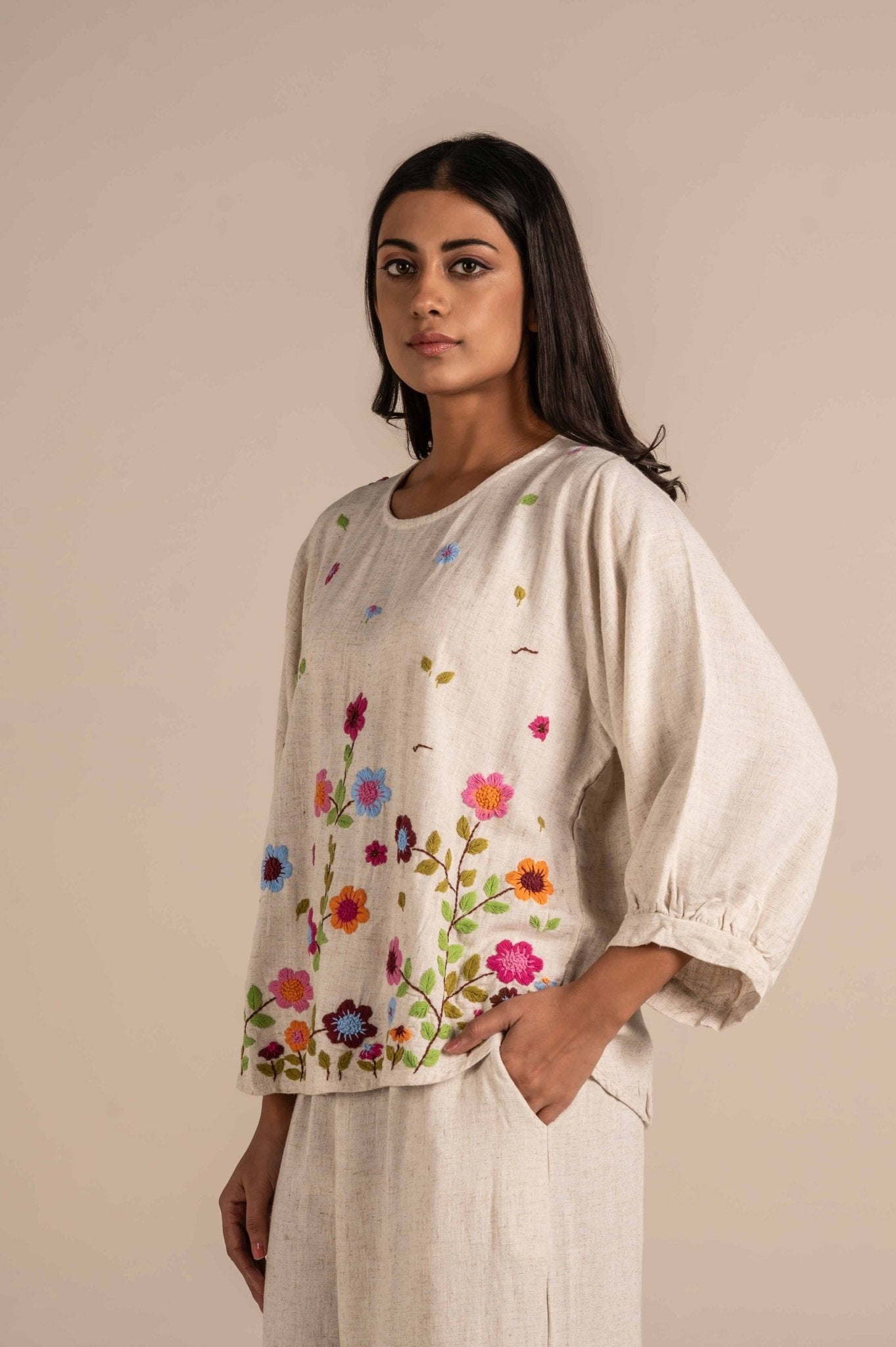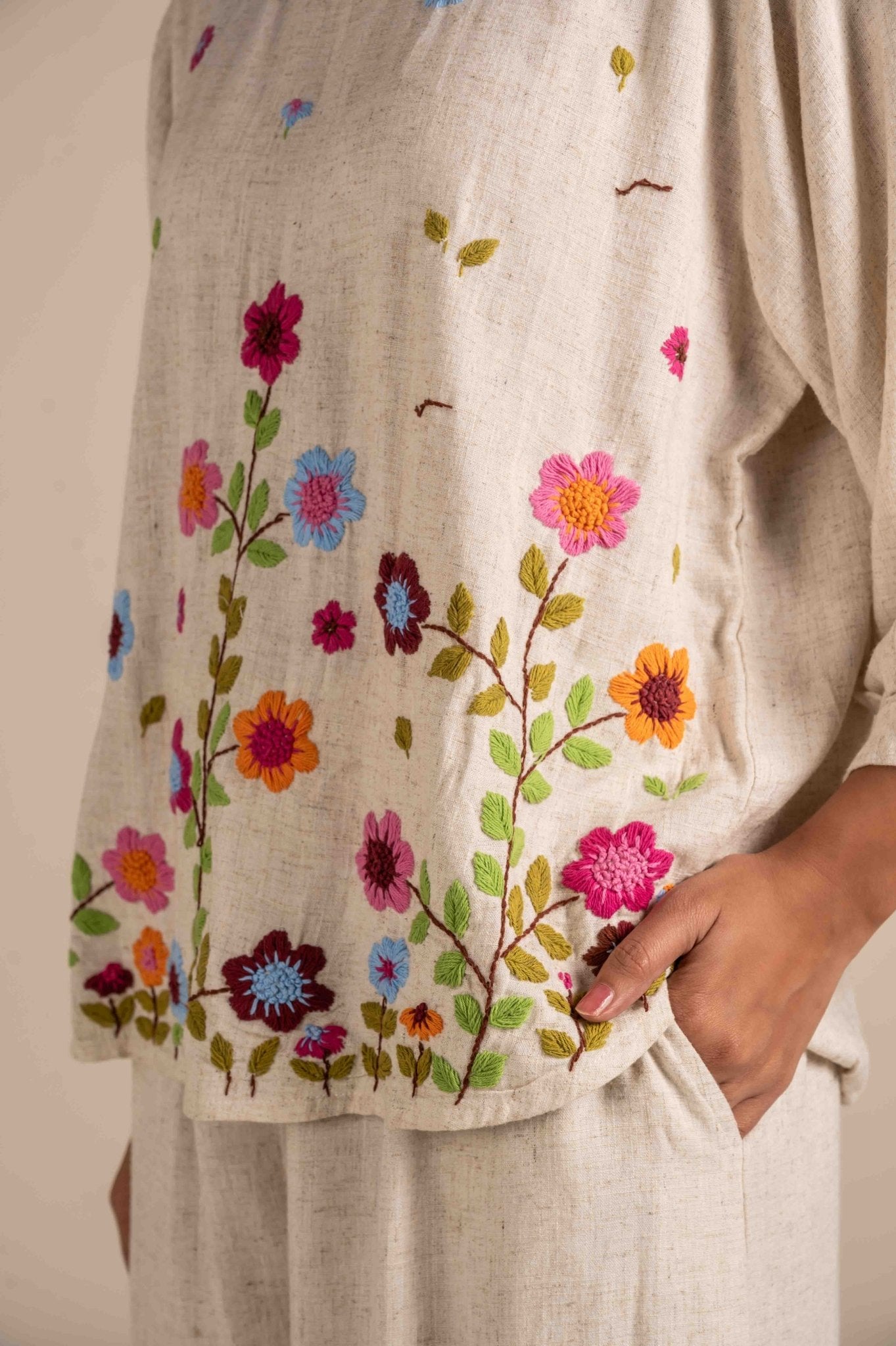 Breezy and breathable full-sleeve embroidered top featuring a relaxed fit, delicate floral hand embroidery, and available in a free size„perfect for casual days or graceful boho-chic styling. The design features clusters of flowers with green leaves, mainly along the bottom and subtly scattered upwards. Small petals and leaves give it a whimsical, meadow-like charm.