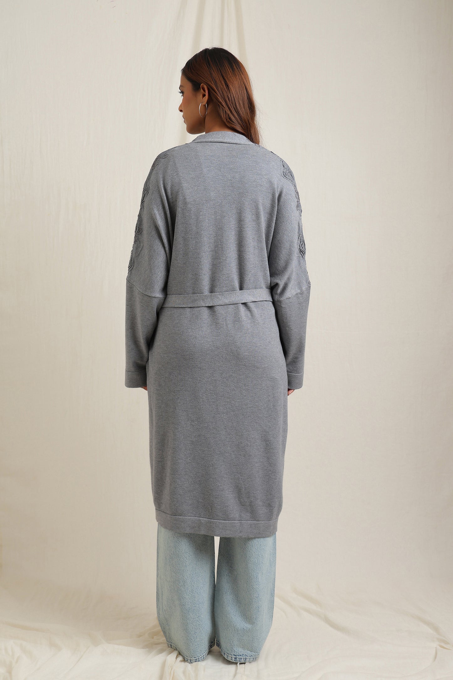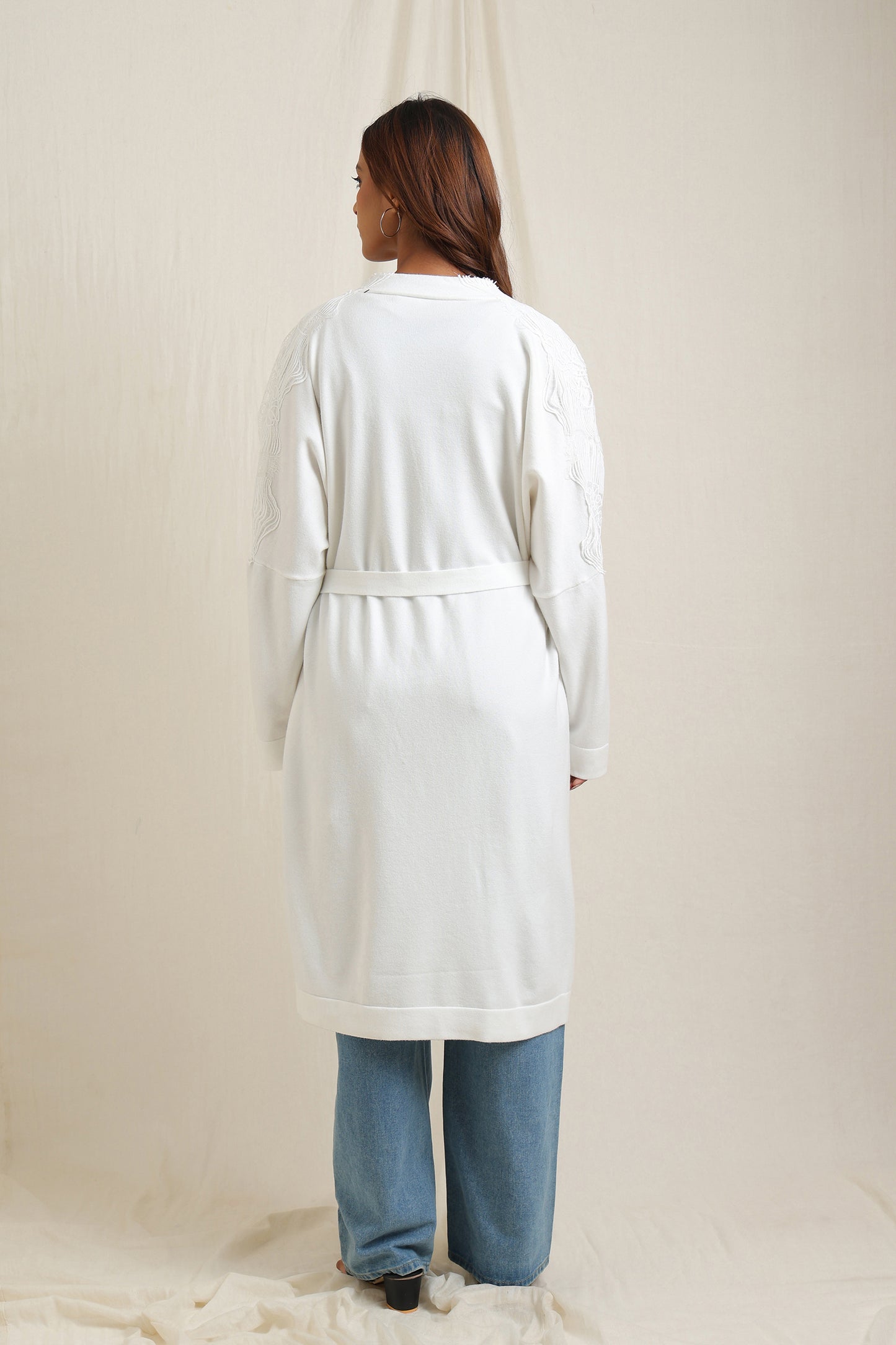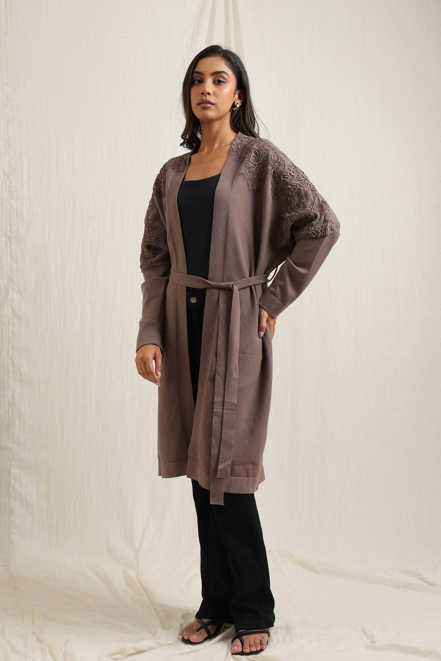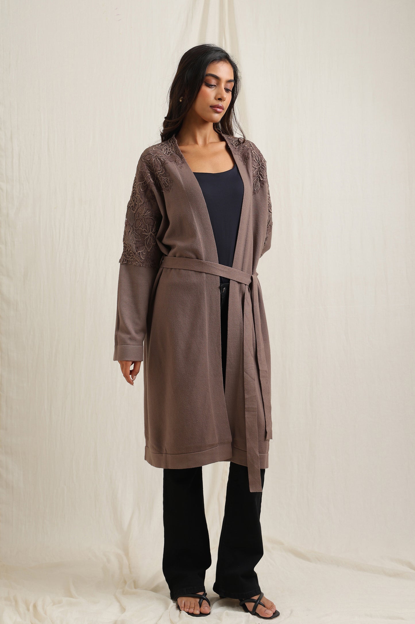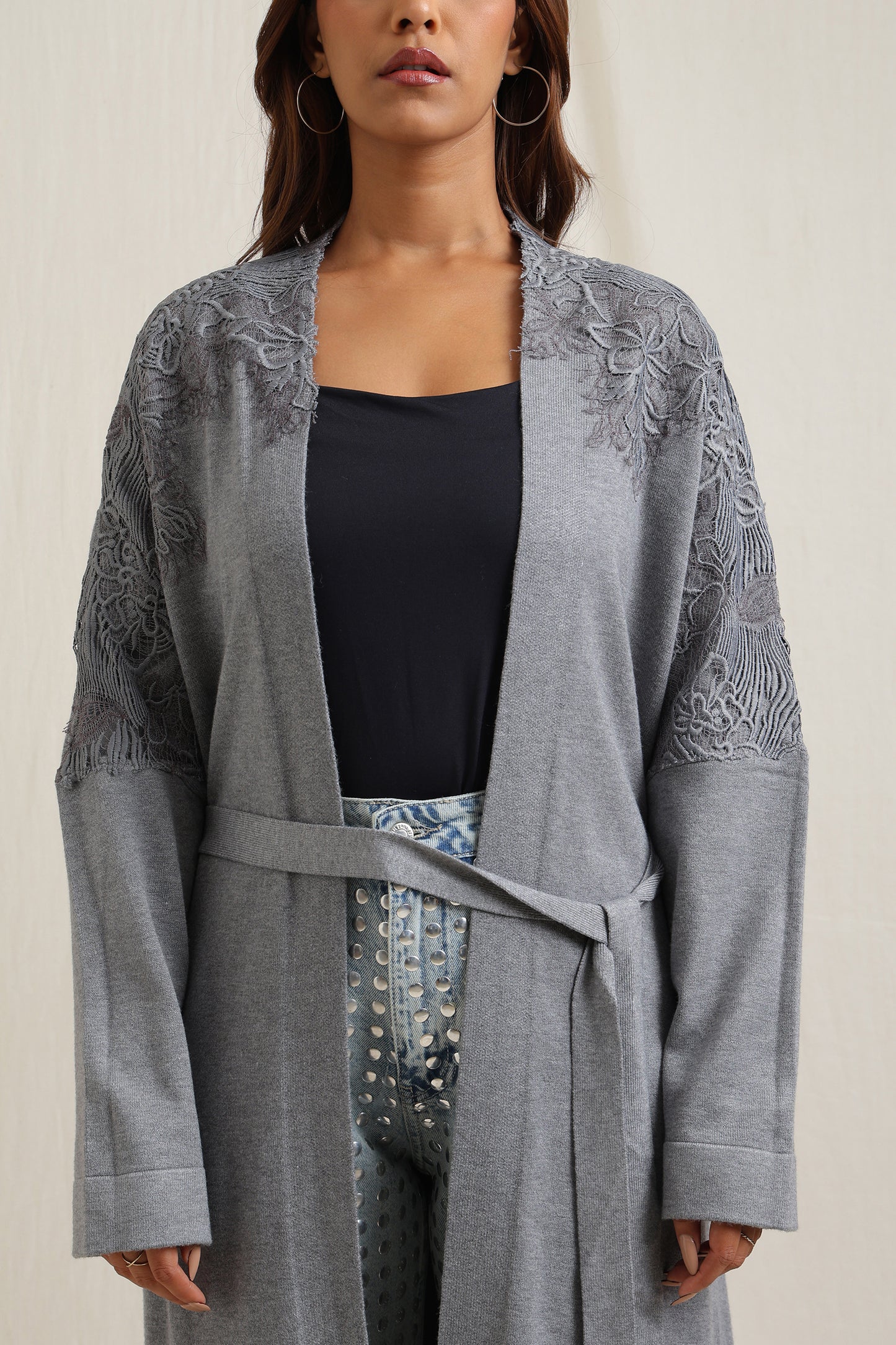 Regular price Rs. 8,750Elegant front open shrug with its lightweight knit and soft drape. Featuring intricate lace details along the sleeves and shoulders, it balances simplicity with sophistication. Perfect for layering, it transitions seamlessly from daywear to evening styling