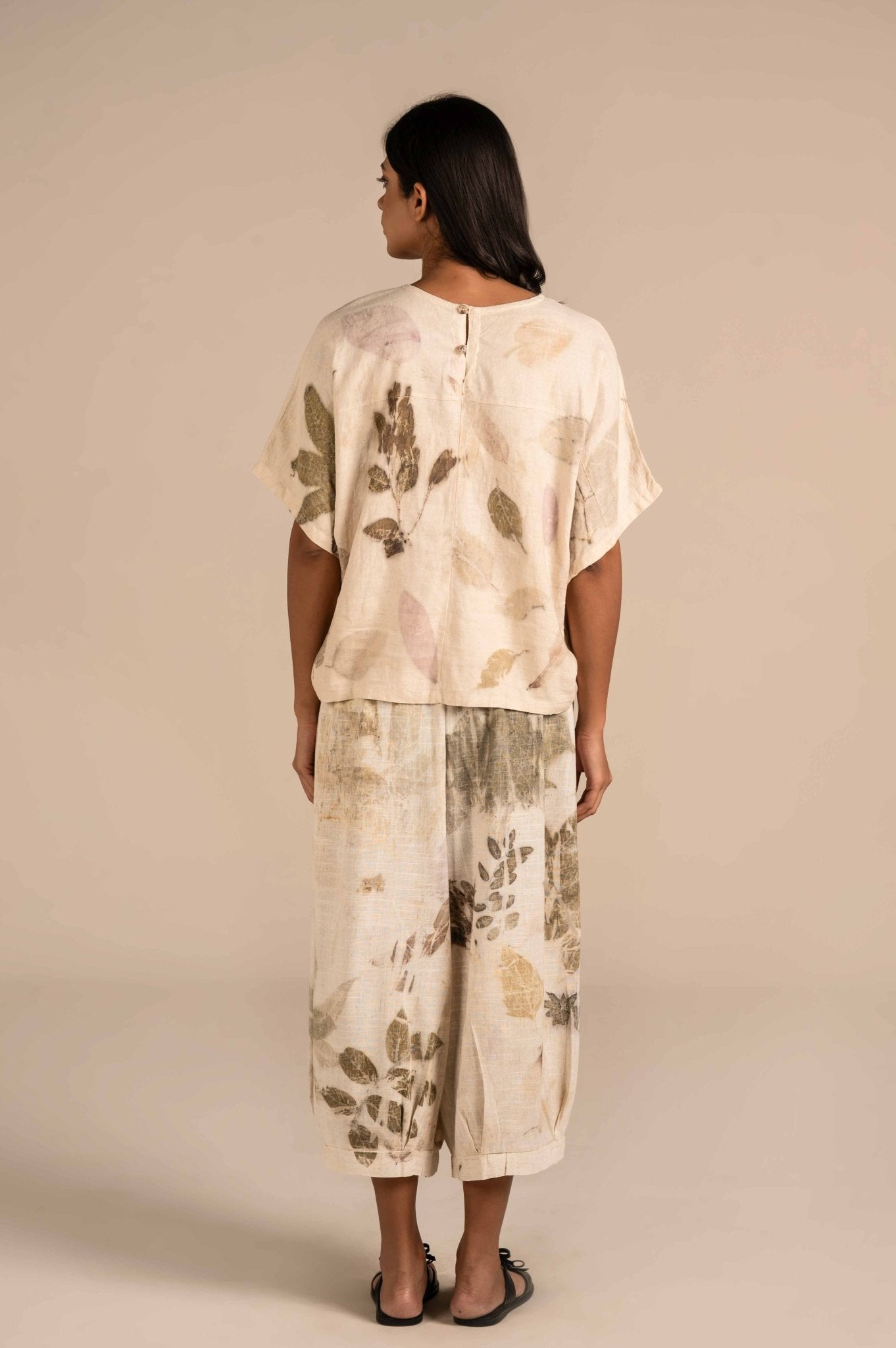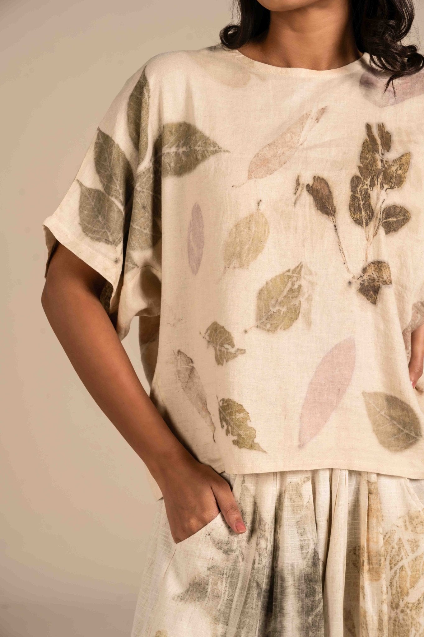 Half-sleeve linen top featuring a relaxed fit and distinctive hammered leaf texture„perfect for easy, breathable styling with a touch of natural elegance. The leaf imprints and natural foliage patterns reflect a nature inspired print in a serene and organic color palette with bohemian aesthetic.