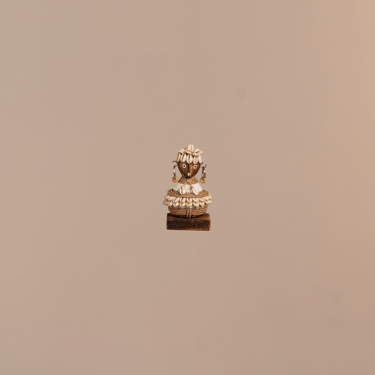 A beaded tribal-style figurine with shells and textured detailing. A striking cultural accent for shelves or consoles, in small size