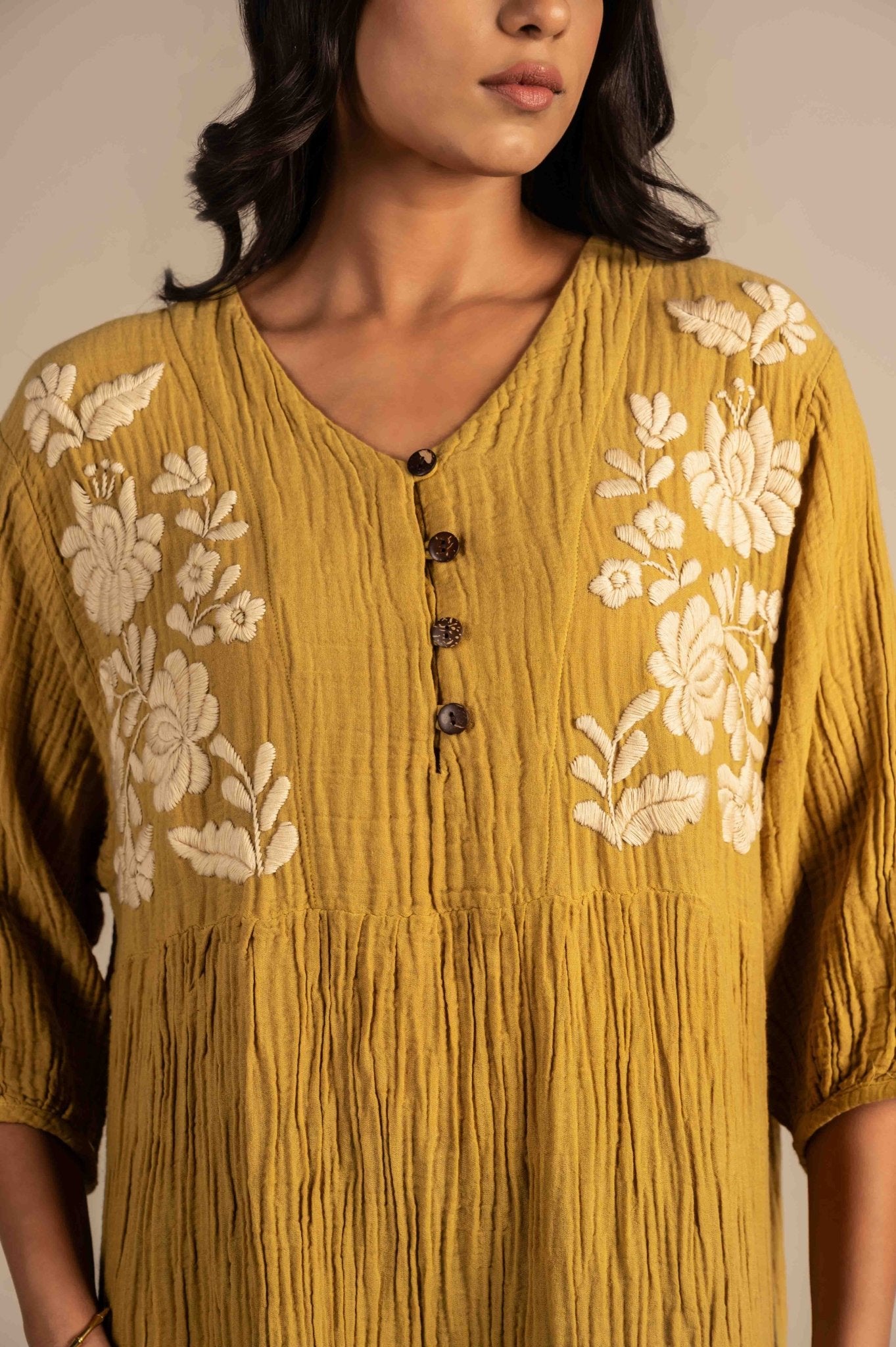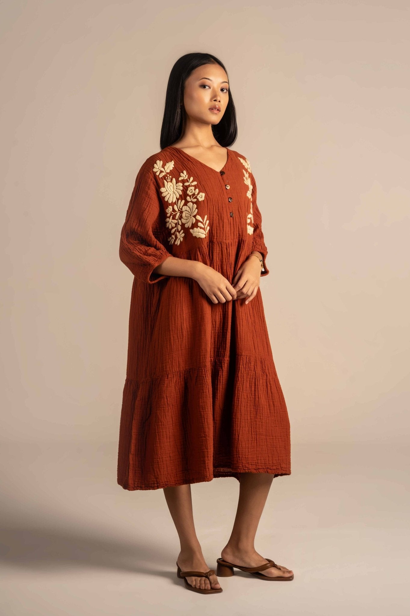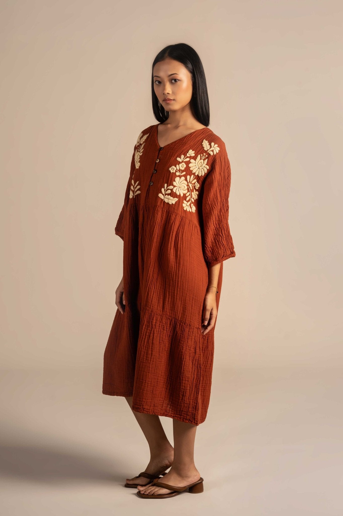 Relaxing buttoned dress features delicate white floral embroidery around the neckline, adding a touch of charm to its minimalist design. Made from breathable fabric with a relaxed fit, it's perfect for warm days, casual outings, or laid-back gatherings.The embroidery features finely detailed flowers, leaves, and stems, adding depth and elegance to the otherwise solid fabric.