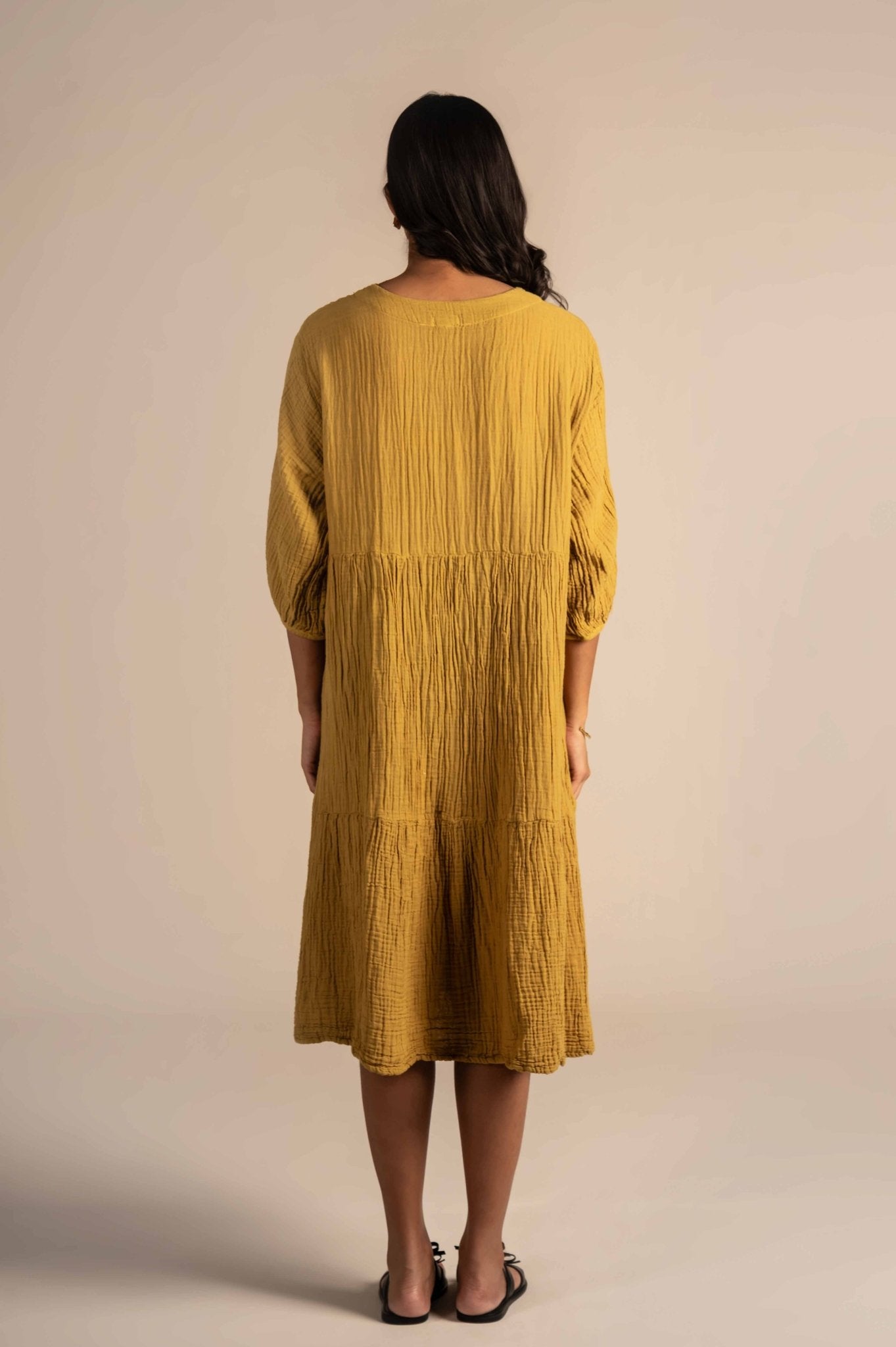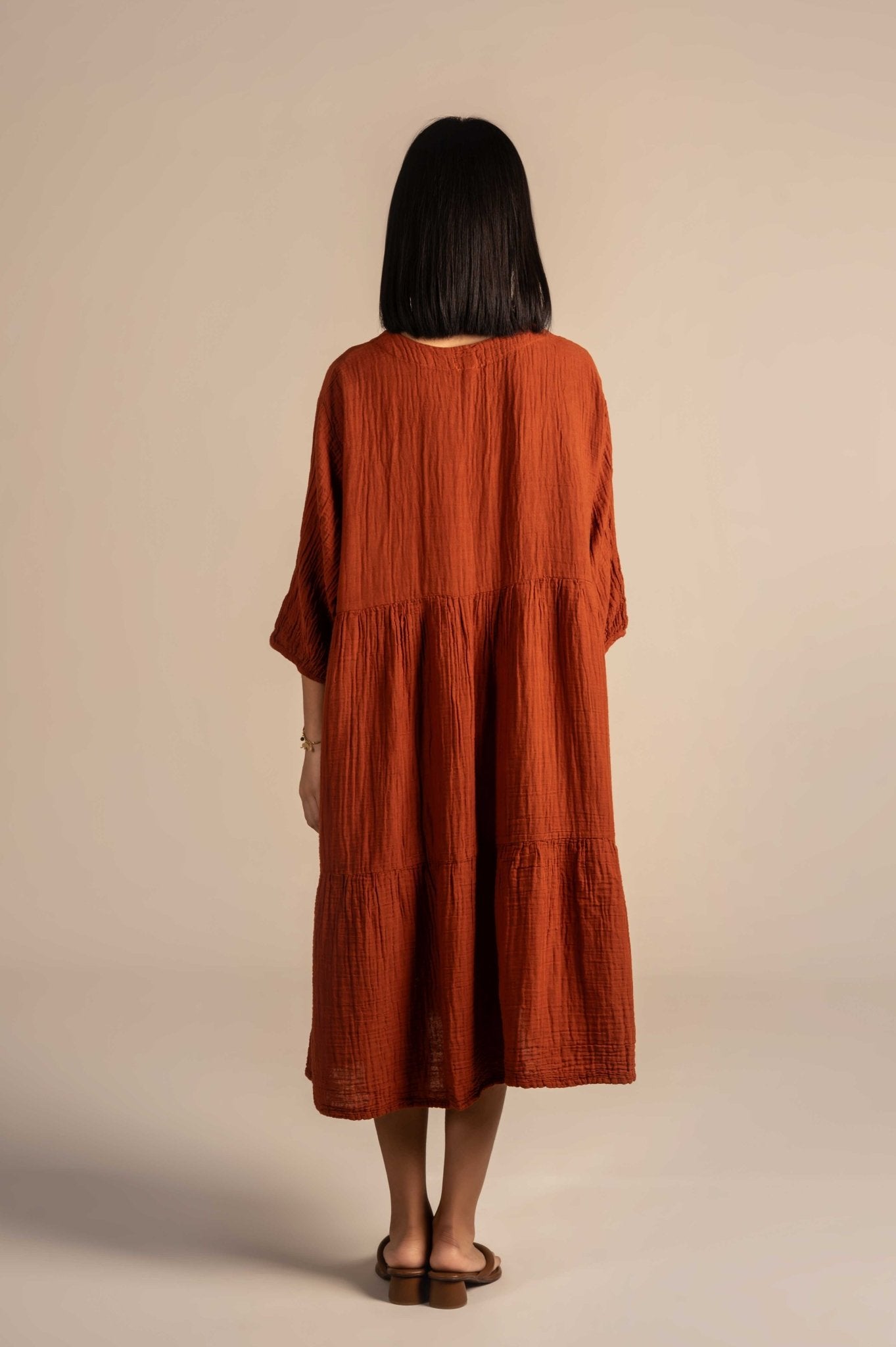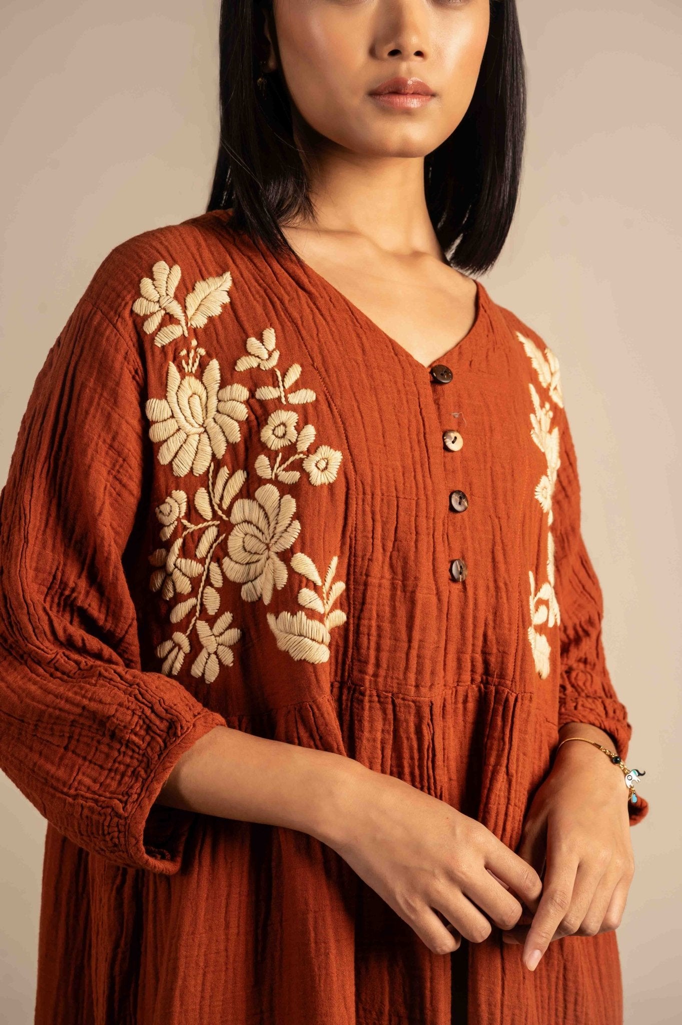 Relaxing buttoned dress features delicate white floral embroidery around the neckline, adding a touch of charm to its minimalist design. Made from breathable fabric with a relaxed fit, it's perfect for warm days, casual outings, or laid-back gatherings.The embroidery features finely detailed flowers, leaves, and stems, adding depth and elegance to the otherwise solid fabric.