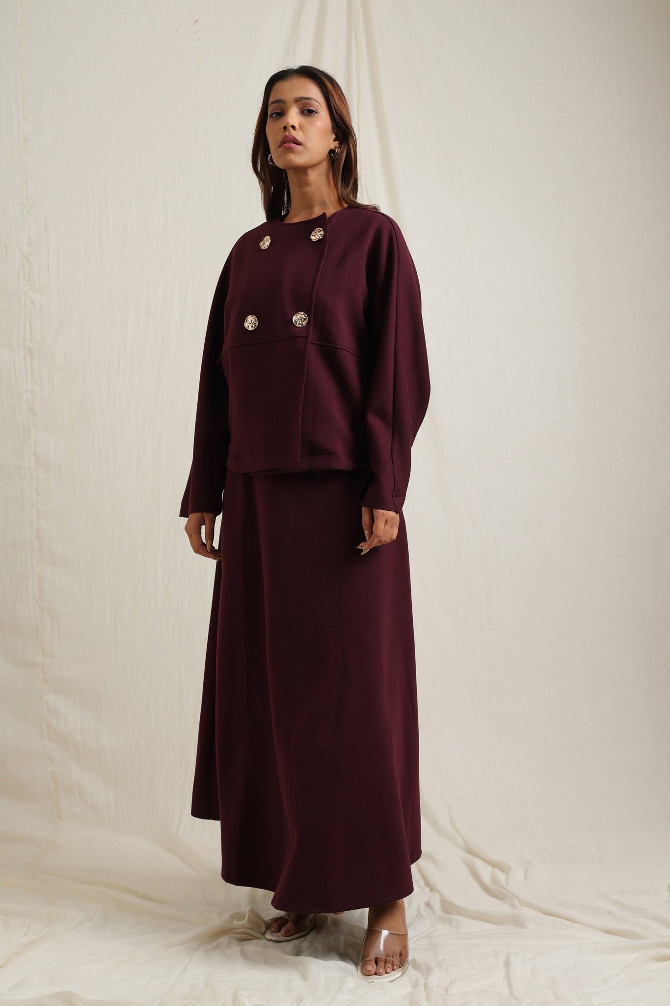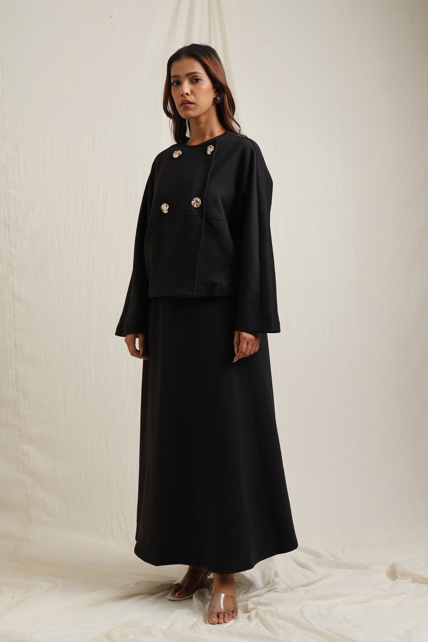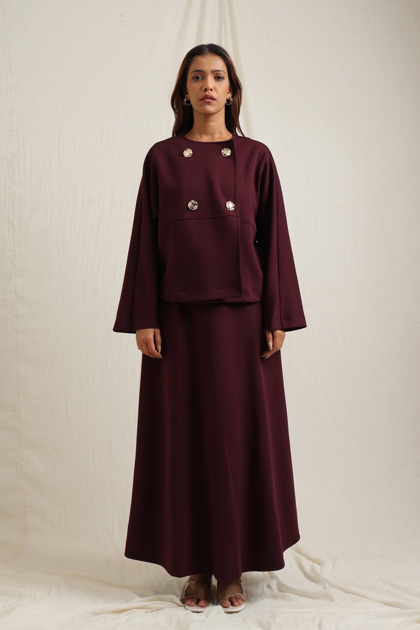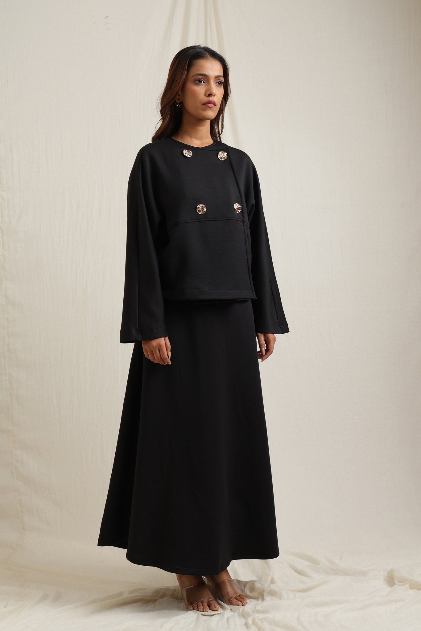 Regular price Rs. 7,350Batwing sleeve skirt set detailed with striking gold buttons for a touch of elegance.